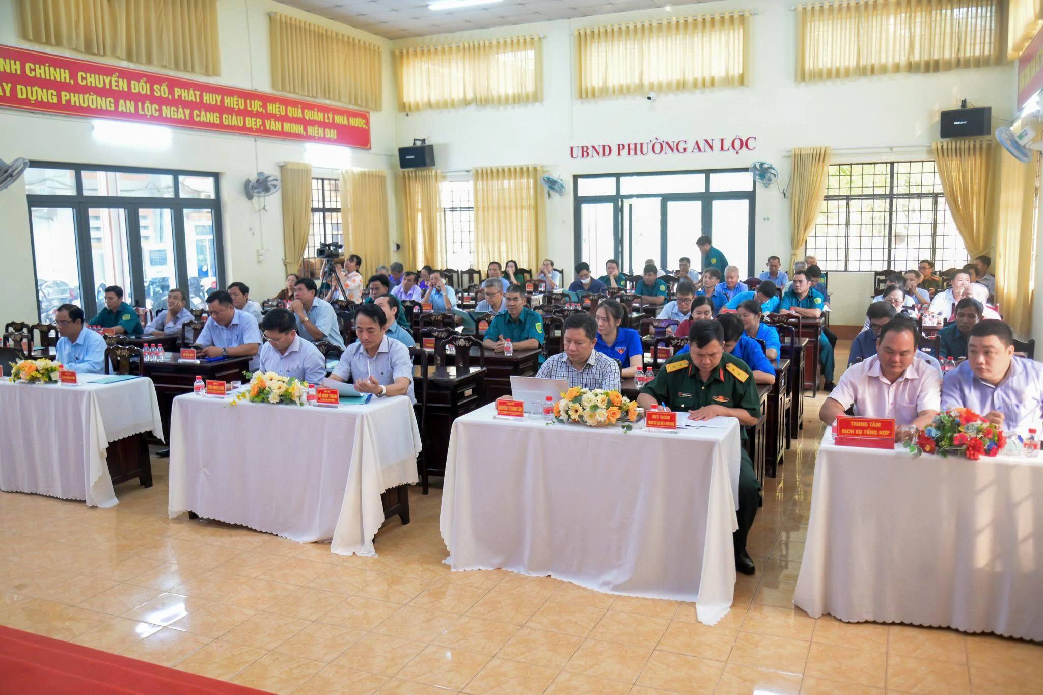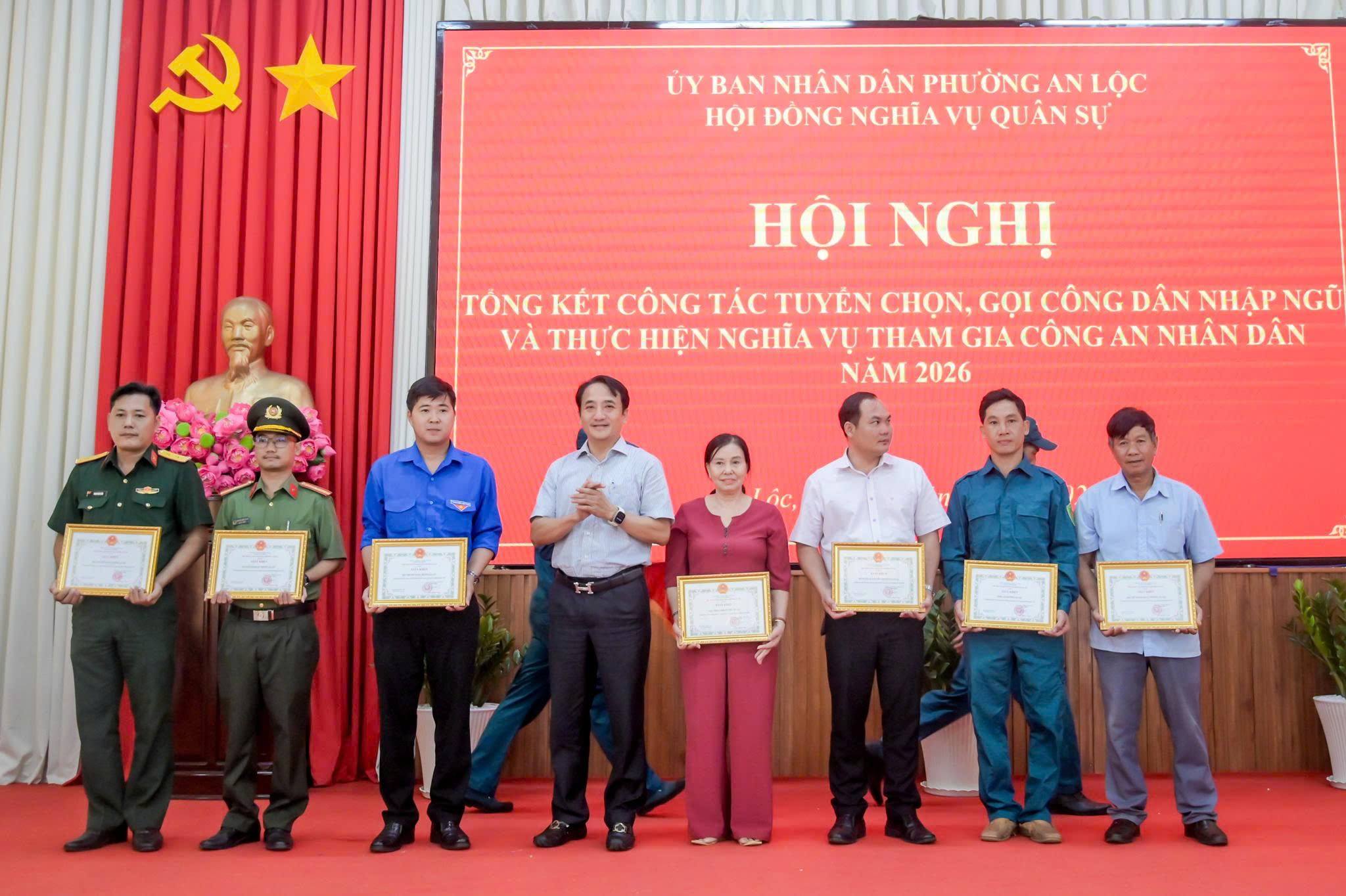 Ngày 14/4, Hội đồng Nghĩa vụ quân sự phường An Lộc tổ chức Hội nghị tổng kết công tác tuyển chọn, gọi công dân nhập ngũ năm 2026. Tham dự hội nghị có đồng chí Đỗ Minh Trung - Bí thư Đảng ủy, Chủ tịch HĐND phường; đồng chí Trần Thanh Long - Phó Bí thư Đảng ủy, Chủ tịch UBND phường, Chủ tịch Hội đồng Nghĩa vụ quân sự phường; Trung tá Phùng Văn Quang - đại diện Ban Chỉ huy Phòng thủ khu vực 4 cùng đại diện lãnh đạo Ban Chỉ huy Quân sự phường, các ban ngành, đoàn thể và đại diện các khu phố.