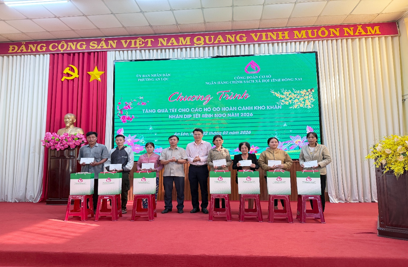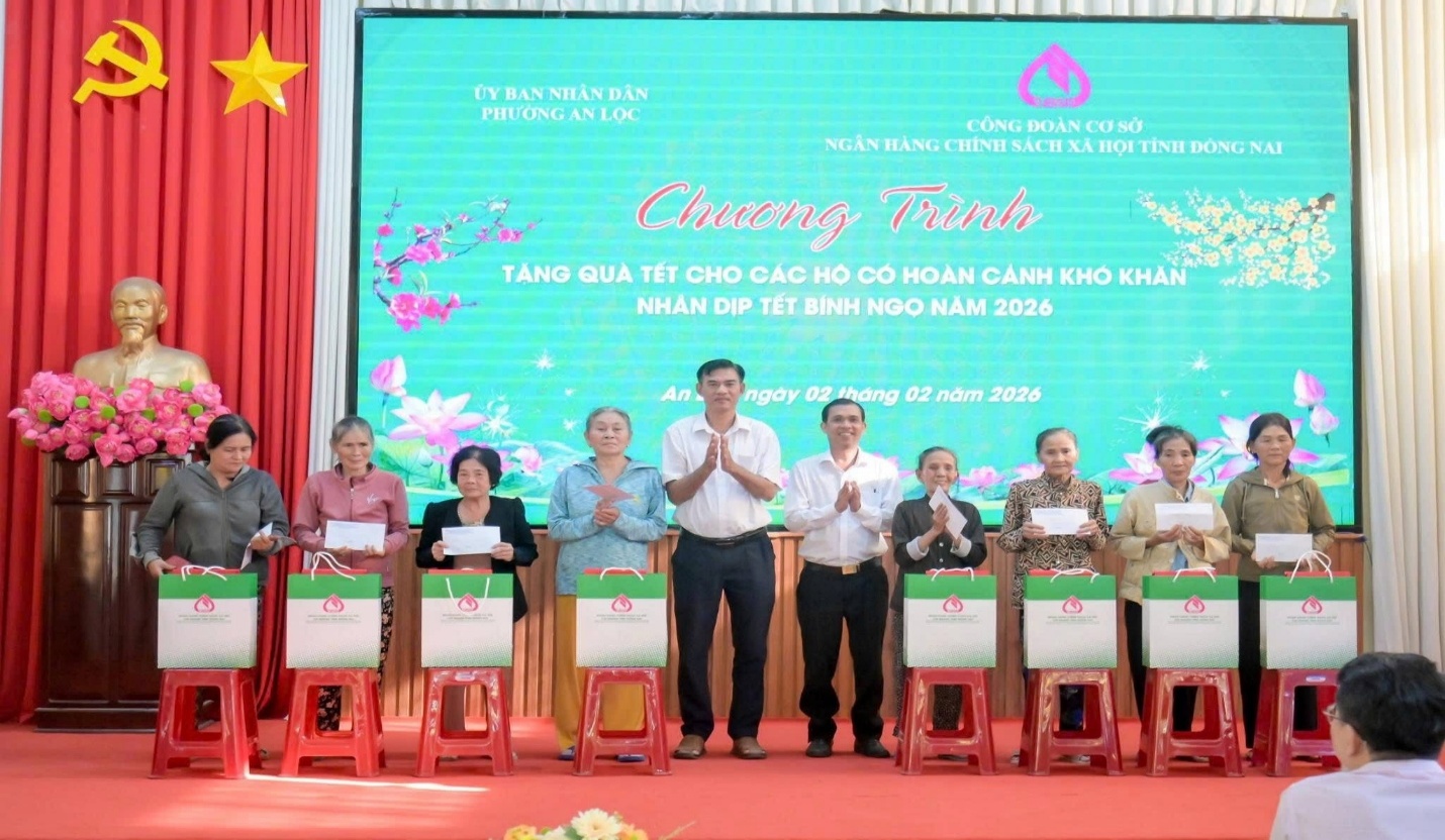 Ngày 02/02/2026, UBND phường An Lộc phối hợp với Phòng giao dịch NHCSXH Bình Long tổ chức chương trình trao quà Tết của Công đoàn cơ sở Ngân hàng Chính sách xã hội tỉnh Đồng Nai cho các hộ gia đình có hoàn cảnh khó khăn trên địa bàn phường nhân dịp Tết Nguyên đán Bính Ngọ năm 2026.