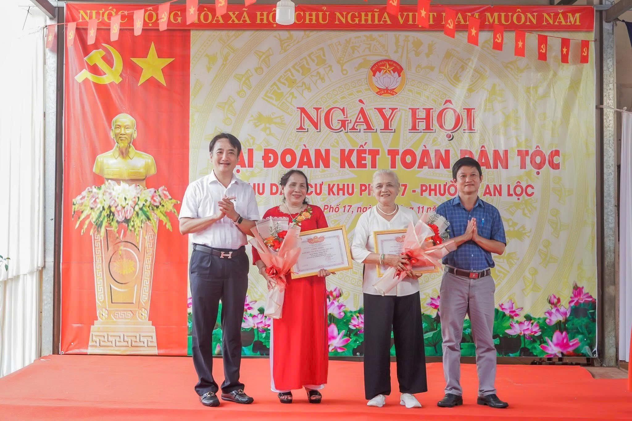 Cũng trong khuôn khổ Ngày hội, phường An Lộc đã trao bảng tượng trưng Khu dân cư văn hóa tiêu biểu cho khu phố 17; 02 hộ gia đình và 03 cá nhân được tặng Giấy khen của tỉnh Đồng Nai; trao danh hiệu Khu dân cư văn hóa tiêu biểu phường An Lộc năm 2025, 02 hộ gia đình tiêu biểu và 02 hộ gia đình có hoàn cảnh khó khăn. Ban Tổ chức cũng đã trao giải thưởng cho các đội tham gia các trò chơi dân gian như truyền nước bằng ly nhựa, “truyền áo đồng đội”, kéo co và nhảy sạp, tạo không khí sôi nổi, gắn kết cộng đồng. Dịp này, đồng chí Đỗ Minh Trung đã cùng tập thể lãnh đạo phường trồng tặng cây lưu niệm tại khu phố 17, thể hiện tinh thần gắn bó, trách nhiệm và cùng chung tay xây dựng khu dân cư xanh - sạch - đẹp.