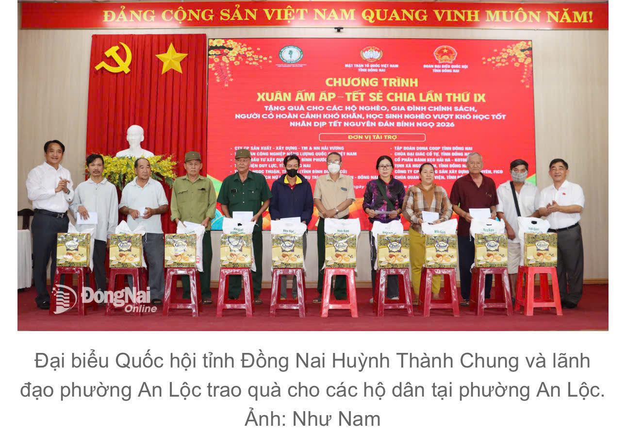 Ngày 2/2, Đoàn Đại biểu Quốc hội do ông Huỳnh Thành Chung làm trưởng đoàn đã tổ chức chương trình trao quà cho các hộ cận nghèo, hộ có hoàn cảnh khó khăn trên địa bàn phường An Lộc.