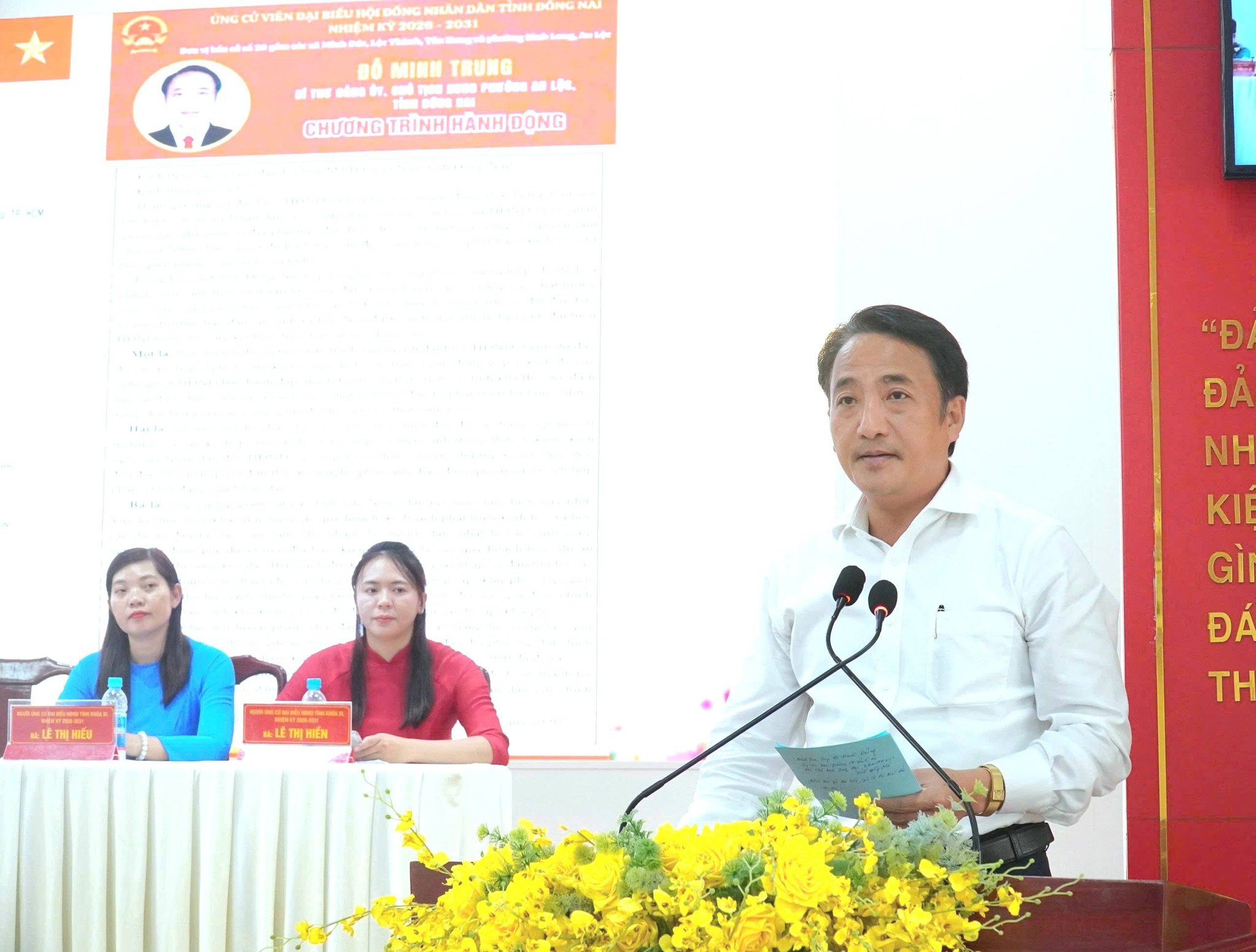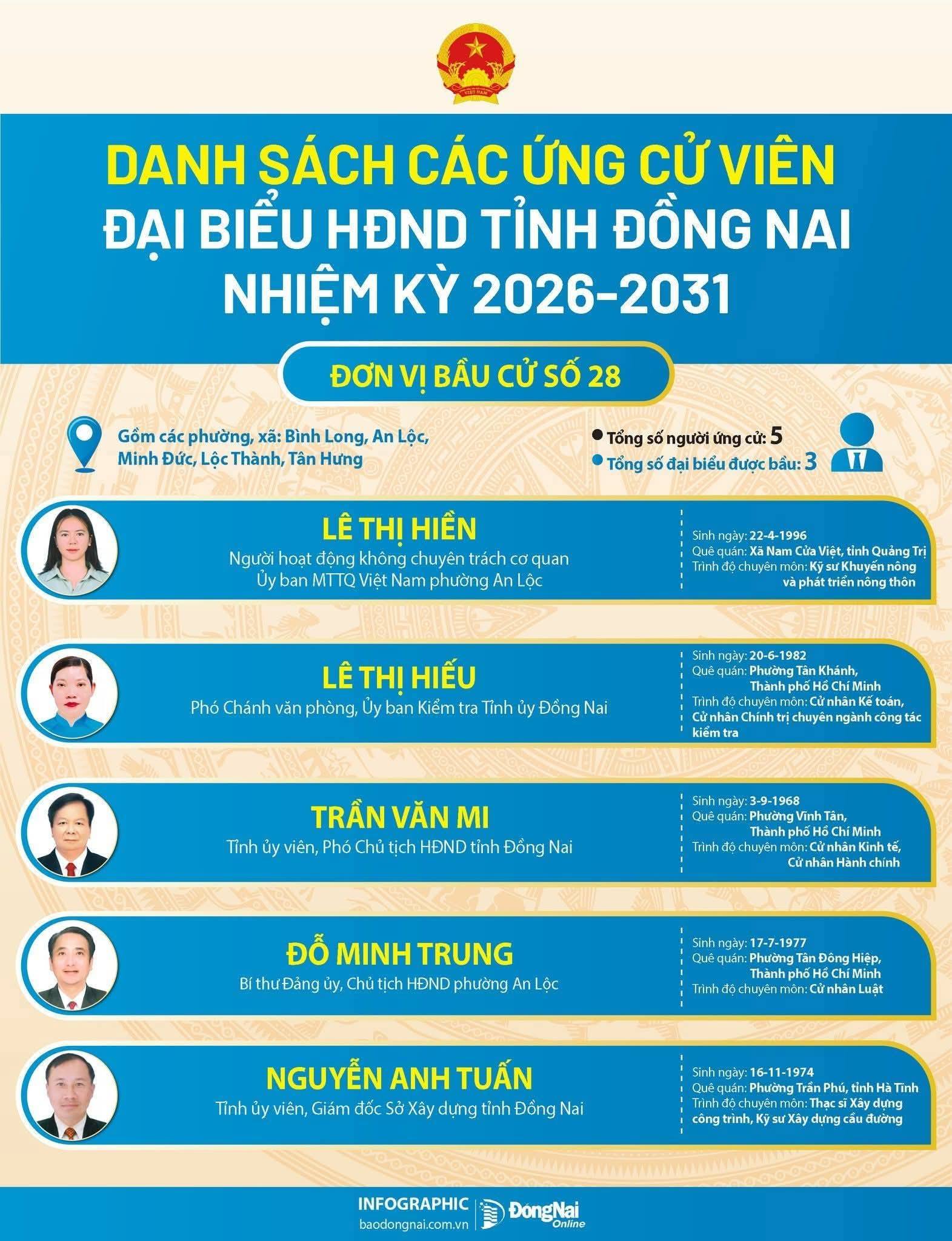 Ngoài đồng chí Đỗ Minh Trung - Bí thư Đảng ủy, Chủ tịch HĐND phường An Lộc, hiện đang công tác tại phường An Lộc còn có đồng chí Lê Thị Hiền - Người hoạt động không chuyên trách cơ quan Ủy ban MTTQ Việt Nam phường An Lộc tham gia ứng cử đại biểu HĐND tỉnh Đồng Nai nhiệm kỳ 2026 - 2031. Buổi tiếp xúc cử tri được tổ chức đúng quy định, tạo điều kiện để cử tri trực tiếp gặp gỡ, tìm hiểu chương trình hành động của các ứng cử viên trước khi tham gia bỏ phiếu trong ngày bầu cử 15/3 sắp tới.