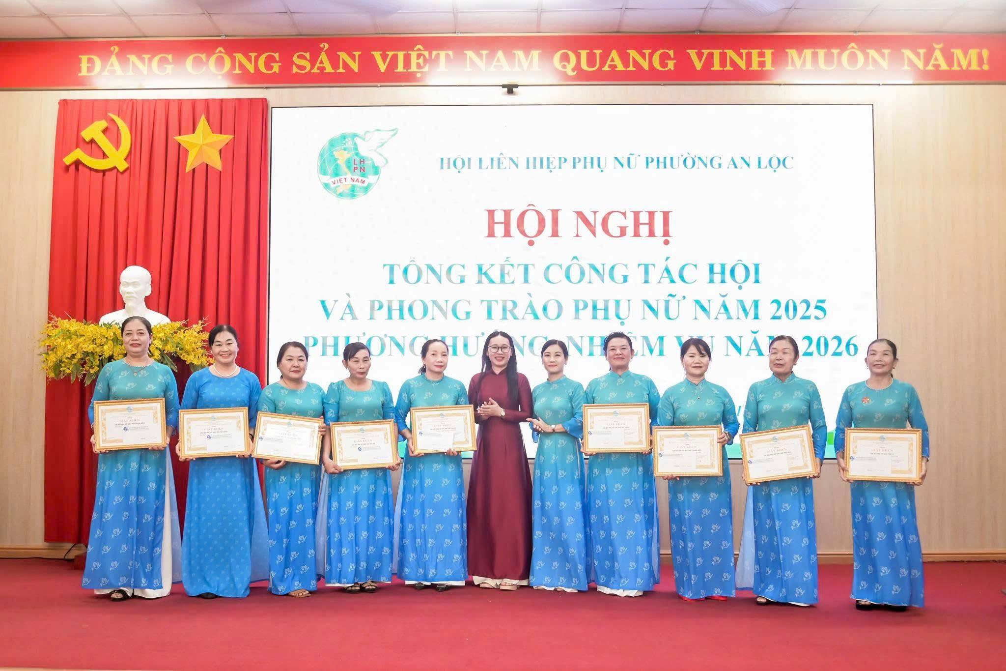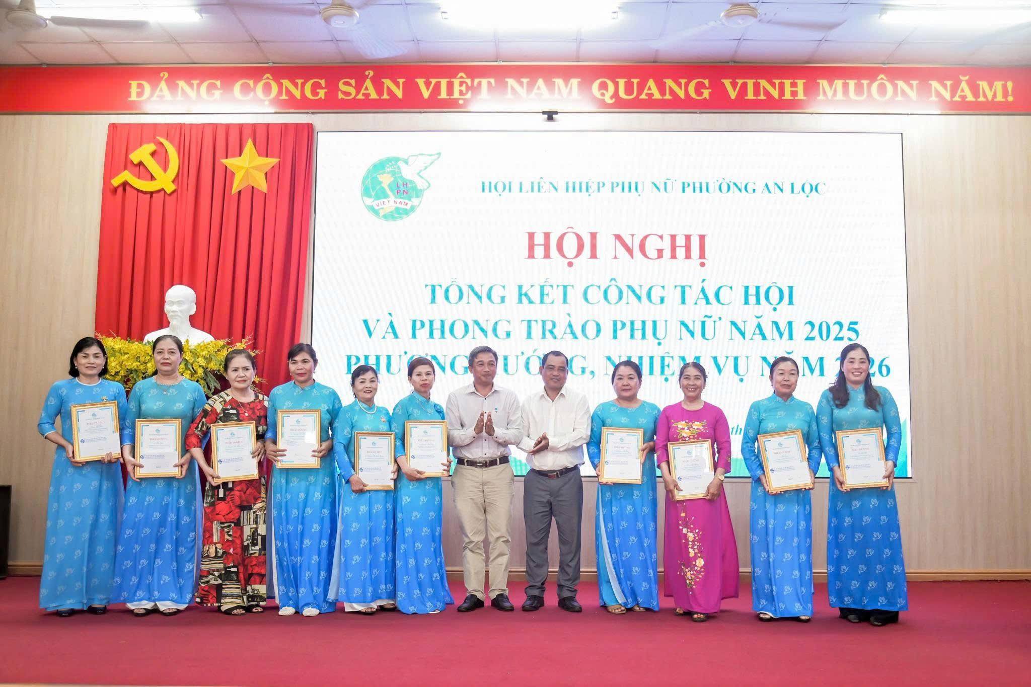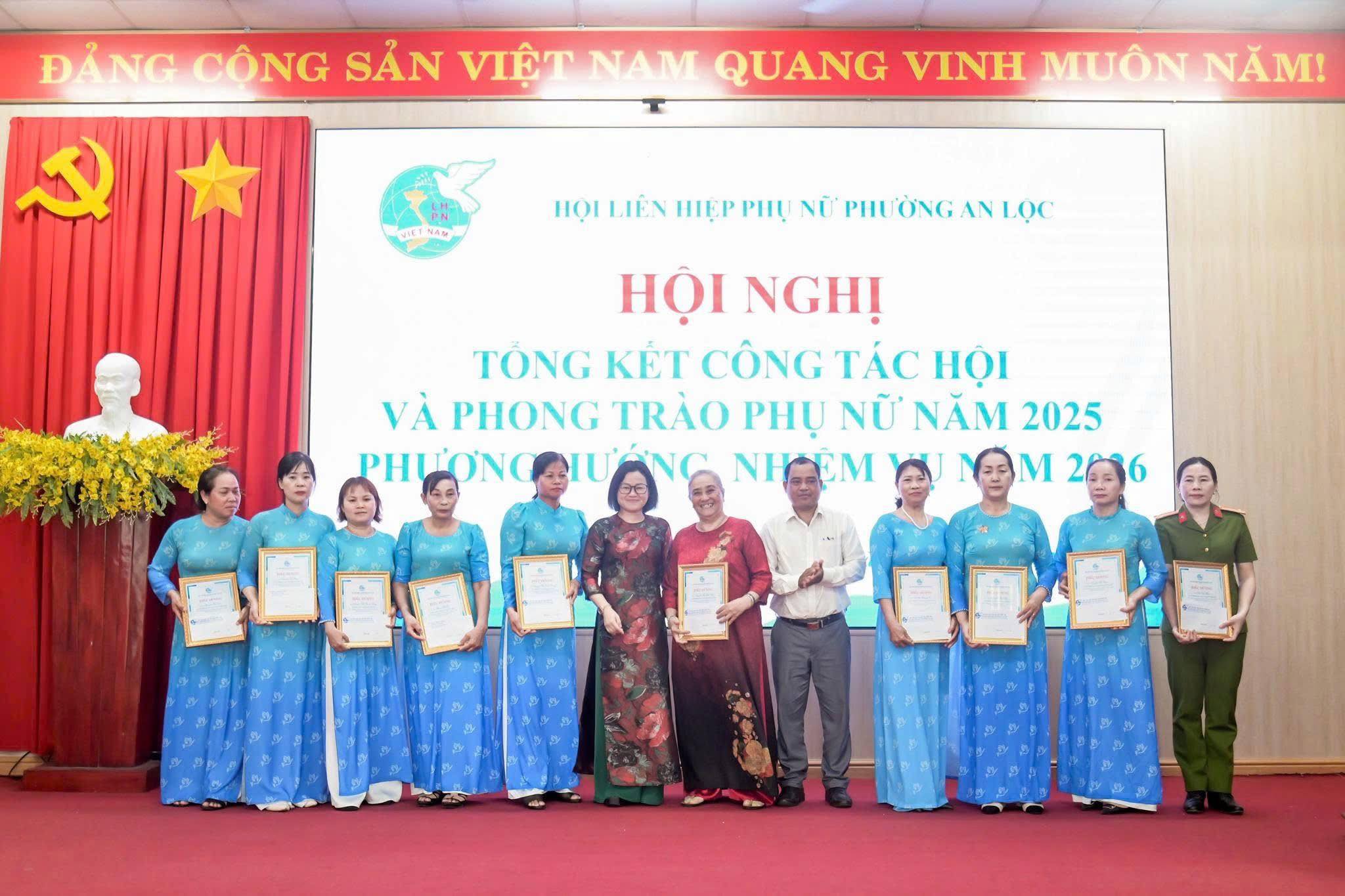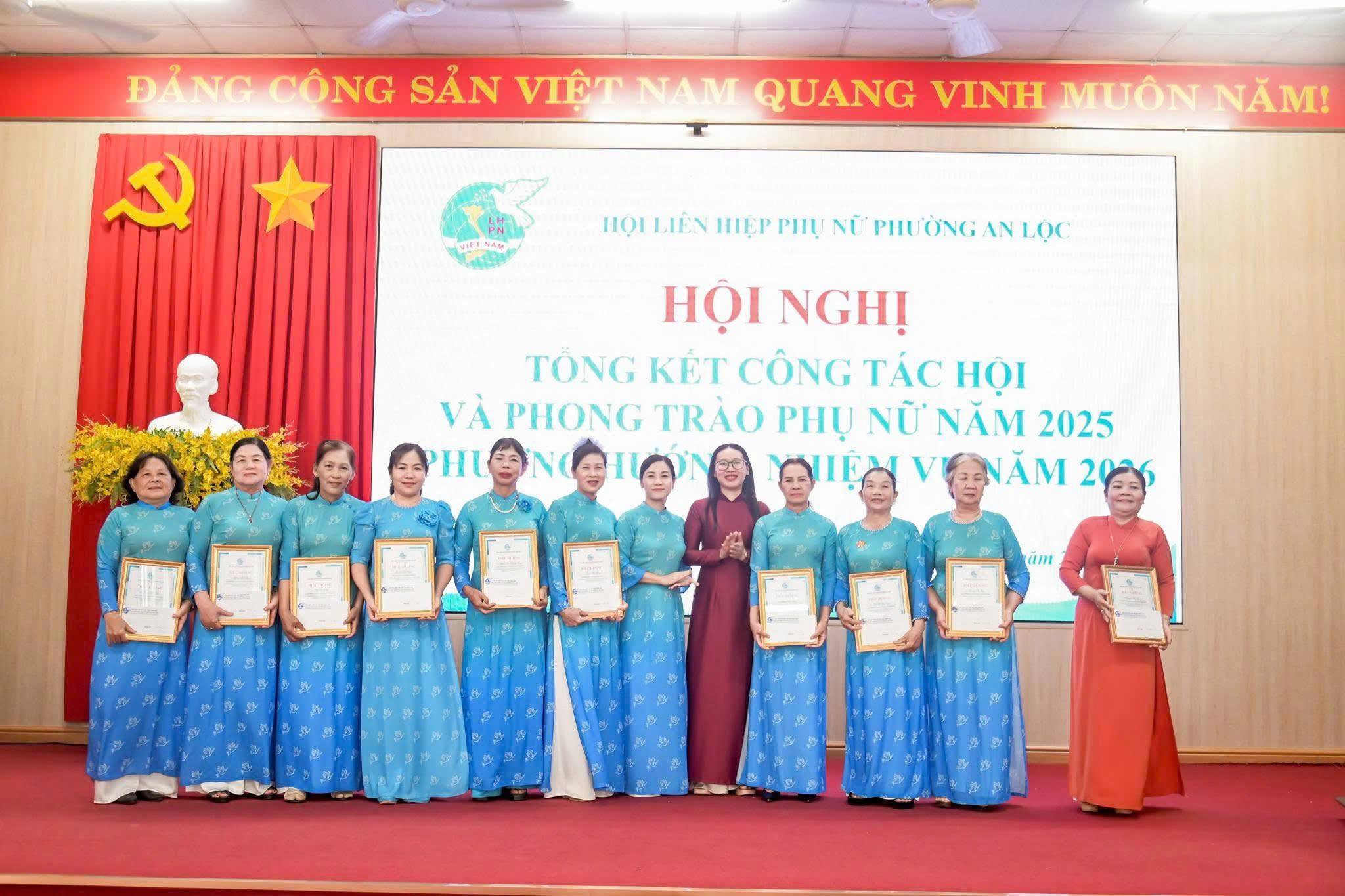 Dịp này, Hội LHPN phường An Lộc đã trao bảng tượng trưng số tiền 12 triệu đồng hỗ trợ nguồn vốn khởi sự kinh doanh cho hội viên phụ nữ; Công ty Quảng cáo Sự kiện Nguyễn Anh trao 6 triệu đồng hỗ trợ phụ nữ có hoàn cảnh khó khăn trên địa bàn. Hội nghị cũng trao Bằng khen của Hội LHPN tỉnh Đồng Nai cho 2 cá nhân có thành tích xuất sắc; UBND phường An Lộc khen thưởng 10 tập thể và 31 cá nhân tiêu biểu trong công tác Hội và phong trào phụ nữ năm 2025; tổ chức ký kết giao ước thi đua thực hiện nhiệm vụ năm 2026.