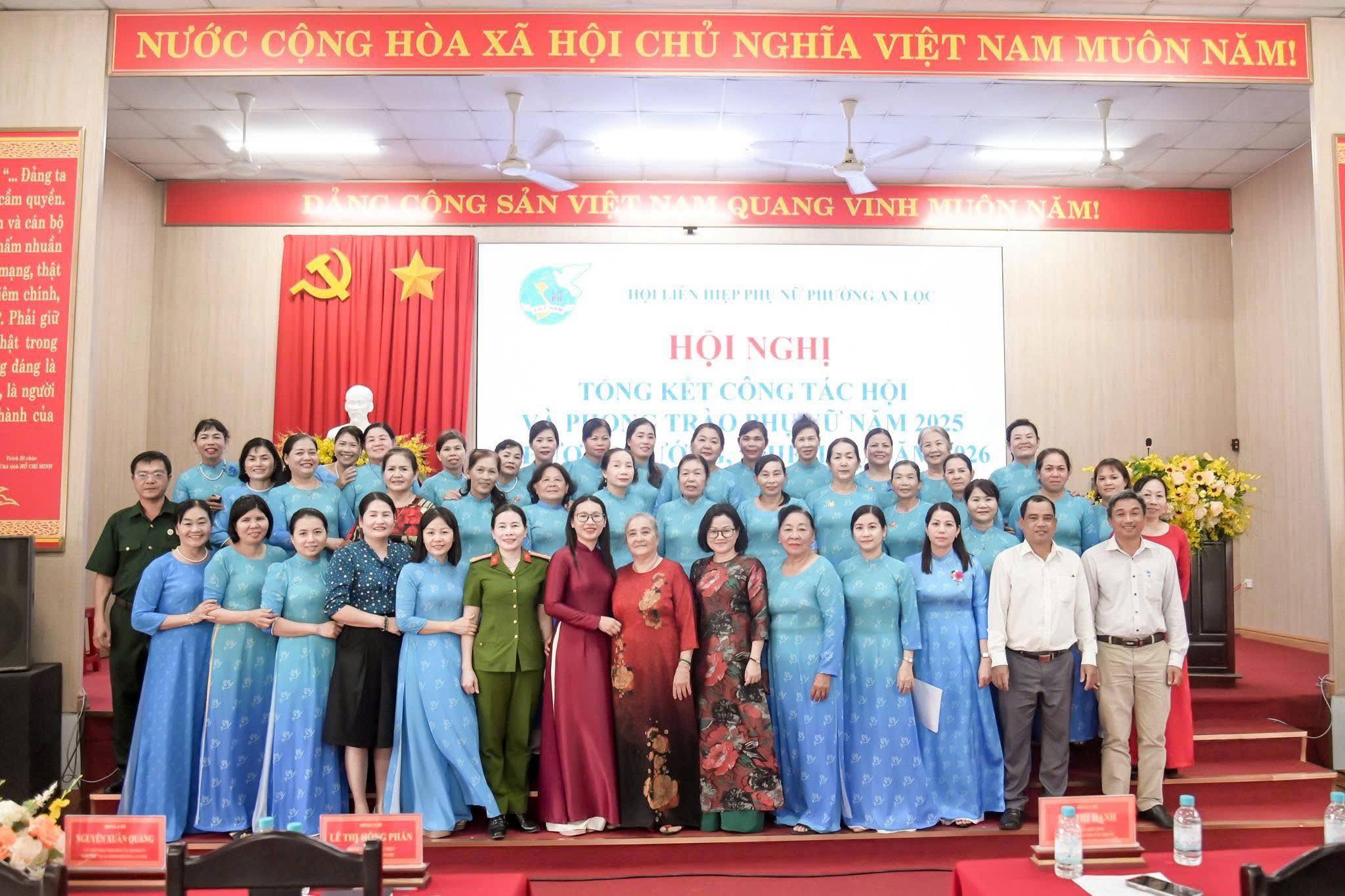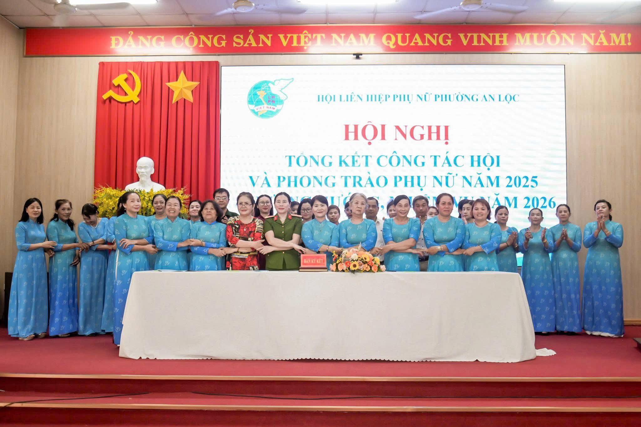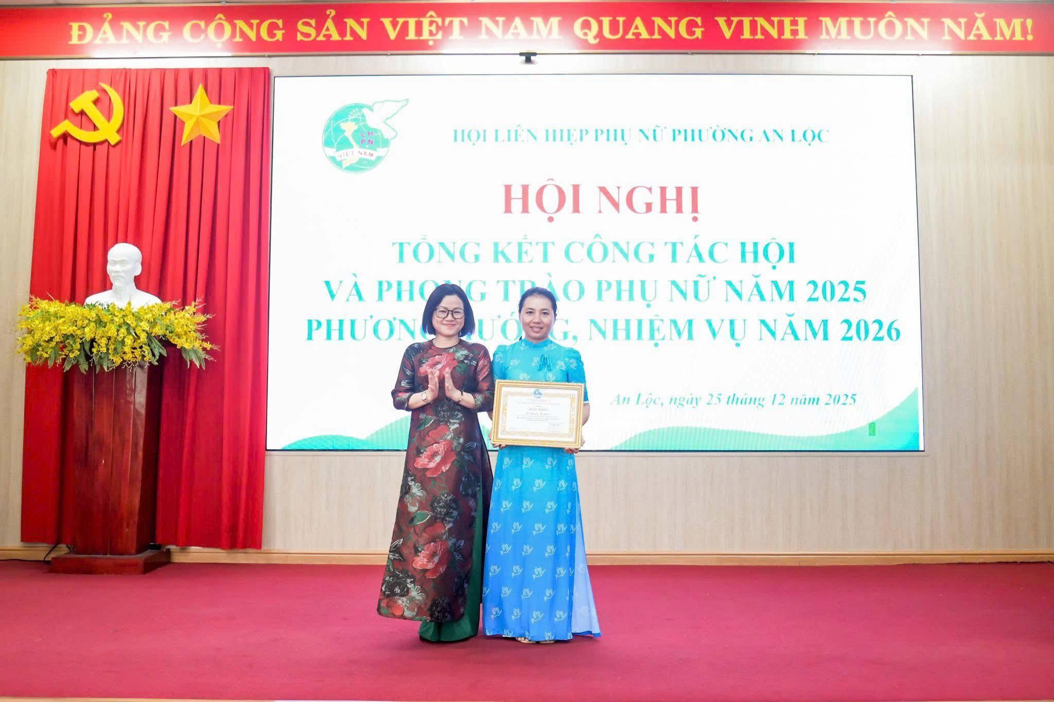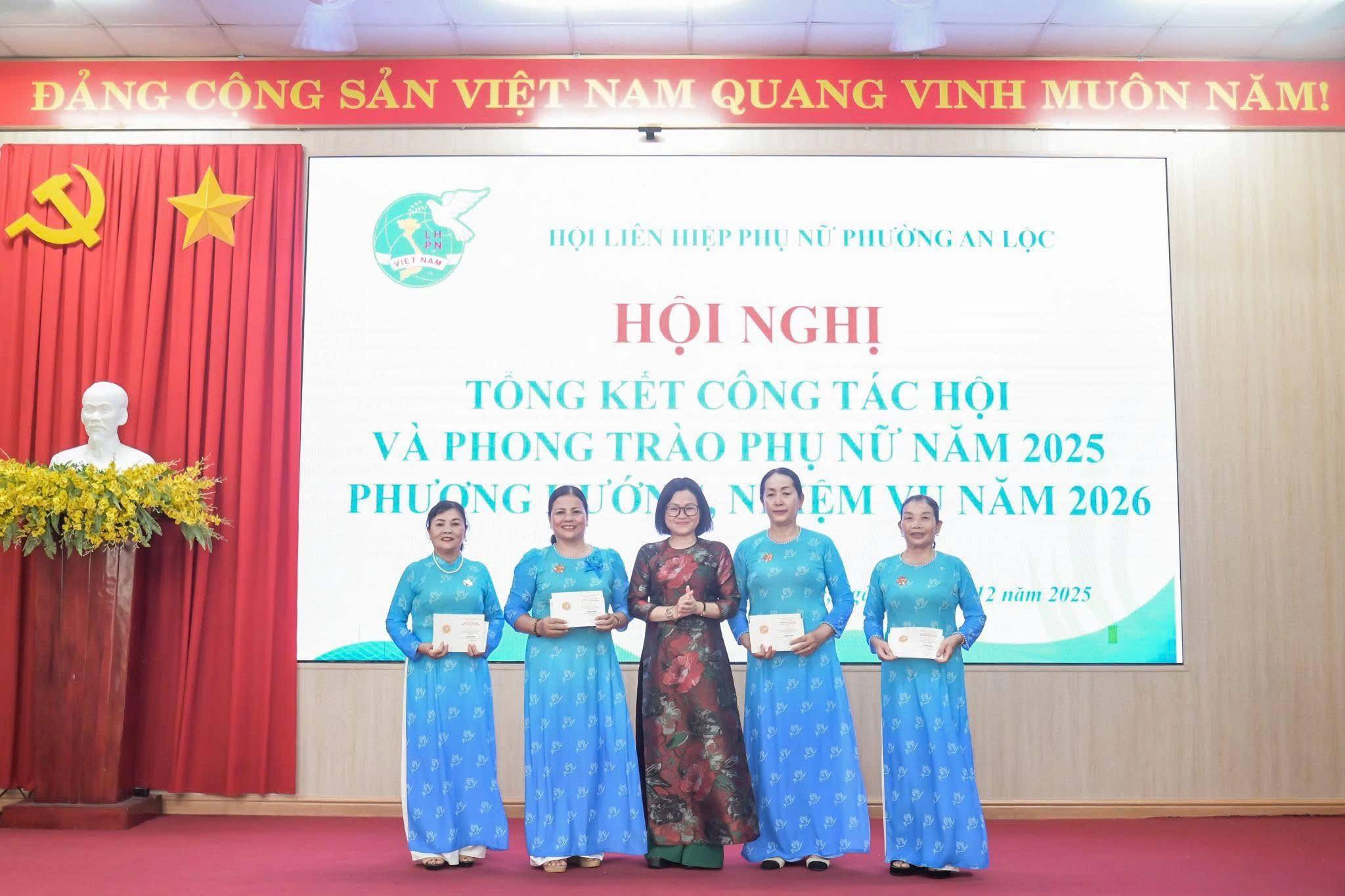 Dịp này, Hội LHPN phường An Lộc đã trao bảng tượng trưng số tiền 12 triệu đồng hỗ trợ nguồn vốn khởi sự kinh doanh cho hội viên phụ nữ; Công ty Quảng cáo Sự kiện Nguyễn Anh trao 6 triệu đồng hỗ trợ phụ nữ có hoàn cảnh khó khăn trên địa bàn. Hội nghị cũng trao Bằng khen của Hội LHPN tỉnh Đồng Nai cho 2 cá nhân có thành tích xuất sắc; UBND phường An Lộc khen thưởng 10 tập thể và 31 cá nhân tiêu biểu trong công tác Hội và phong trào phụ nữ năm 2025; tổ chức ký kết giao ước thi đua thực hiện nhiệm vụ năm 2026.