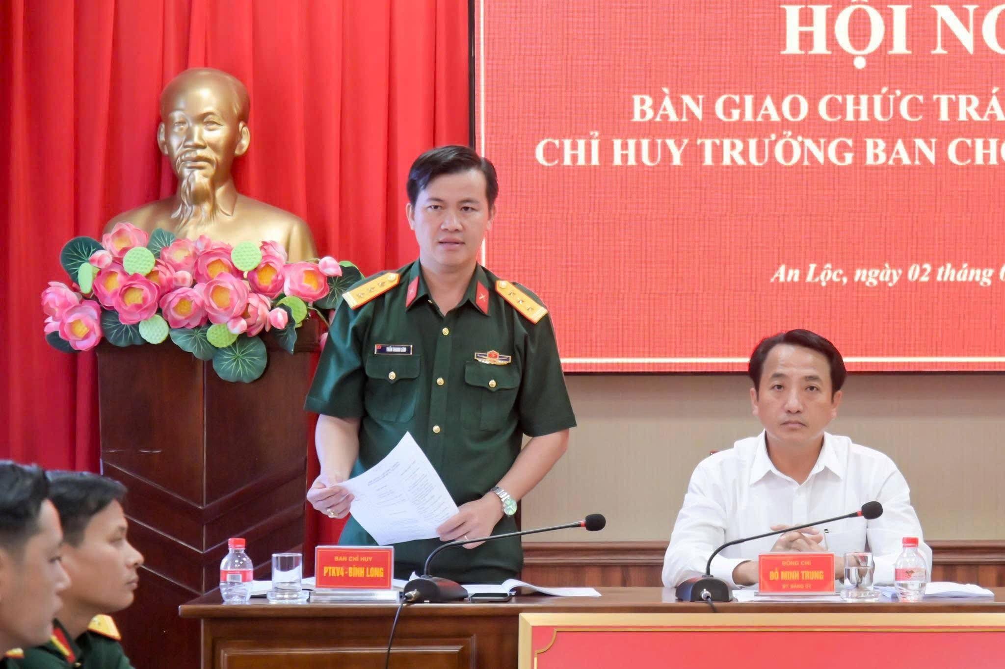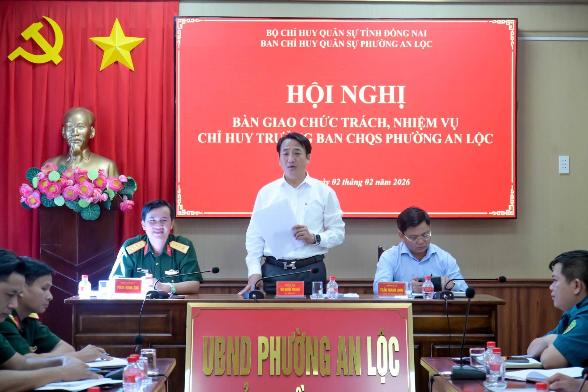 Ngày 2/2, Ban Chỉ huy Quân sự phường An Lộc tổ chức hội nghị bàn giao chức trách, nhiệm vụ Chỉ huy trưởng Ban CHQS phường. Hội nghị do đồng chí Đỗ Minh Trung - Bí thư Đảng ủy, Chủ tịch HĐND phường chủ trì. Tham dự có đồng chí Trần Thanh Long - Phó Bí thư Đảng ủy, Chủ tịch UBND phường; đồng chí Thượng tá Trần Thanh Lâm - Phó Chính ủy Ban CH PTKV 4 - Bình Long; đại diện các phòng Tham mưu, Chính trị, Hậu cần - Kỹ thuật Ban CH PTKV 4 - Bình Long cùng toàn thể cán bộ, chiến sĩ Ban CHQS phường An Lộc.