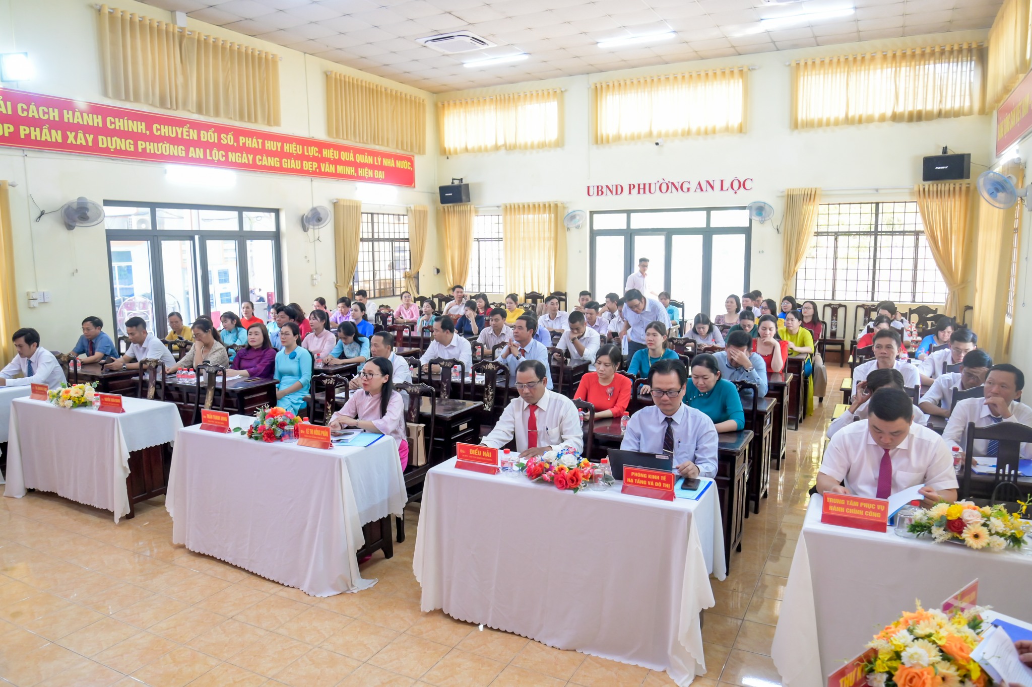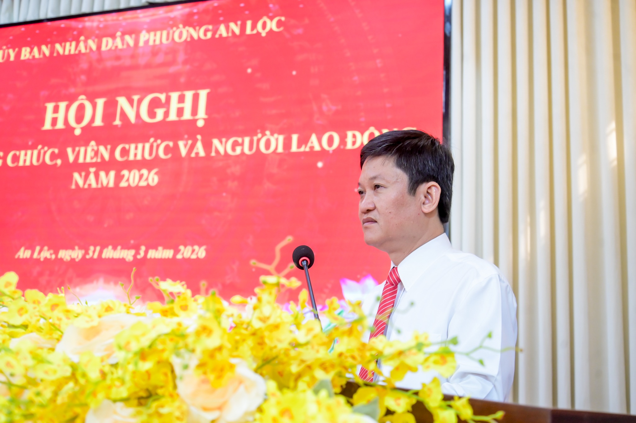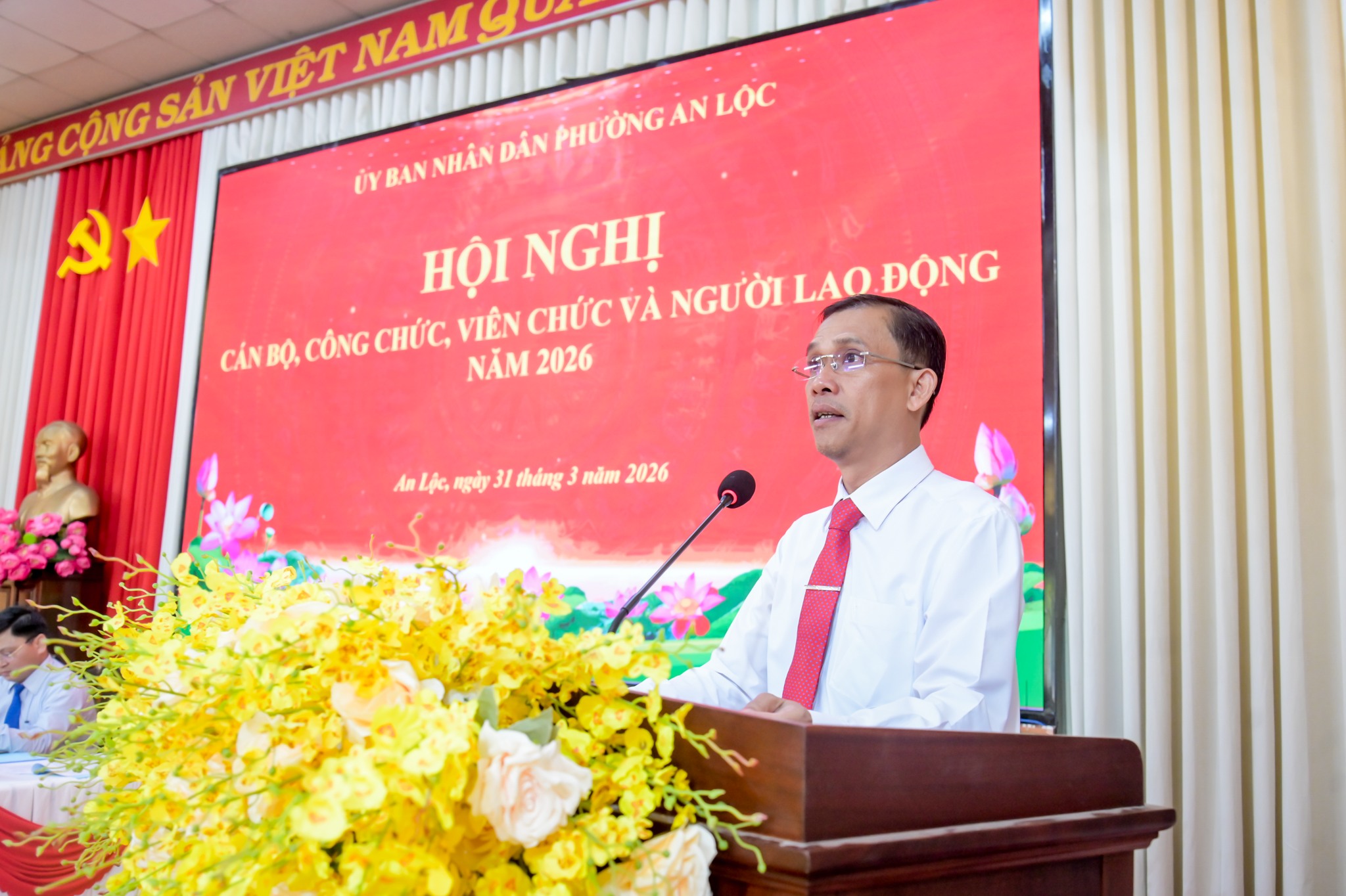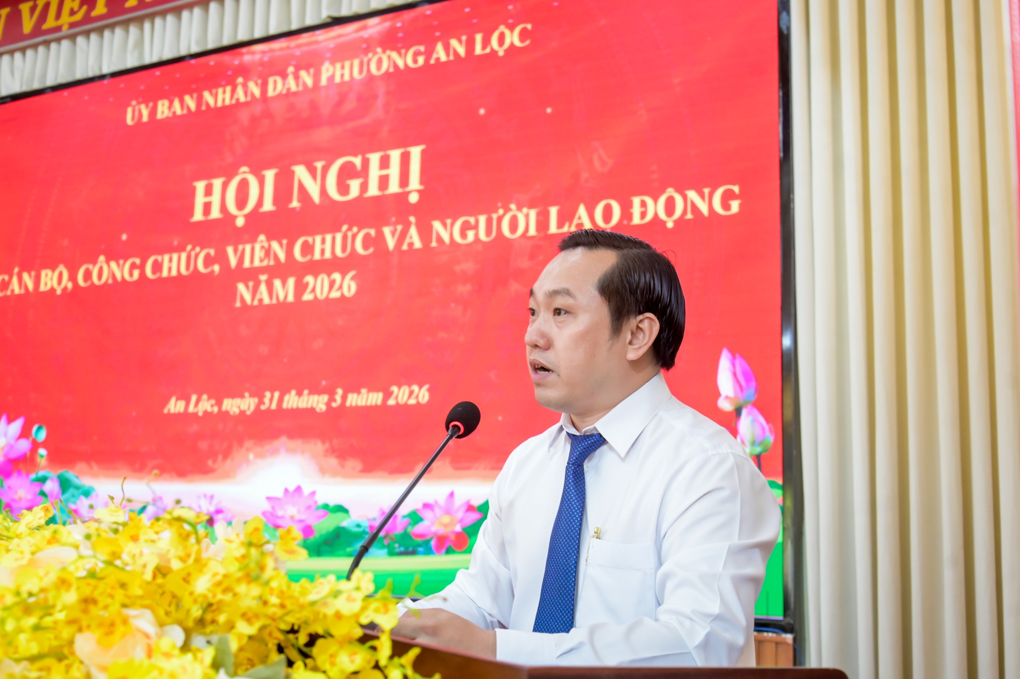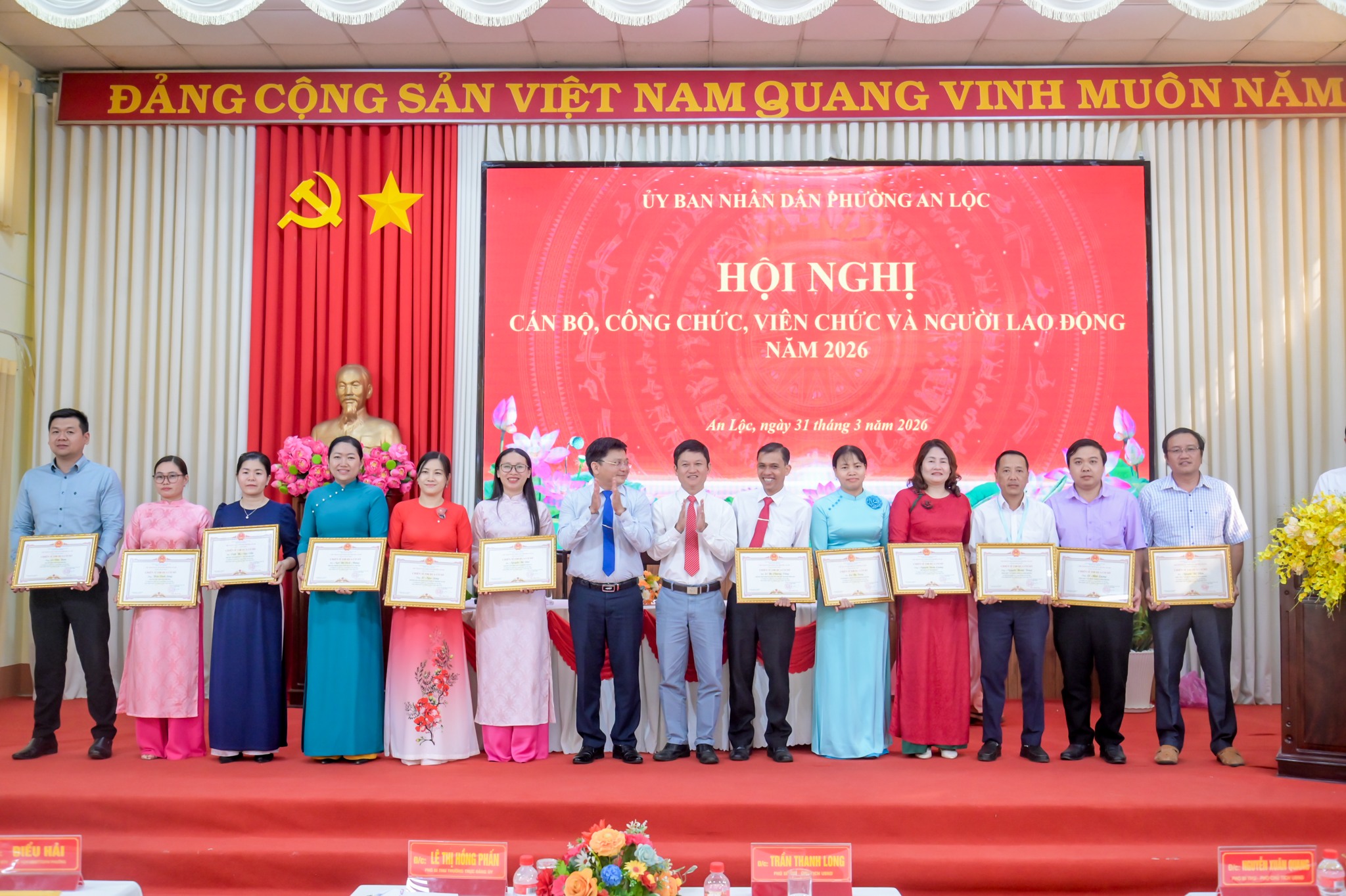 Ngày 31/3, UBND phường An Lộc tổ chức Hội nghị cán bộ, công chức, viên chức và người lao động năm 2026. Tham dự hội nghị có đồng chí Lê Thị Hồng Phấn - Phó Bí thư Thường trực Đảng ủy phường; đồng chí Trần Thanh Long - Phó Bí thư Đảng ủy, Chủ tịch UBND phường cùng các đồng chí lãnh đạo UBND, ban ngành đoàn thể, trưởng các phòng, ban, trung tâm và toàn thể cán bộ, công chức, viên chức, người lao động cơ quan.