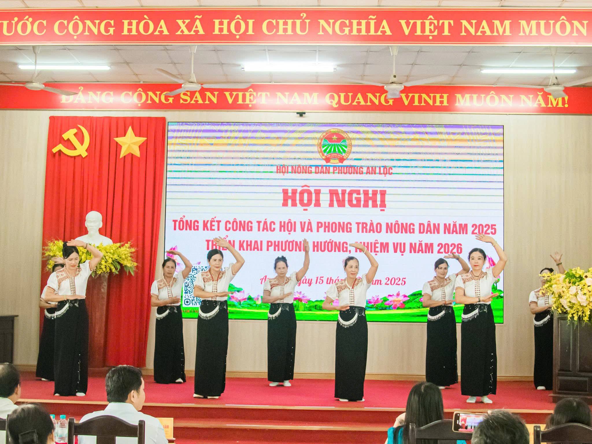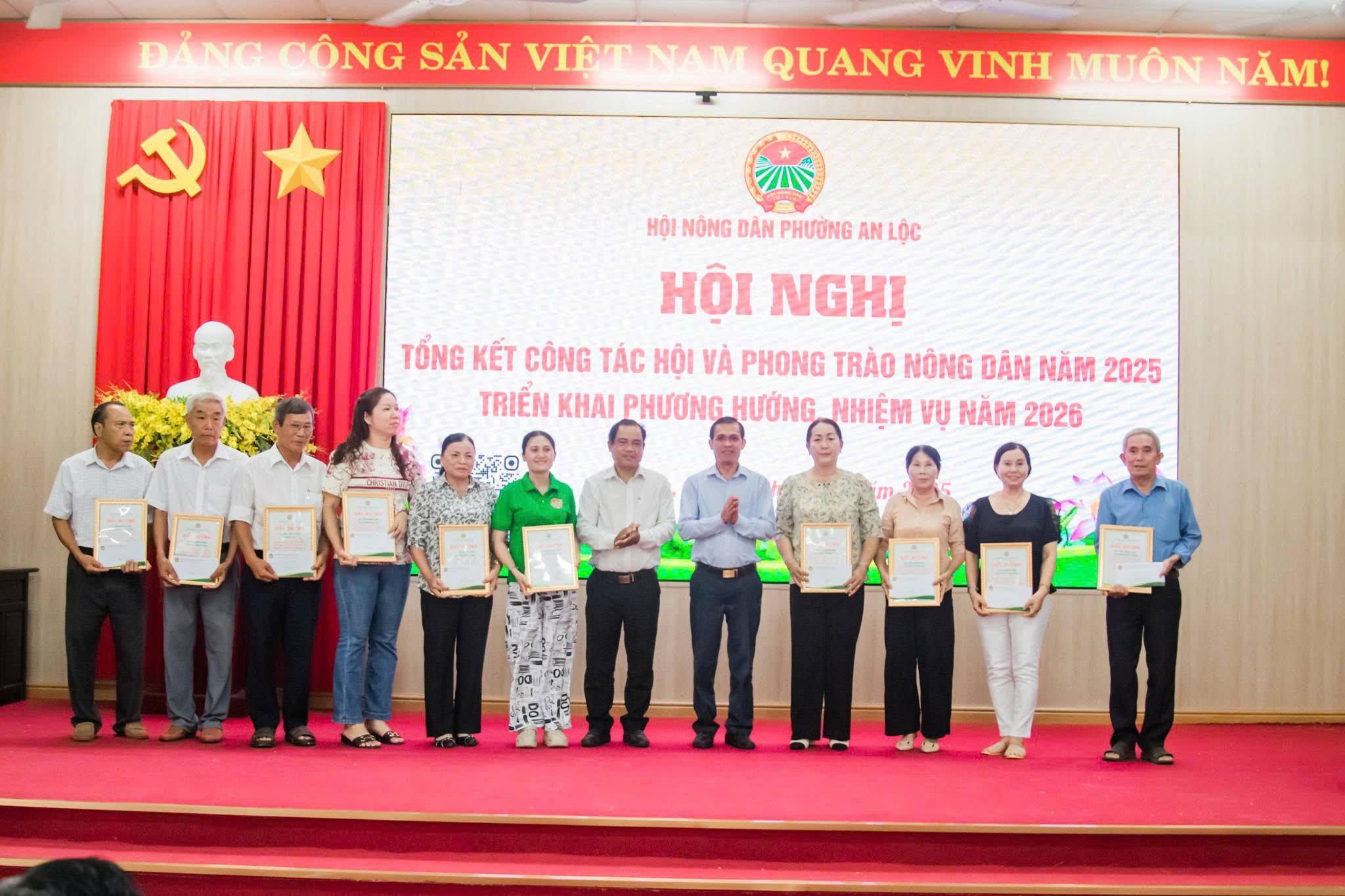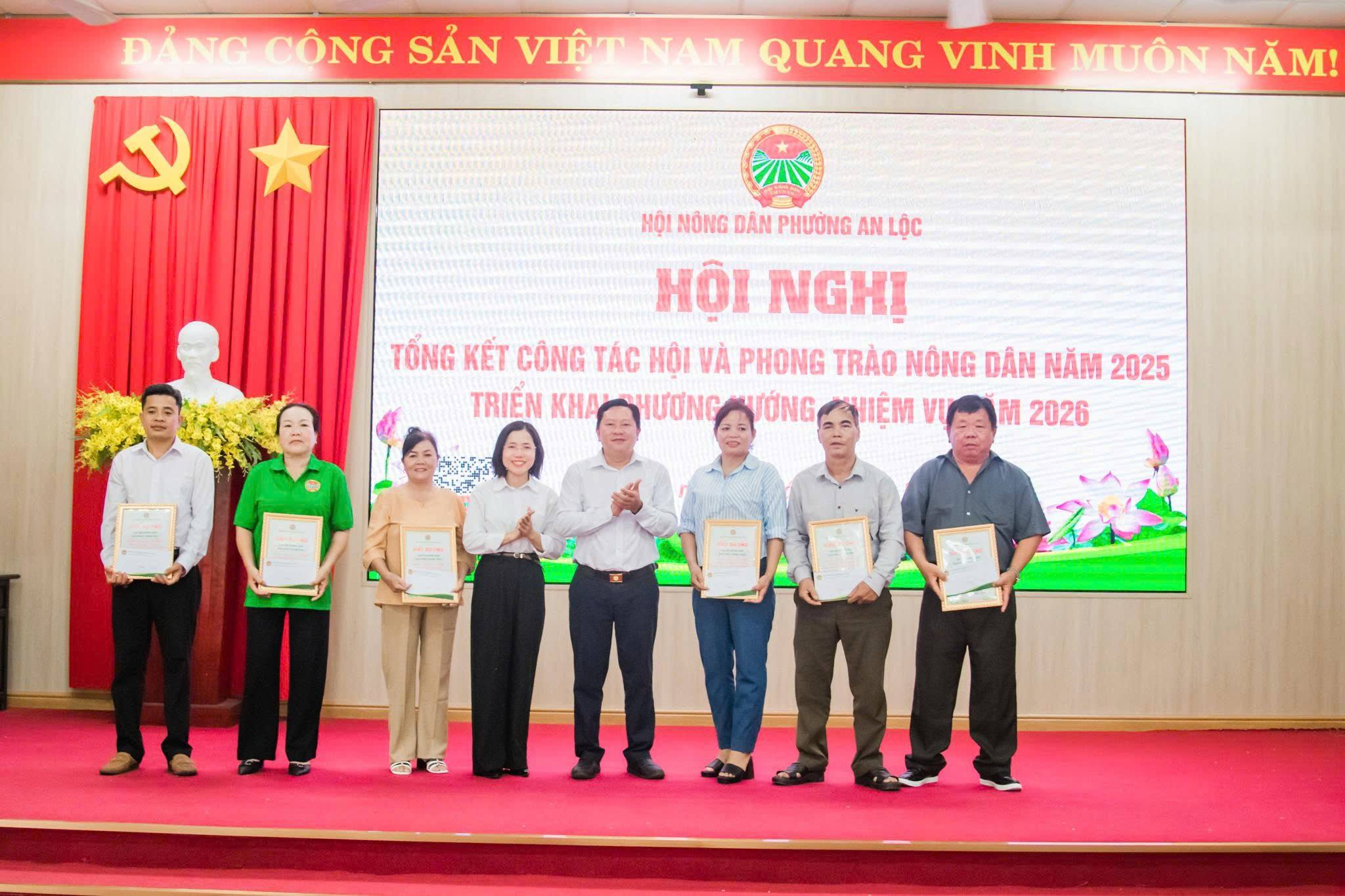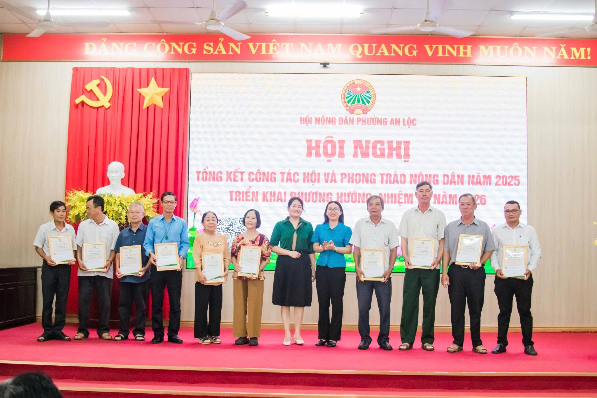 Hội nghị đã nghe các tham luận, thảo luận tập trung chia sẻ kinh nghiệm thực tiễn. Chi hội Nông dân khu phố Phú Lạc trình bày tham luận về kinh nghiệm vận động nông dân tham gia các hình thức kinh tế tập thể và liên kết chuỗi trong trồng cây sầu riêng; Chi hội Nông dân khu phố Thanh Tuấn trao đổi một số bài học kinh nghiệm trong xây dựng mô hình nông dân góp vốn xoay vòng hỗ trợ phát triển sản xuất; Tổ hợp tác trồng rau sạch Thanh Thịnh báo cáo kết quả và kinh nghiệm trong hoạt động sản xuất, kinh doanh của Tổ hợp tác. Hội nghị đã công bố quyết định thành lập và ra mắt mô hình dân vận khéo Câu lạc bộ “Bữa sáng yêu thương”, góp phần lan tỏa tinh thần tương thân tương ái trong cộng đồng, đồng thời biểu dương, khen thưởng 6 tập thể hoàn thành xuất sắc nhiệm vụ và 23 tập thể hoàn thành tốt nhiệm vụ công tác Hội và phong trào nông dân năm 2025.