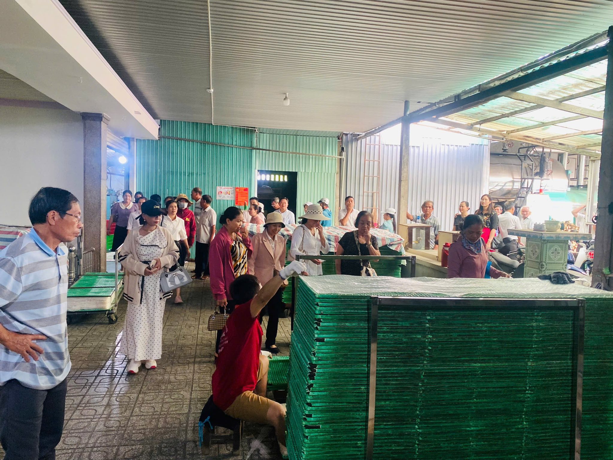 Hiện đại hóa sản xuất: Bà con nông dân đã chứng kiến việc ứng dụng máy móc vào các khâu như sấy bánh (qua hình ảnh các khay sấy màu xanh), giúp sản phẩm đạt độ đồng đều, rút ngắn thời gian sản xuất và đảm bảo vệ sinh an toàn thực phẩm.