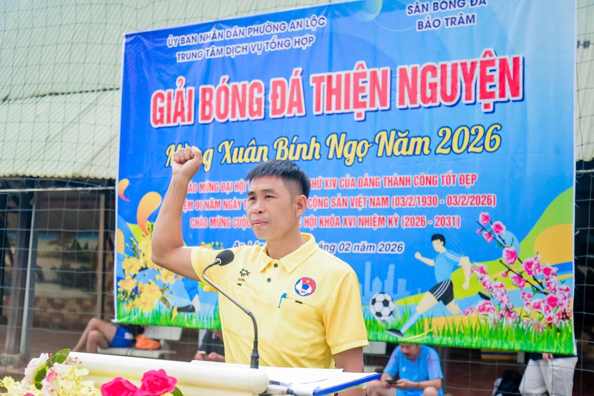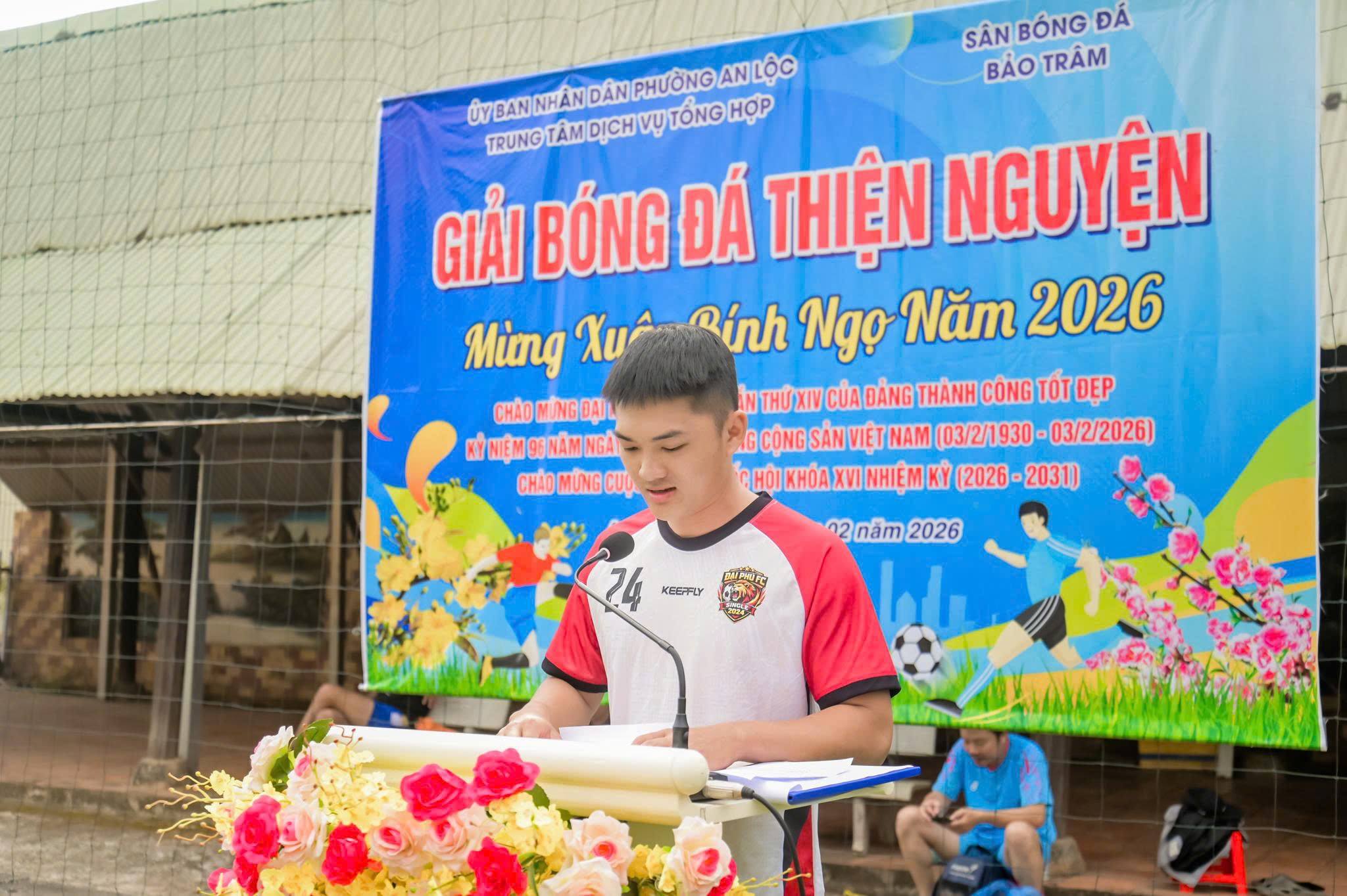 Chào mừng Đại hội đại biểu toàn quốc lần thứ XIV của Đảng thành công tốt đẹp; kỷ niệm 96 năm Ngày thành lập Đảng Cộng sản Việt Nam (03/02/1930 - 03/02/2026) và chào mừng cuộc bầu cử đại biểu Quốc hội khóa XVI, nhiệm kỳ 2026 - 2031. Ngày 31/1, Trung tâm Dịch vụ tổng hợp phường An Lộc phối hợp với Sân bóng đá Bảo Trâm tổ chức khai mạc Giải bóng đá thiện nguyện mừng Xuân Bính Ngọ năm 2026. Dự lễ khai mạc có đồng chí Huỳnh Hiếu Chiến - Giám đốc Trung tâm Dịch vụ tổng hợp phường An Lộc; ông Mai Bảo Bình - đại diện Sân bóng đá Bảo Trâm, cùng đại diện các đội bóng tham gia giải.