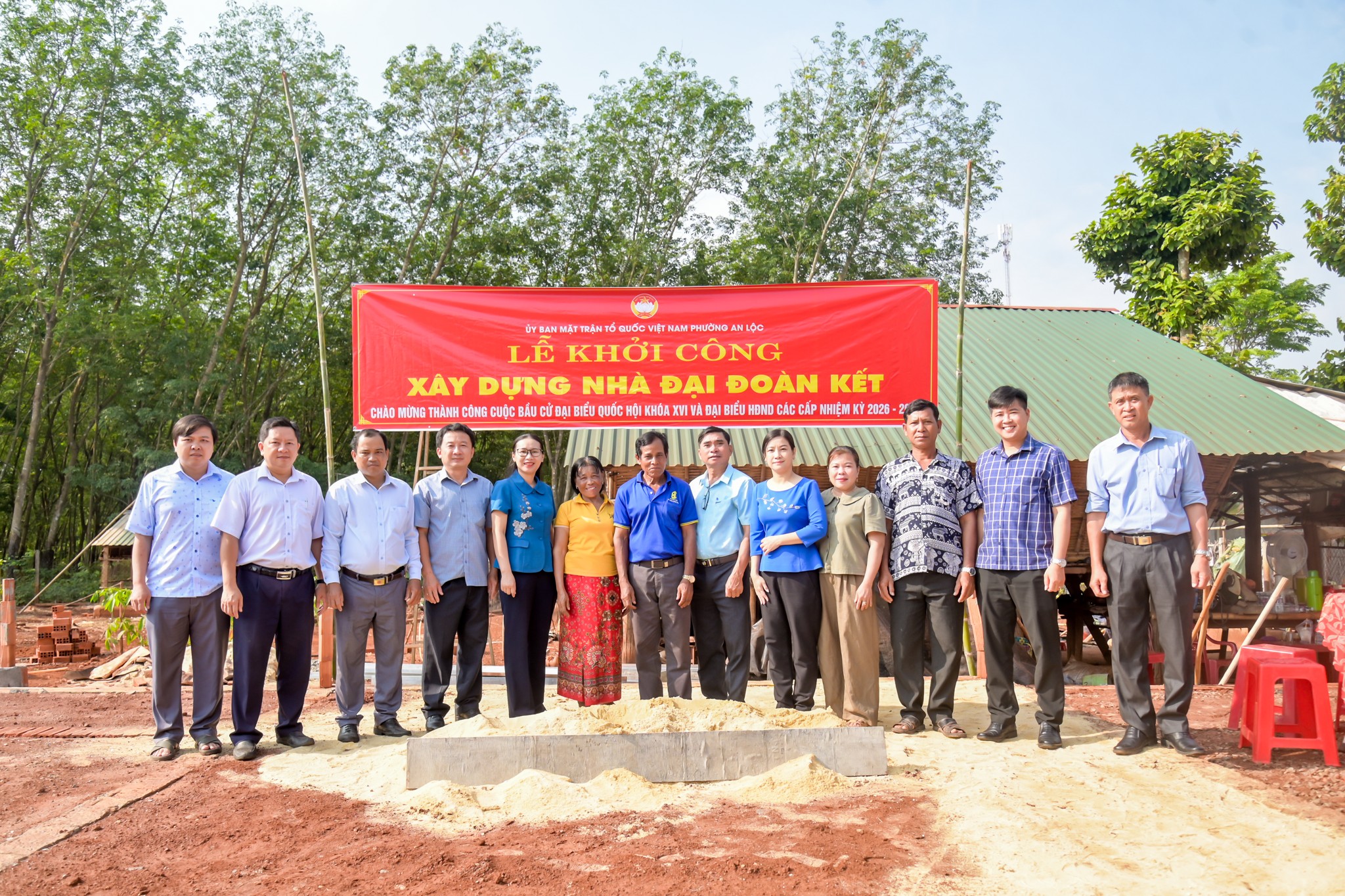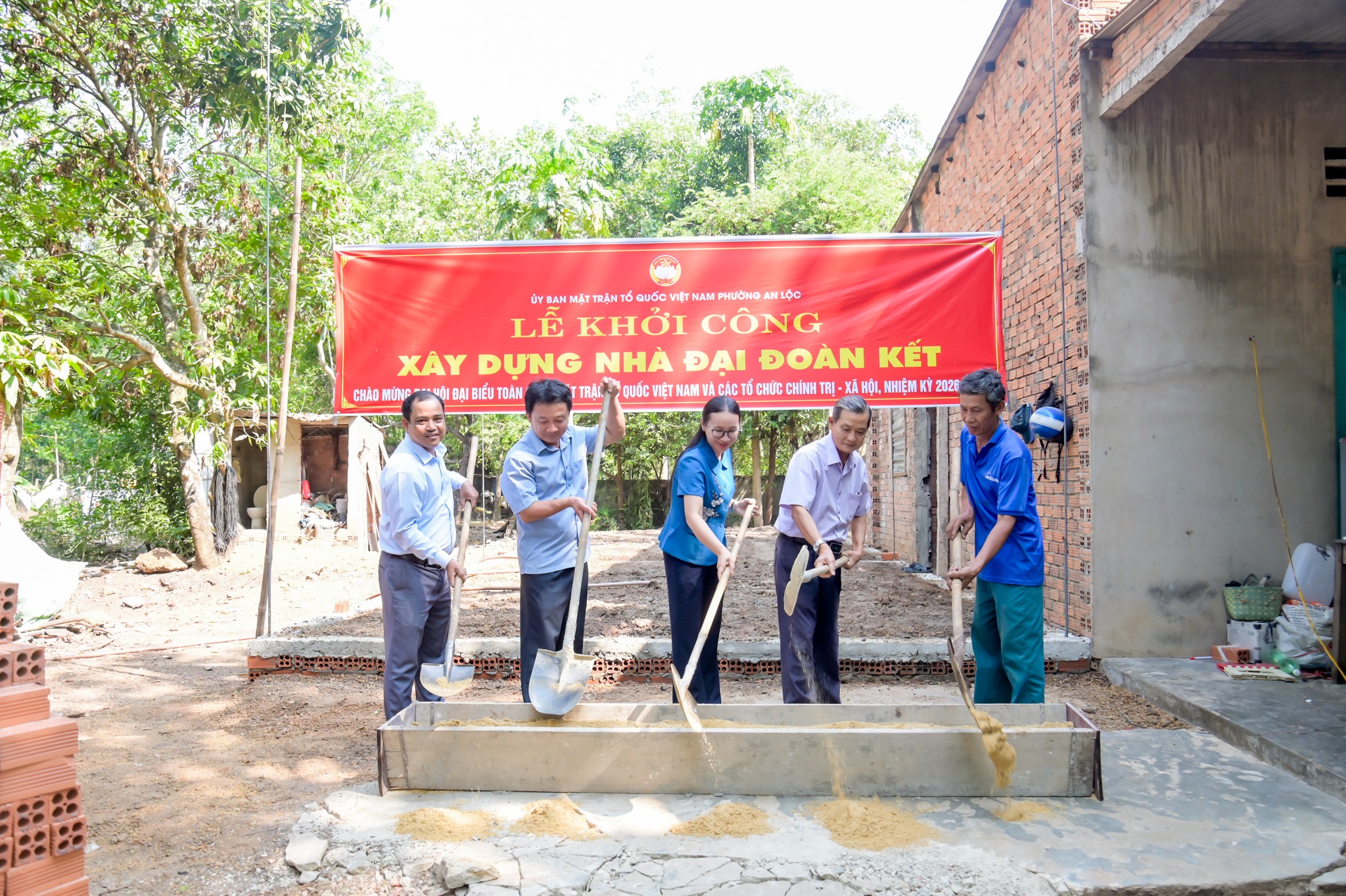 Sáng 01/4, UBMTTQVN phường An Lộc tổ chức Lễ khởi công xây dựng nhà Đại đoàn kết cho các hộ gia đình có hoàn cảnh khó khăn trên địa bàn, góp phần thực hiện hiệu quả chính sách an sinh xã hội, chăm lo đời sống Nhân dân. Tham dự buổi lễ có đồng chí Lê Thị Hồng Phấn - Phó Bí thư Thường trực Đảng ủy phường; đồng chí Điểu Hải - Ủy viên Ban Thường vụ Đảng ủy, Chủ tịch Ủy ban MTTQ Việt Nam phường cùng đại diện lãnh đạo HĐND, Ủy ban MTTQ Việt Nam phường.