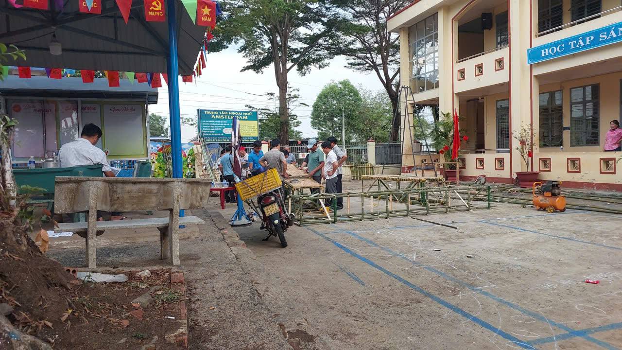 Ngay từ sáng sớm, cán bộ, chiến sĩ lực lượng dân quân và đoàn viên, thanh niên các khu phố đã có mặt, nhanh chóng bắt tay vào dựng khung trại, trang trí cổng, chuẩn bị các pa-nô, khẩu hiệu theo đúng chủ đề, nội dung đã được thống nhất. Công tác tổ chức được triển khai chặt chẽ, bảo đảm an toàn, tiết kiệm, phát huy tinh thần sáng tạo, trách nhiệm và quyết tâm hoàn thành tốt nhiệm vụ.