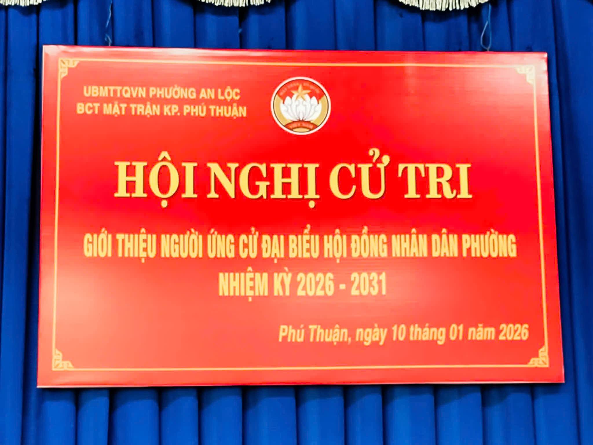 Tại hội nghị, Ban Công tác Mặt trận khu phố đã thông qua chương trình, mục đích, yêu cầu của hội nghị; giới thiệu tóm tắt tiểu sử, quá trình công tác của người được giới thiệu ứng cử đại biểu HĐND phường nhiệm kỳ 2026 - 2031. Cử tri tham dự hội nghị đã phát huy tinh thần dân chủ, tham gia thảo luận, đóng góp ý kiến xoay quanh chương trình hành động, trách nhiệm và khả năng đại diện cho ý chí, nguyện vọng của nhân dân địa phương. Qua thảo luận và biểu quyết, cử tri khu phố Phú Thuận thể hiện sự thống nhất cao, bày tỏ sự tín nhiệm đối với người được giới thiệu ứng cử. Hội nghị được tổ chức đúng trình tự, quy định, bảo đảm dân chủ, công khai, góp phần chuẩn bị tốt cho công tác bầu cử đại biểu HĐND phường An Lộc nhiệm kỳ 2026 - 2031 sắp tới.