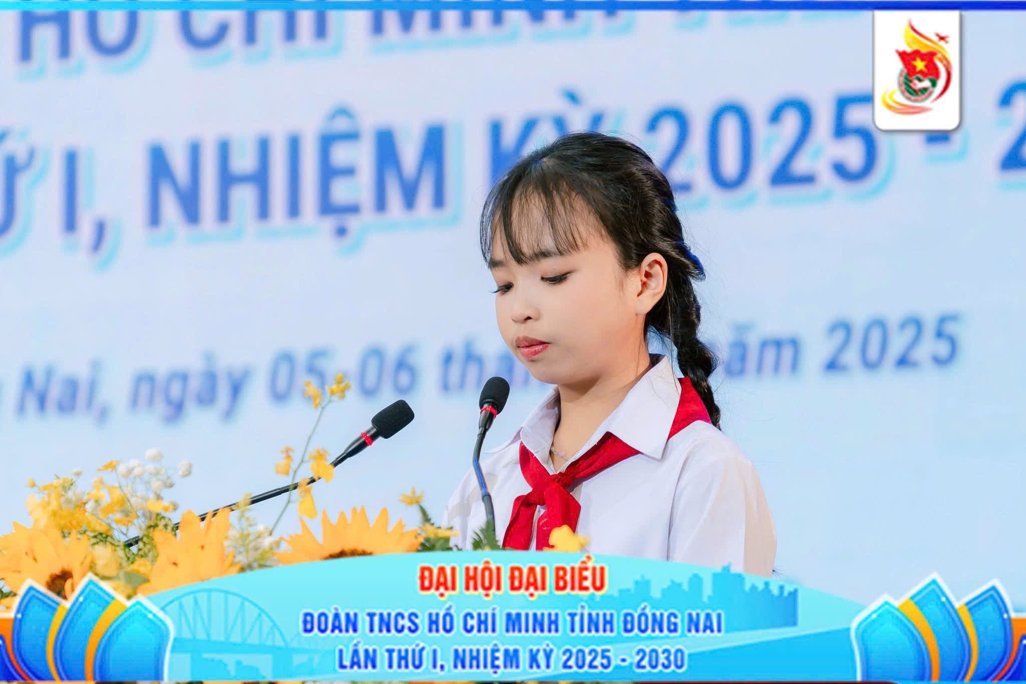 Thay mặt Đoàn Đại biểu Thanh thiếu nhi chúc mừng Đại hội, em Phạm Lê Ngọc Hân - Học sinh lớp 6A5, trường THCS An Lộc B, phường An Lộc bày tỏ niềm tin tưởng sâu sắc vào sự thành công của Đại hội; đồng thời thay mặt thiếu nhi toàn tình gửi gắm lời hứa sẽ cố gắng thi đua học tập, thực hiện 5 điều Bác Hồ dạy, phấn đấu trở thành những đội viên tốt, những bông hoa làm nghìn việc tốt để cùng góp phần xây dựng quê hương Đồng Nai ngày càng văn minh và giàu mạnh.