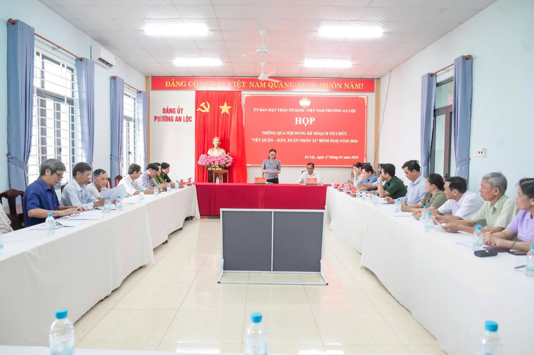 Ngày 27/1, Ban Thường trực Ủy ban MTTQ Việt Nam phường An Lộc tổ chức cuộc họp triển khai kế hoạch tổ chức chương trình “Tết Quân – Dân, Xuân nhân ái” Bính Ngọ năm 2026. Dự và chủ trì cuộc họp có đồng chí Lê Thị Hồng Phấn - Phó Bí thư Thường trực Đảng ủy phường; đồng chí Điểu Hải - Ủy viên Ban Thường vụ Đảng ủy, Chủ tịch Ủy ban MTTQ Việt Nam phường, cùng dự còn có các đồng chí trong Ban Thường trực, đại diện các phòng ban chuyên môn và bí thư, trưởng các khu phố.
