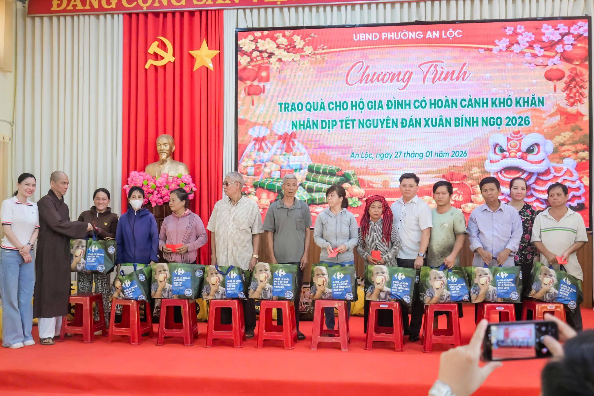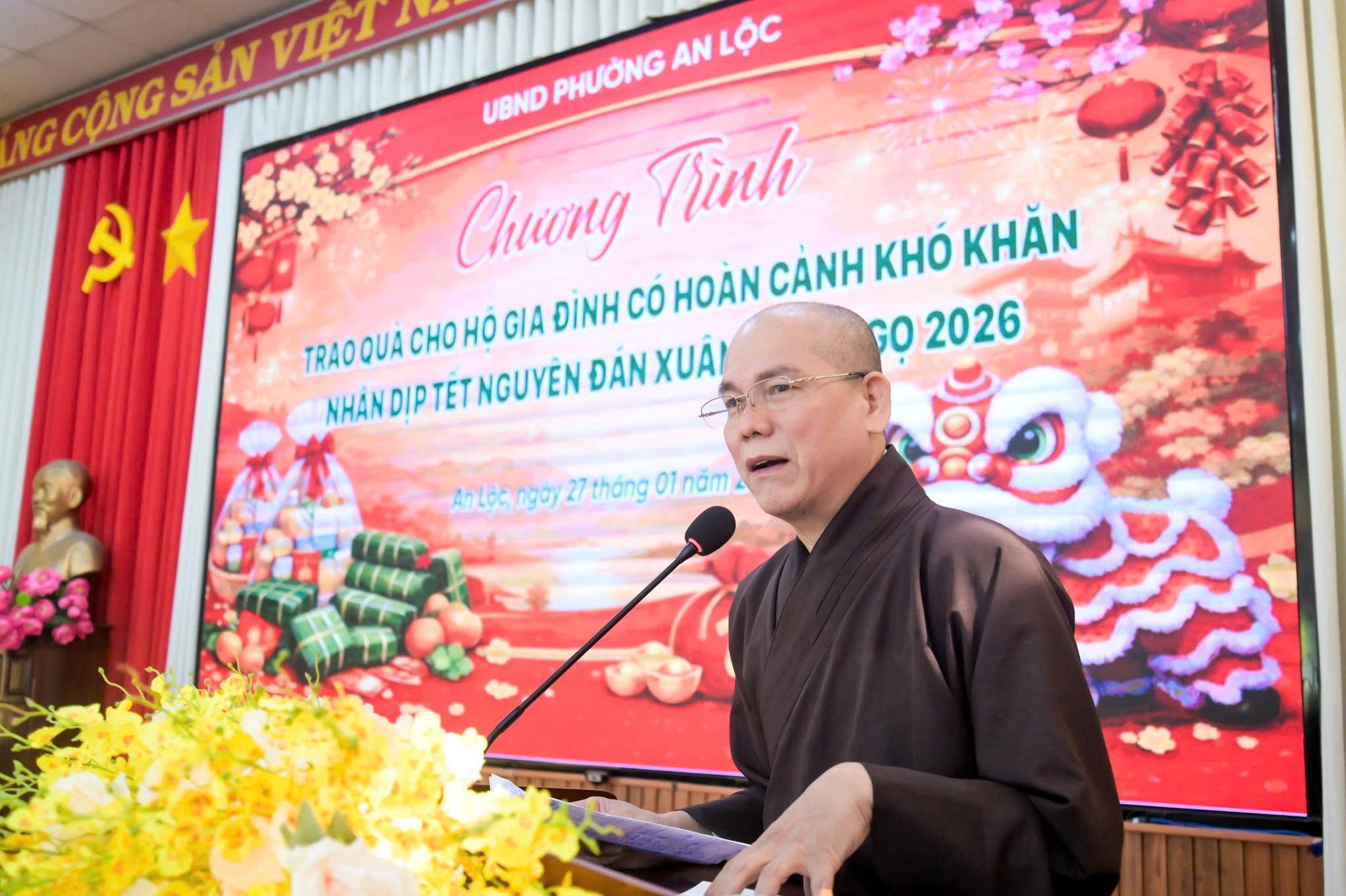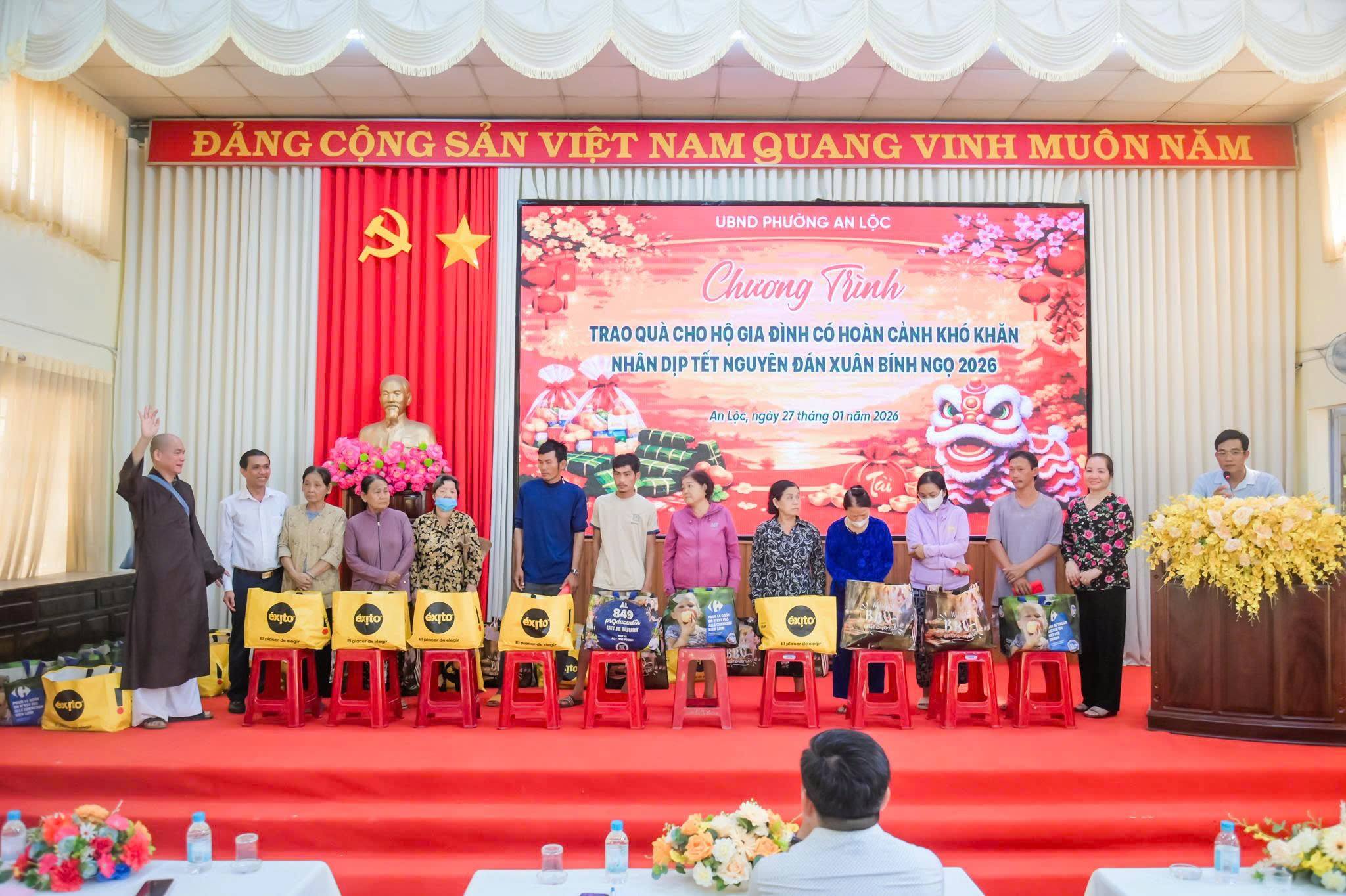 Ngày 27/1, UBND phường An Lộc phối hợp với chùa Pháp Liên, đoàn thiện nguyện do Thượng tọa Thích Huệ Triết - Trụ trì chùa Pháp Liên làm trưởng đoàn tổ chức chương trình trao quà Tết cho các hộ gia đình có hoàn cảnh khó khăn trên địa bàn phường nhân dịp Tết Nguyên đán Xuân Bính Ngọ 2026.