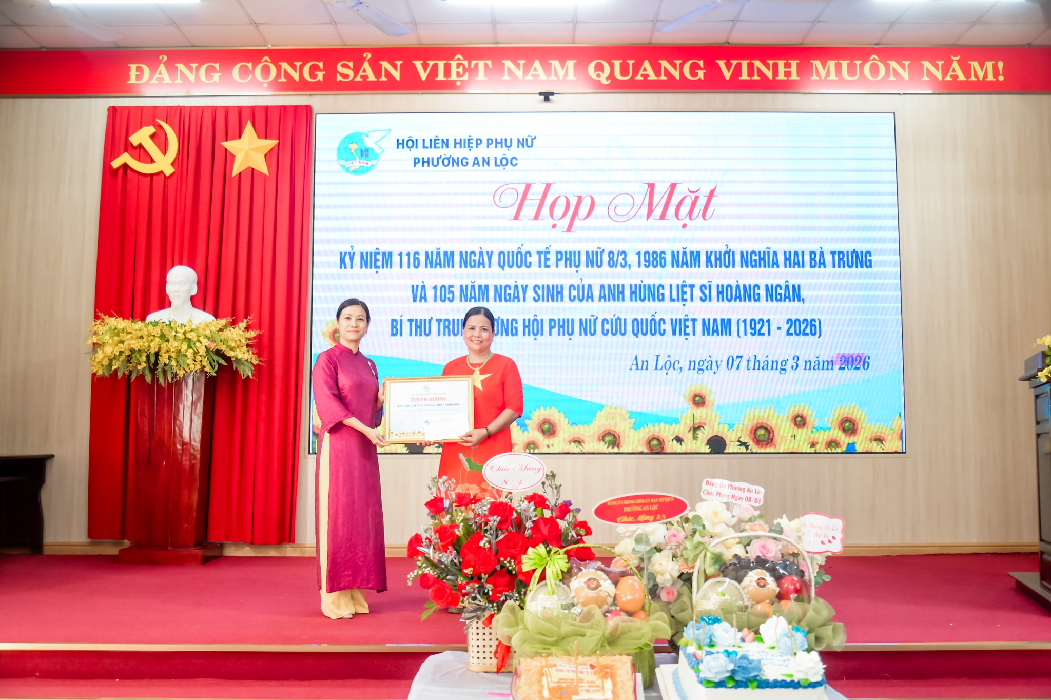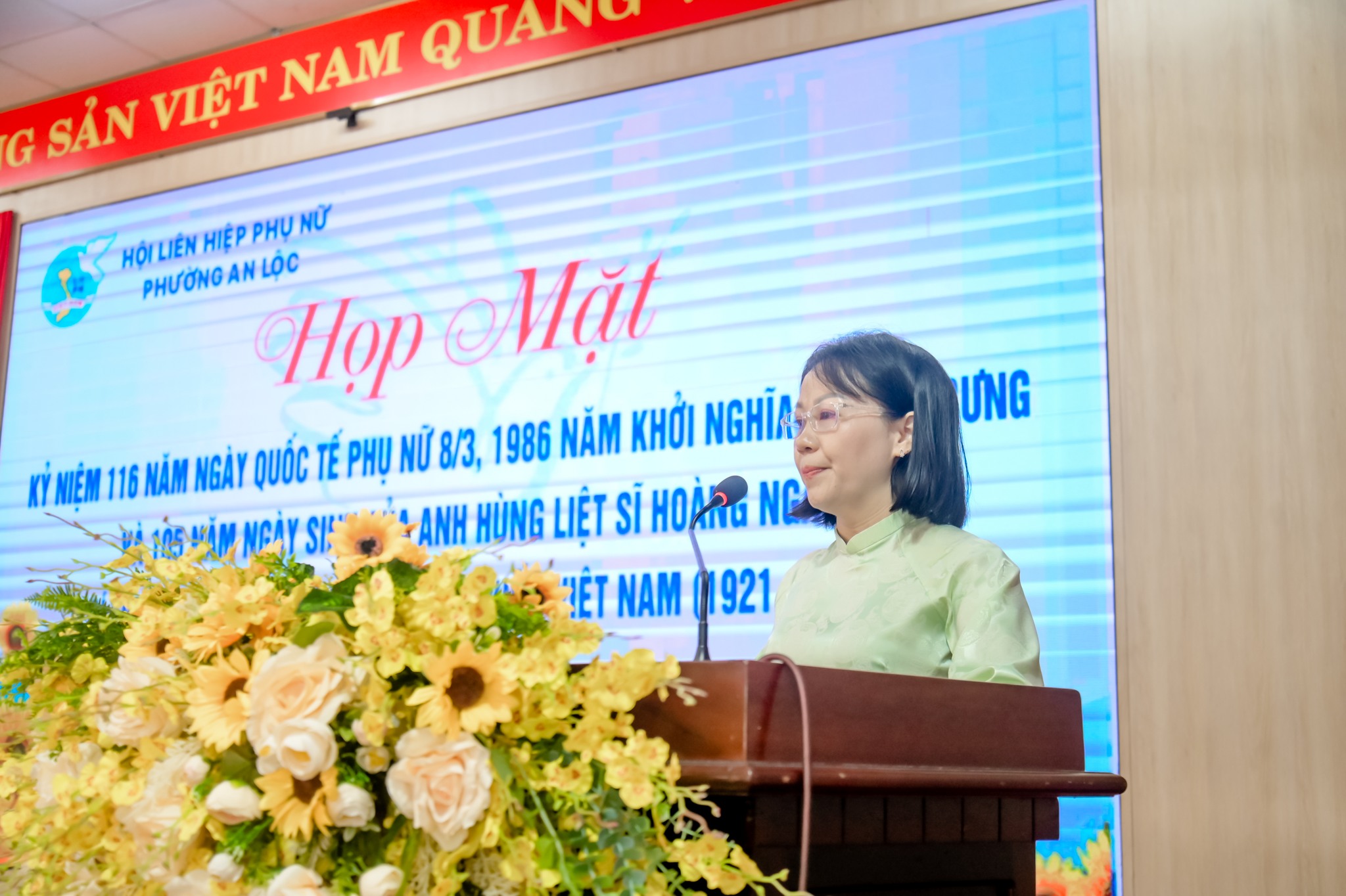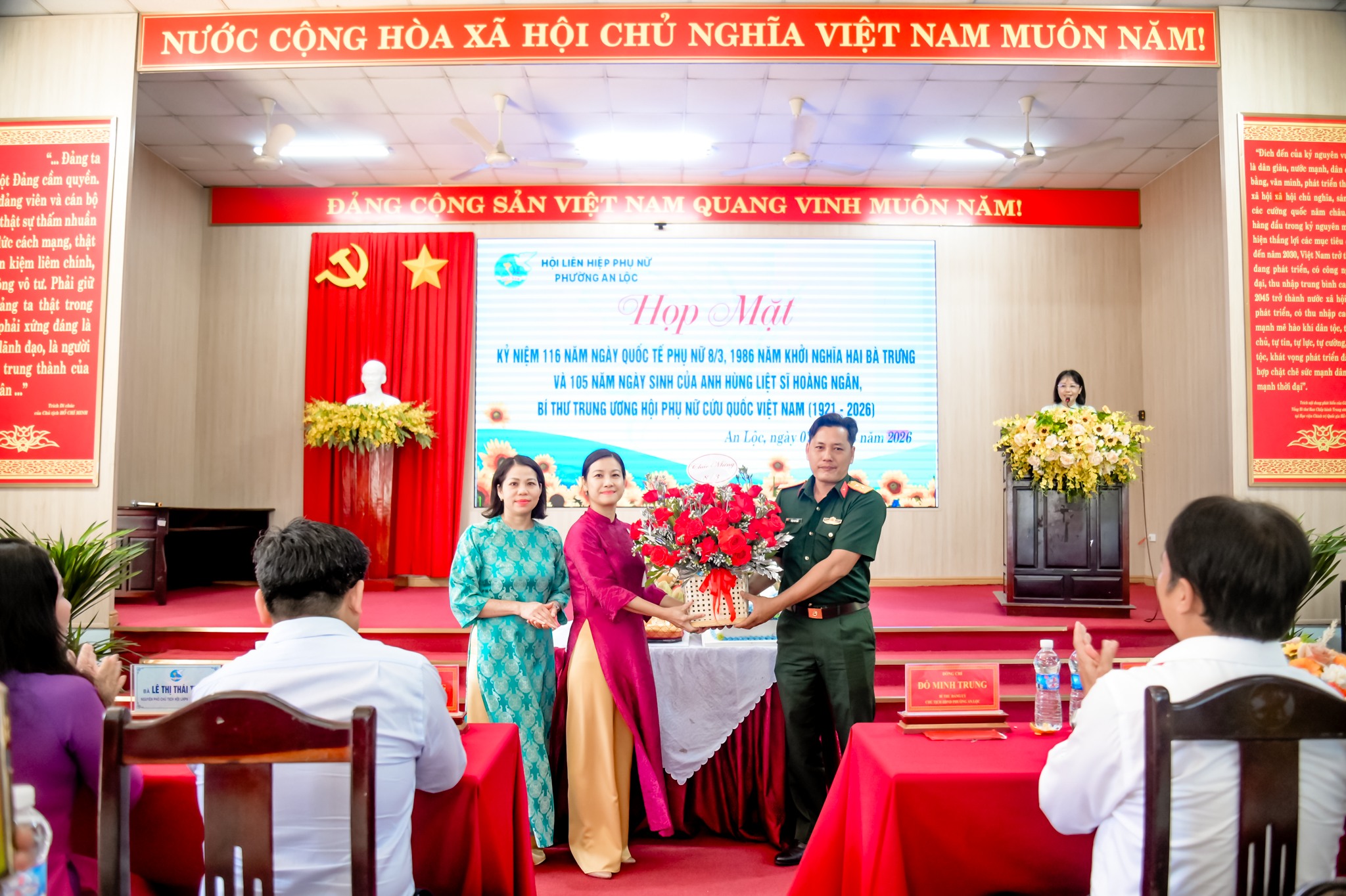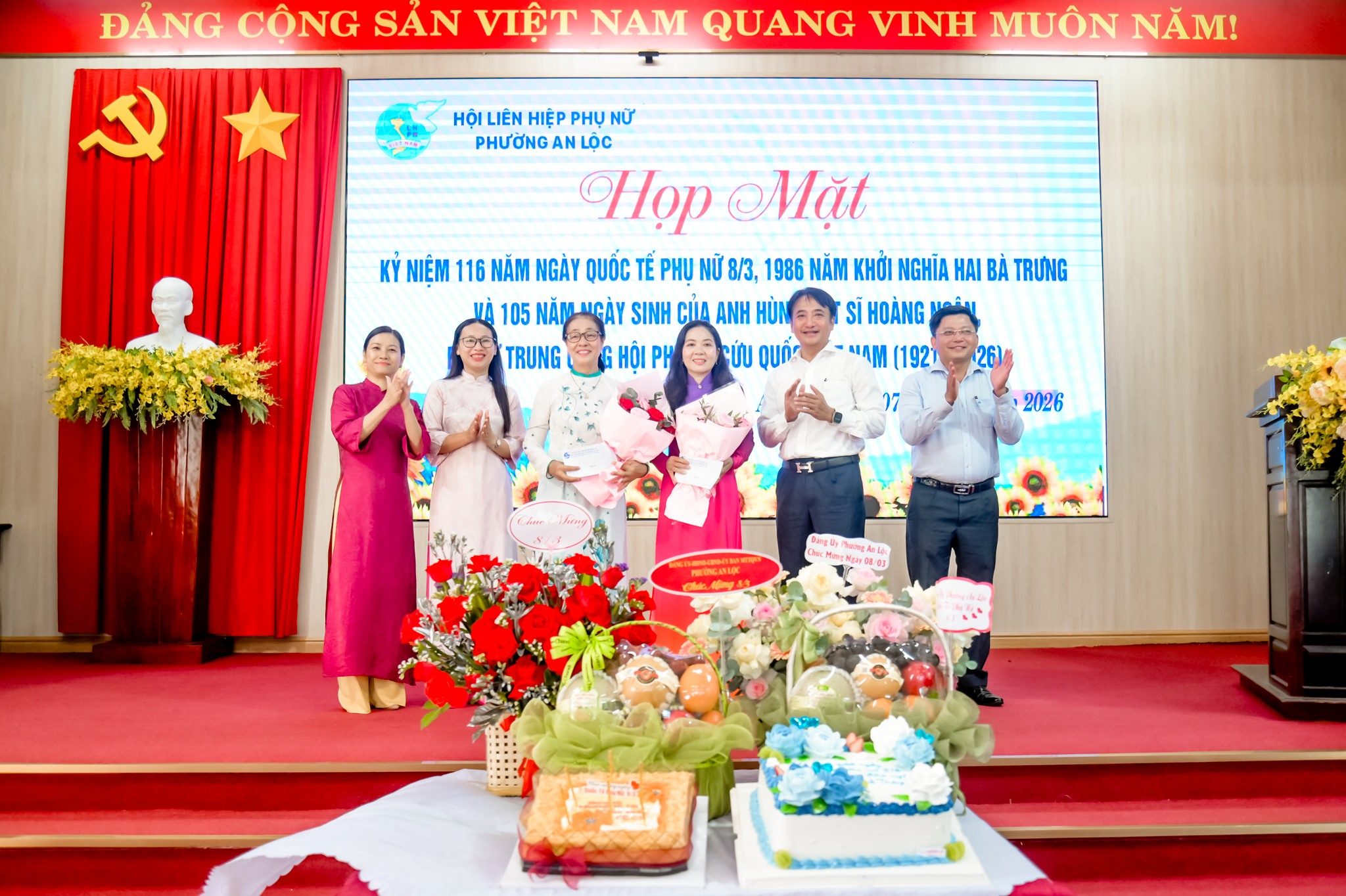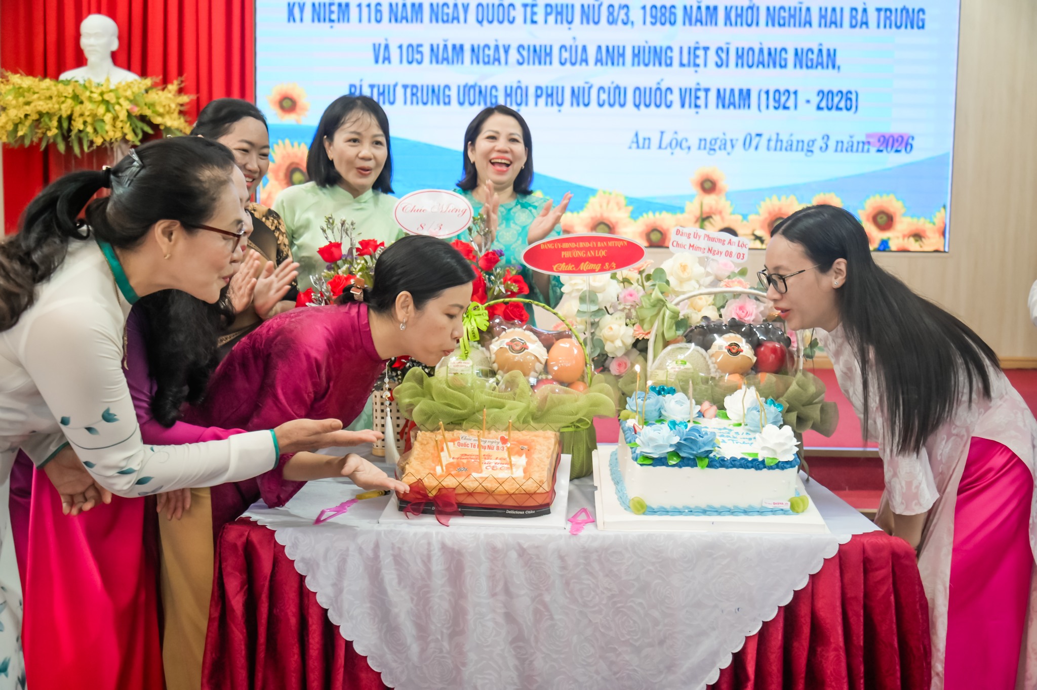 Nhân kỷ niệm 116 năm Ngày Quốc tế Phụ nữ (8/3/1910 - 8/3/2026), ngày 7/3, Hội Liên hiệp Phụ nữ phường An Lộc đã tổ chức chuỗi hoạt động sôi nổi, tạo không khí vui tươi, gắn kết trong cán bộ, hội viên phụ nữ trên địa bàn. Đến dự chương trình có đồng chí Đỗ Minh Trung - Bí thư Đảng ủy, Chủ tịch HĐND phường; đồng chí Lê Thị Hồng Phấn - Phó Bí thư Thường trực Đảng ủy phường; đồng chí Trần Thanh Long - Phó Bí thư Đảng ủy, Chủ tịch UBND phường; đồng chí Đinh Thị Ngọc Cẩm - ĐUV, PCT UBMTTQVN phường, Chủ tịch Hội LHPN phường cùng các đồng chí nguyên lãnh đạo hội LHPN qua các thời kỳ, lãnh đạo UBND, BCH Quân sự, ban ngành đoàn thể và đông đảo cán bộ, hội viên phụ nữ tham gia.