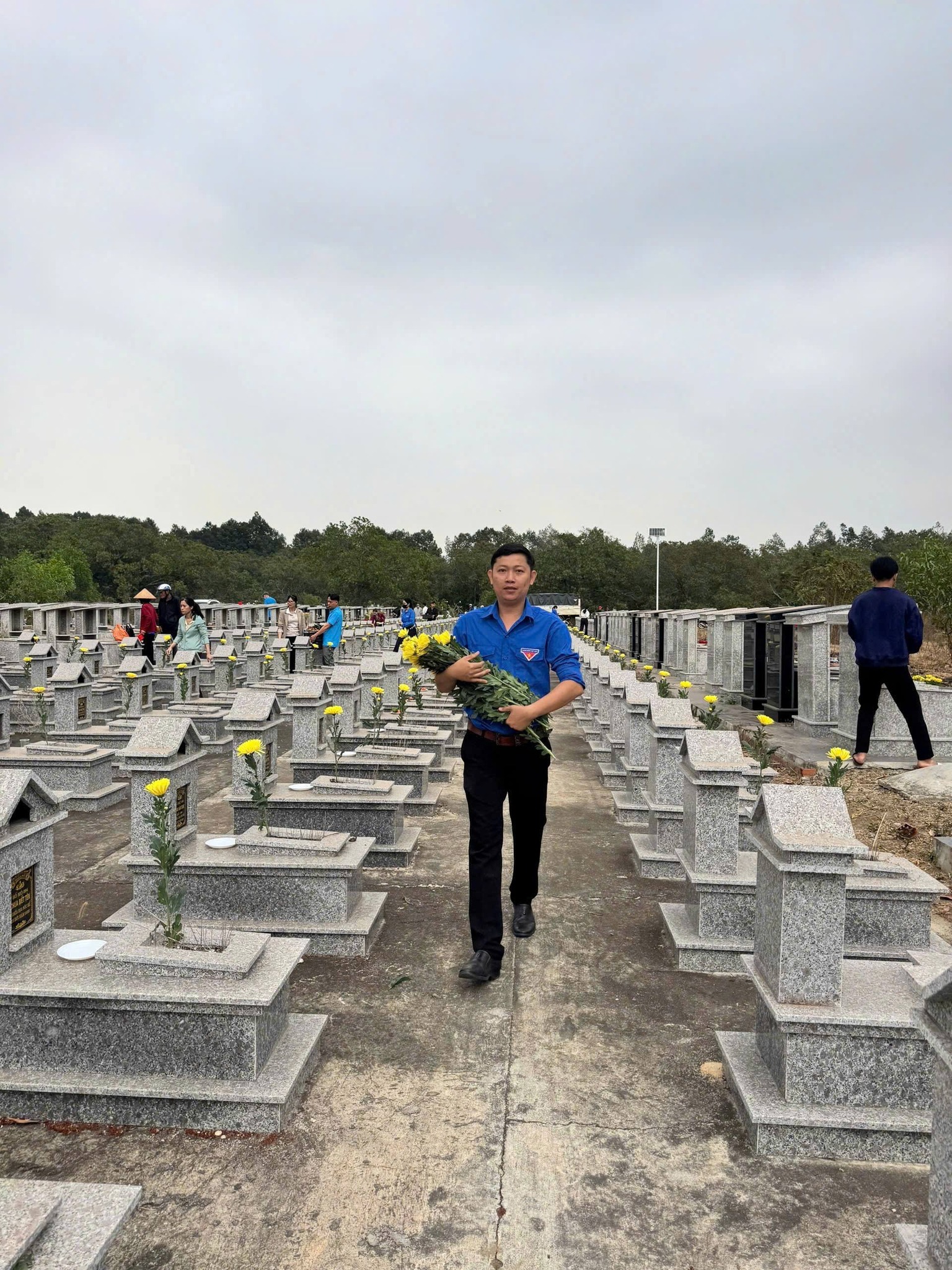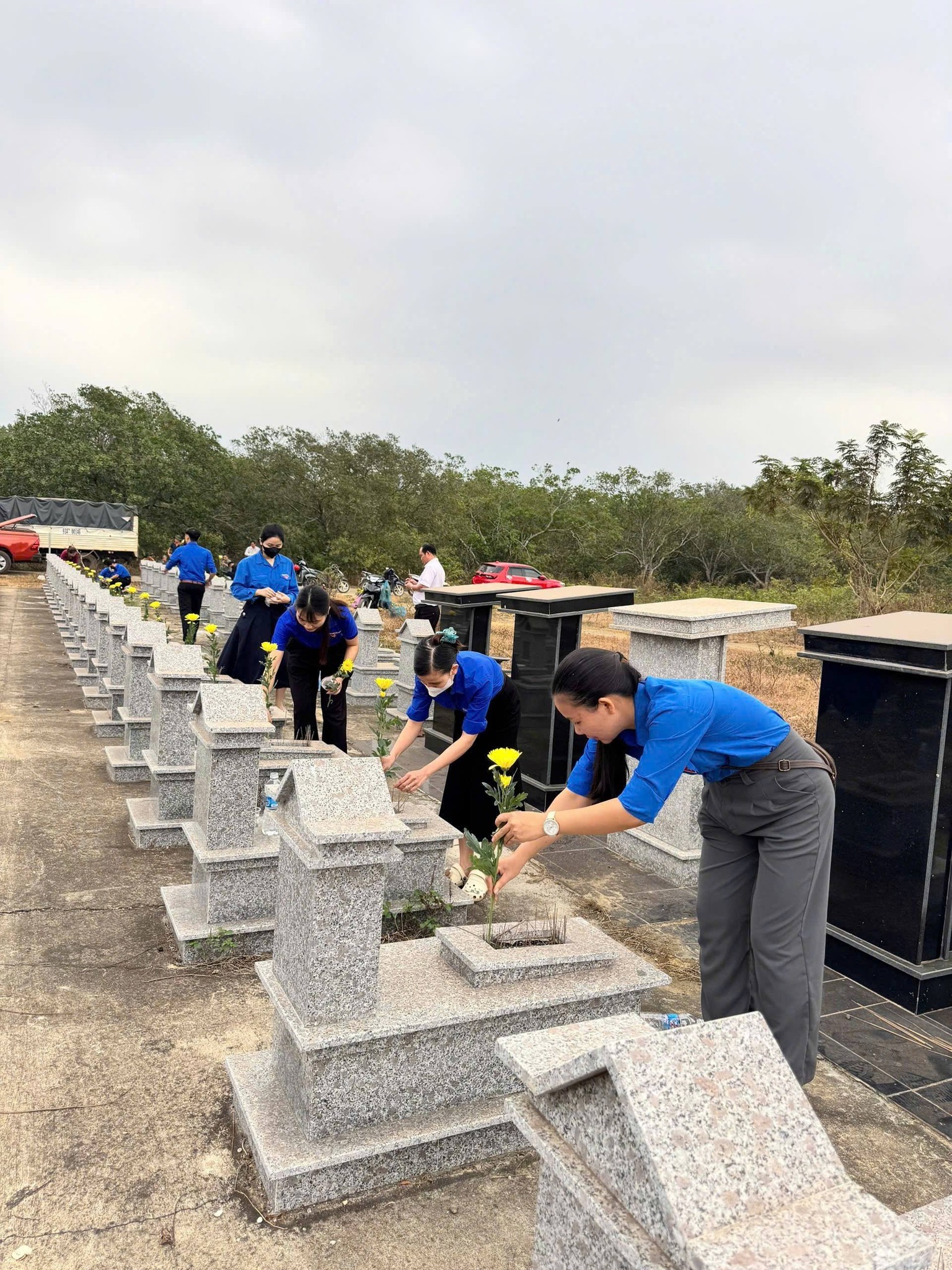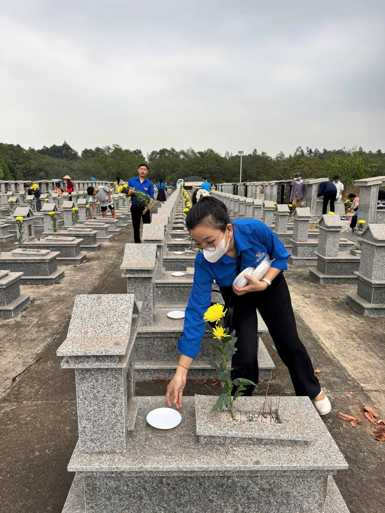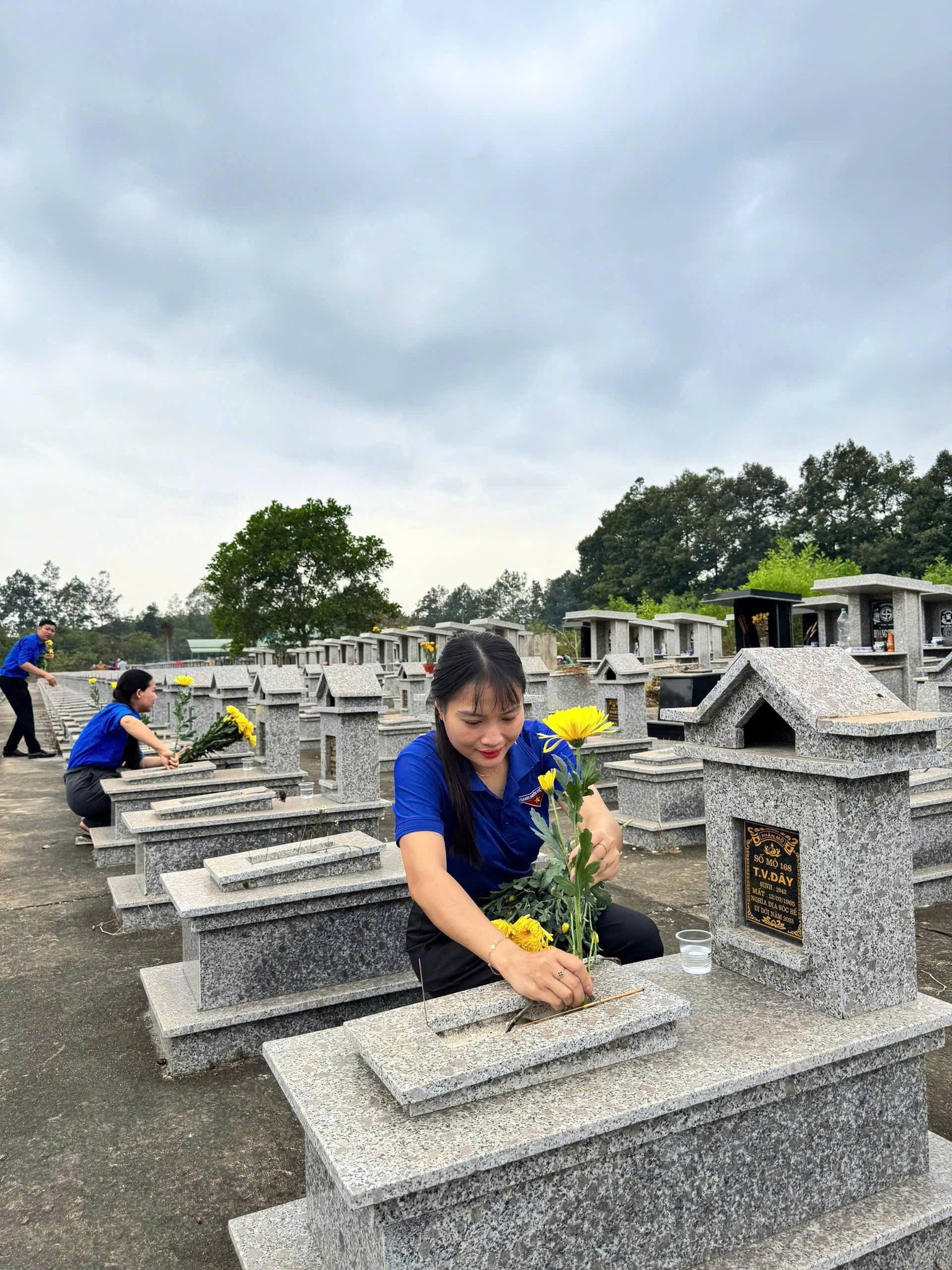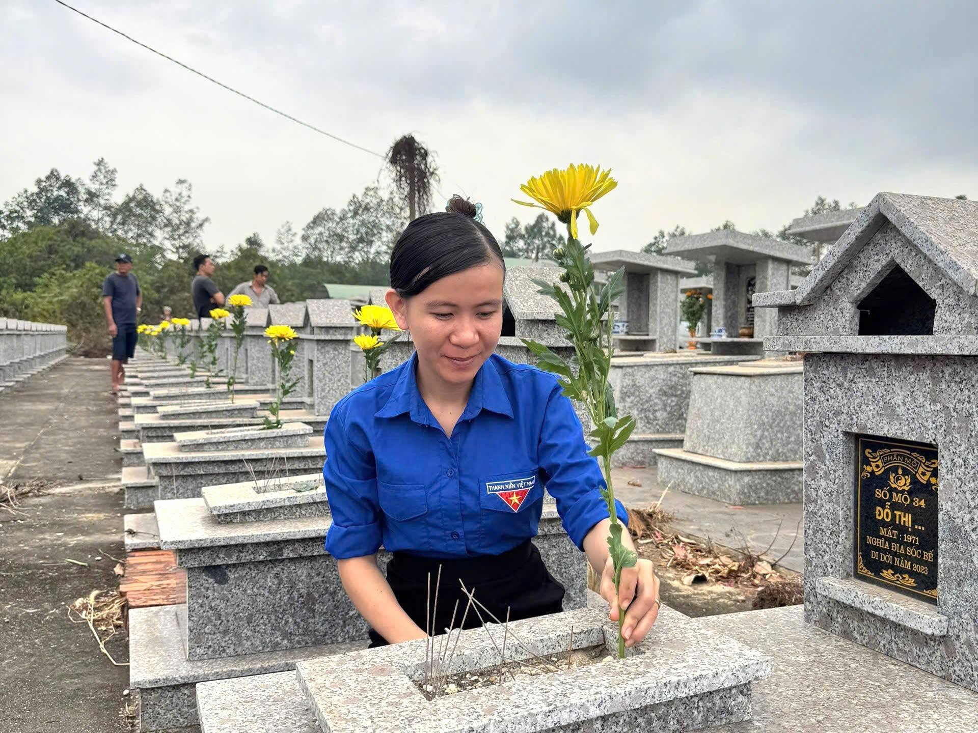 Giữa không gian tĩnh lặng của nghĩa trang, từng đoàn viên, thanh niên ân cần chỉnh trang lại các phần mộ, lau dọn bia đá, đặt những đóa hoa tươi và kính cẩn thắp nén hương thơm. Làn khói mỏng bay lên trong buổi sáng tháng Chạp như một nhịp cầu vô hình, kết nối những tấm lòng đang sống với những người đã khuất.