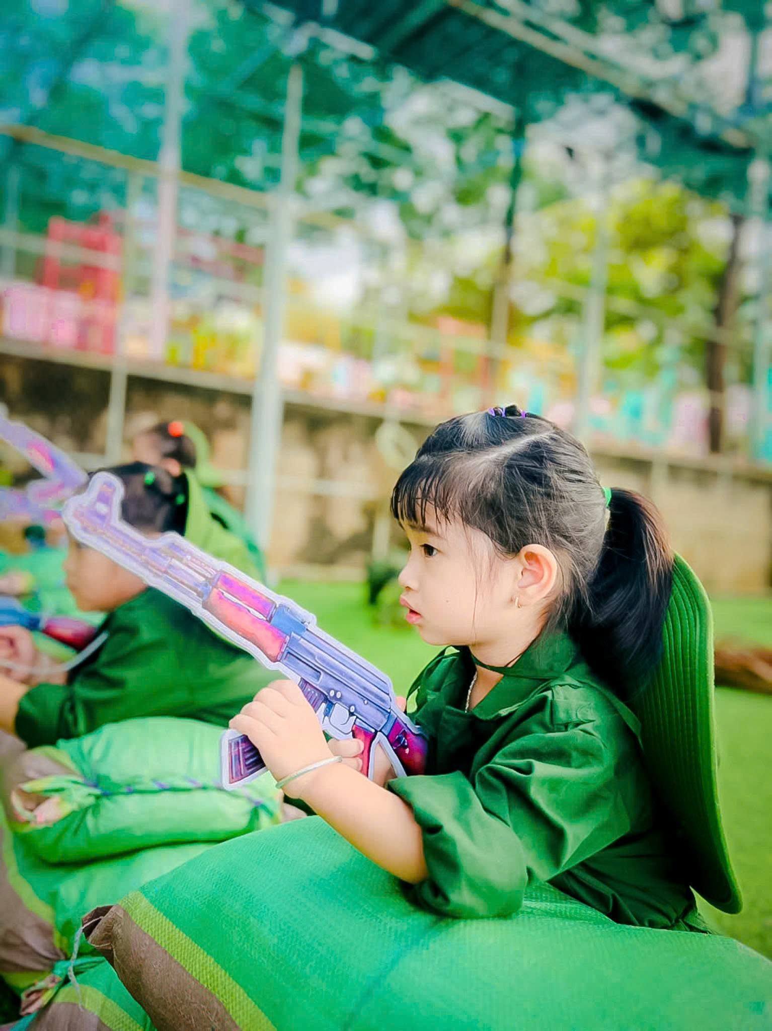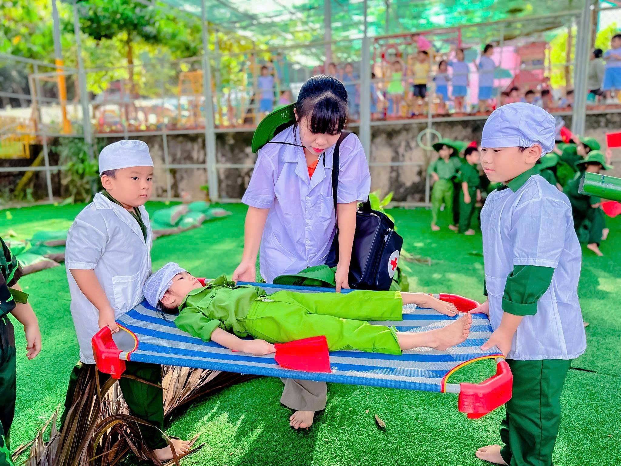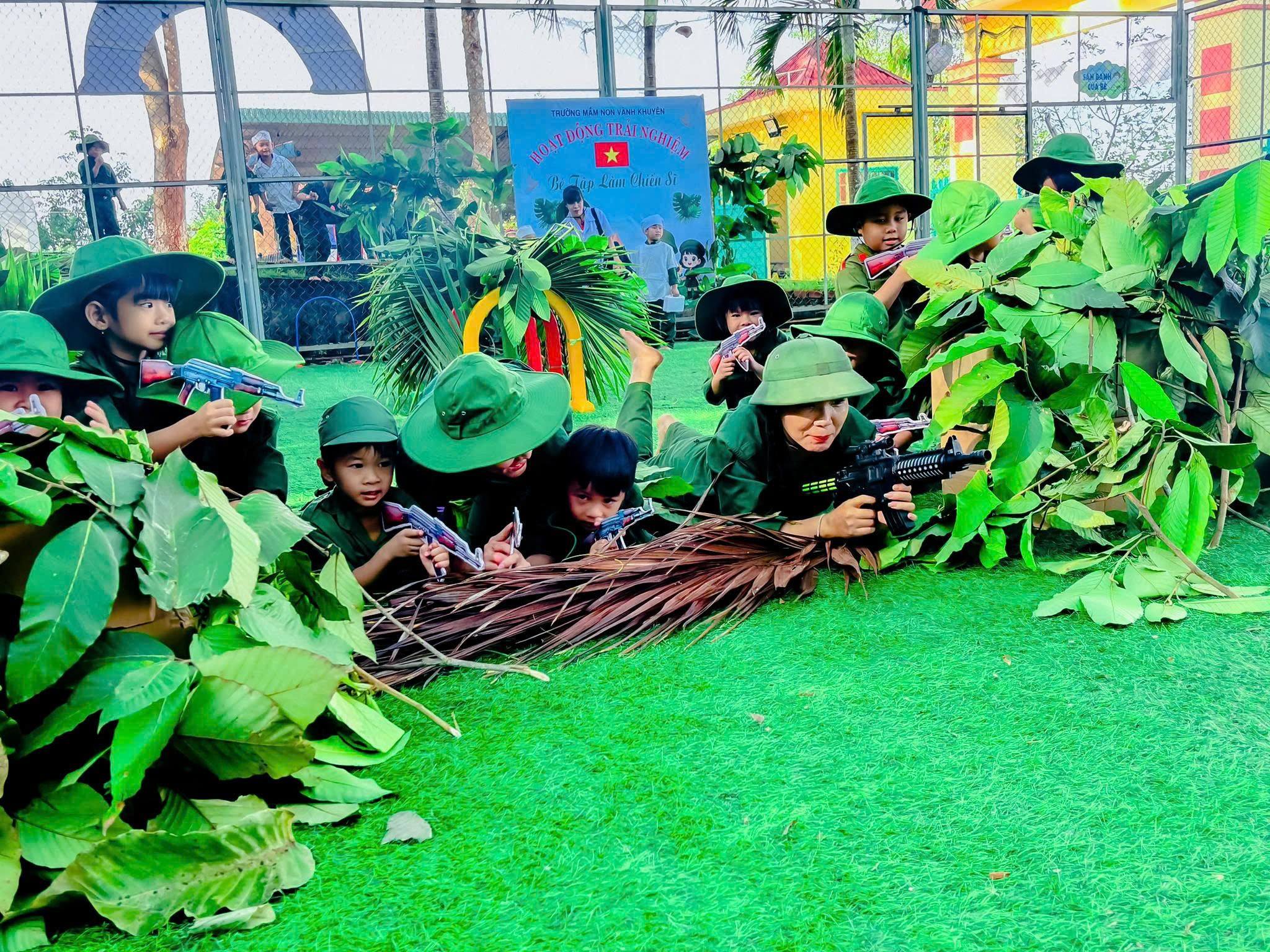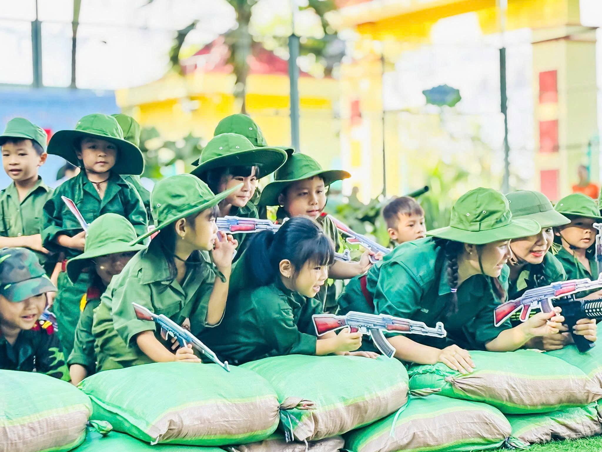 Trong bộ quân phục xanh thân thương, các bé hào hứng hóa thân thành những “chú bộ đội nhí”, tham gia hành quân, rèn luyện thể lực, tập đội hình, đội ngũ, xếp hàng ngay ngắn và các trò chơi mô phỏng hoạt động của người lính. Bên cạnh đó, trẻ còn được lắng nghe những câu chuyện giản dị về truyền thống vẻ vang của Quân đội Nhân dân Việt Nam anh hùng, qua đó hình thành ý thức kỷ luật, tinh thần đoàn kết, sự mạnh dạn và tự tin trong tập thể.