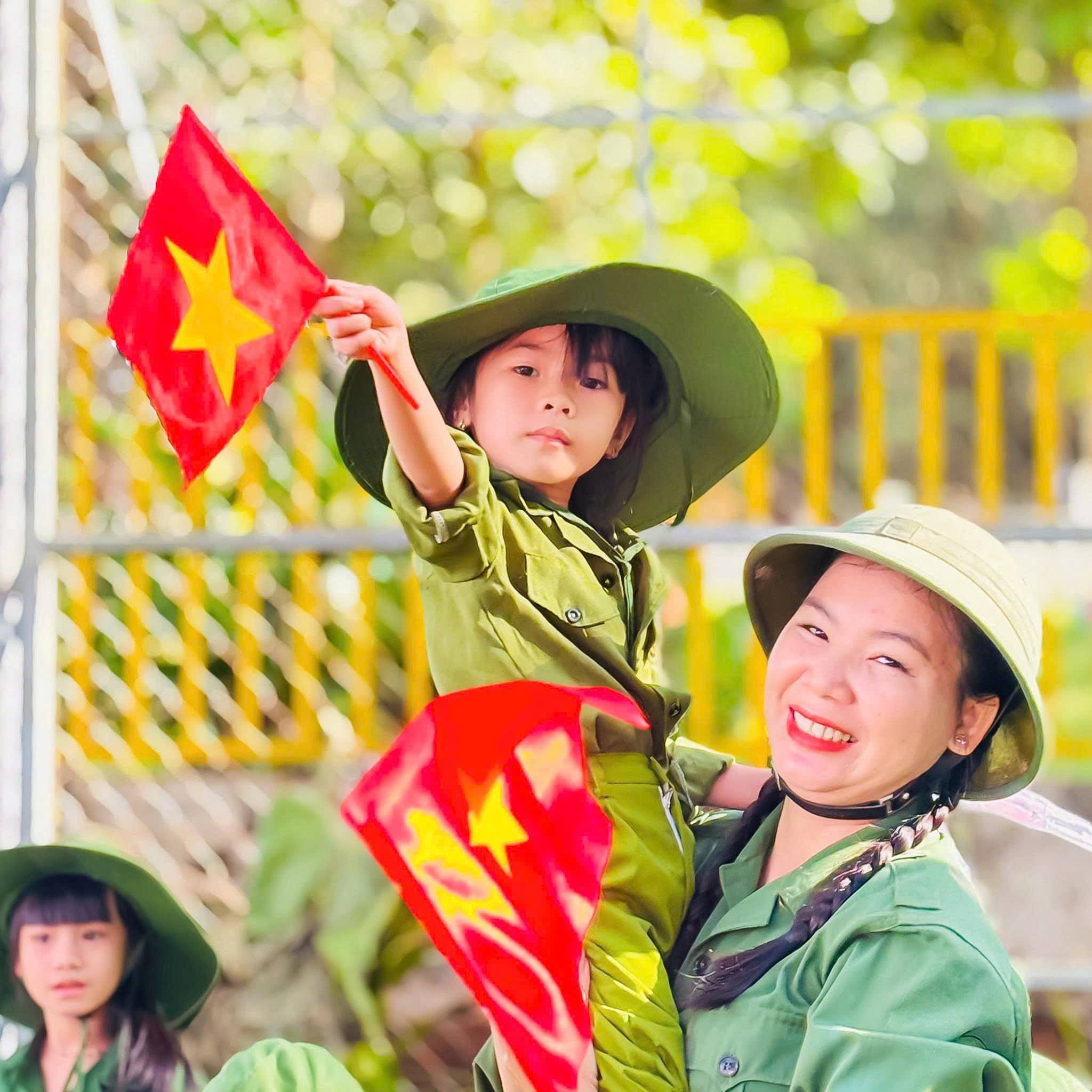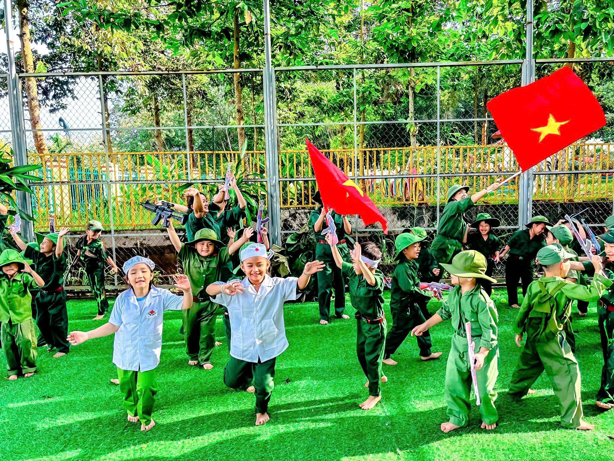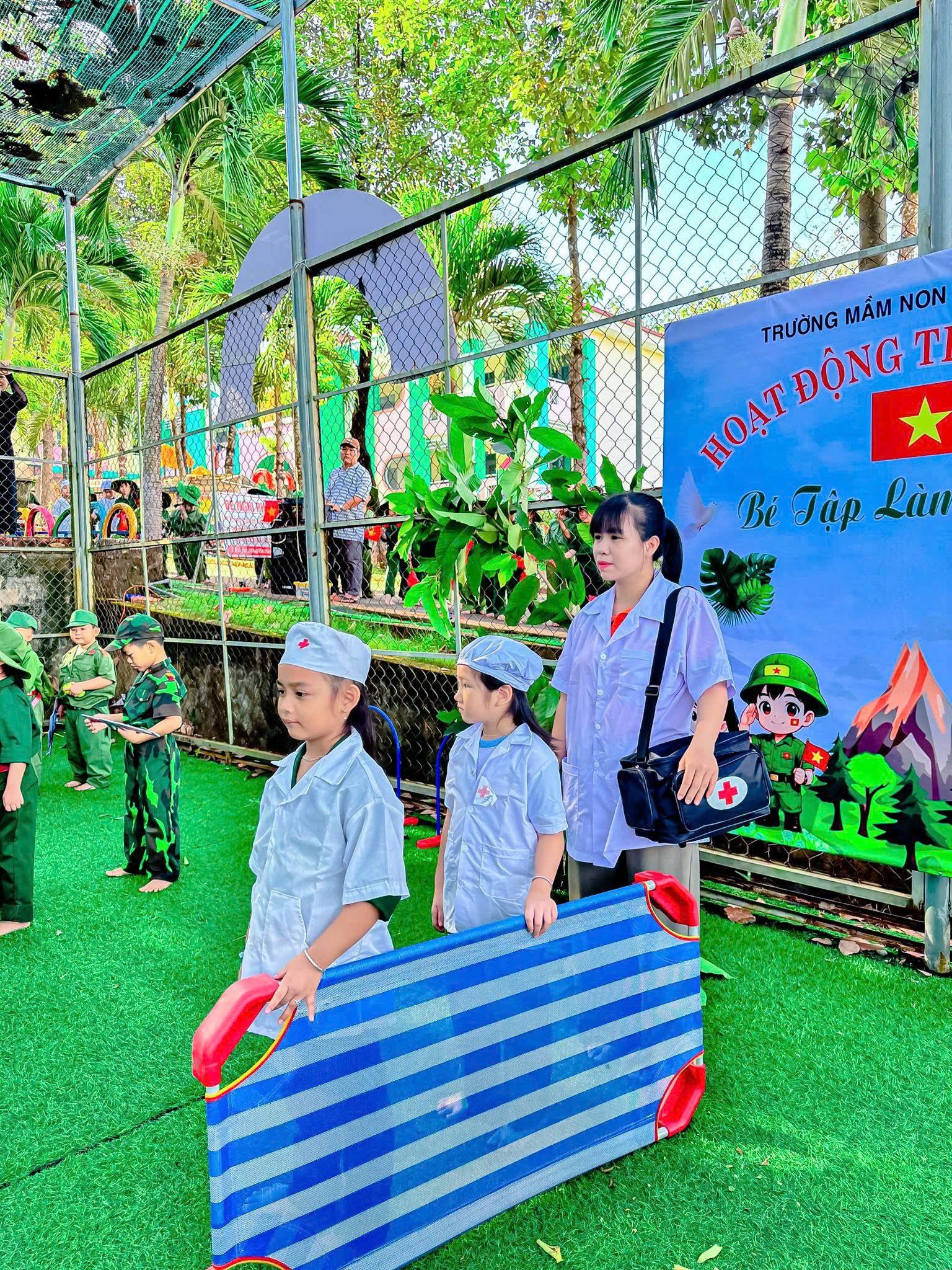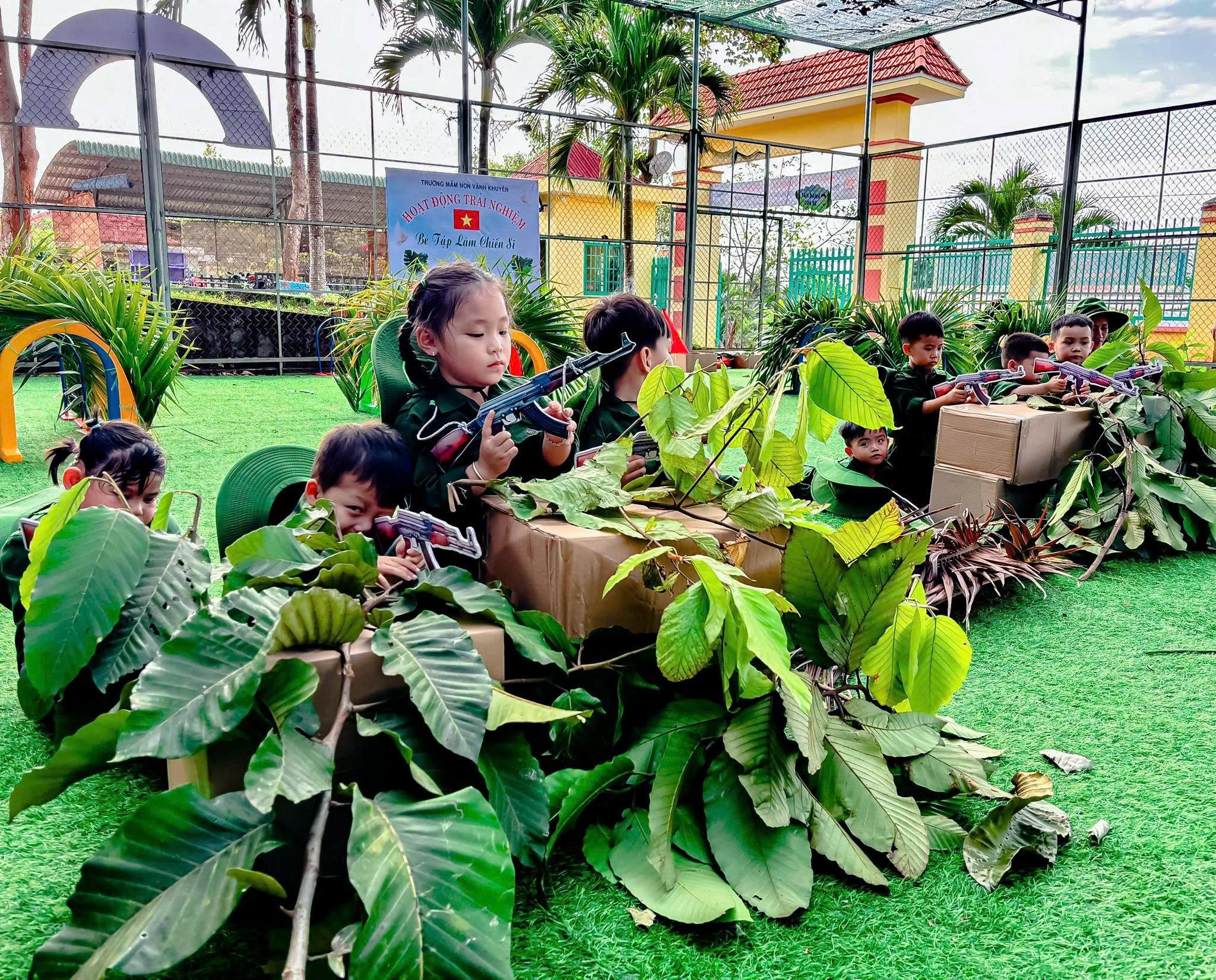 Trong bộ quân phục xanh thân thương, các bé hào hứng hóa thân thành những “chú bộ đội nhí”, tham gia hành quân, rèn luyện thể lực, tập đội hình, đội ngũ, xếp hàng ngay ngắn và các trò chơi mô phỏng hoạt động của người lính. Bên cạnh đó, trẻ còn được lắng nghe những câu chuyện giản dị về truyền thống vẻ vang của Quân đội Nhân dân Việt Nam anh hùng, qua đó hình thành ý thức kỷ luật, tinh thần đoàn kết, sự mạnh dạn và tự tin trong tập thể.