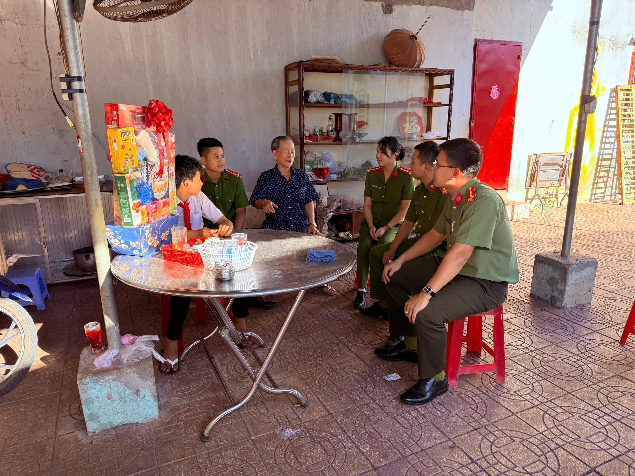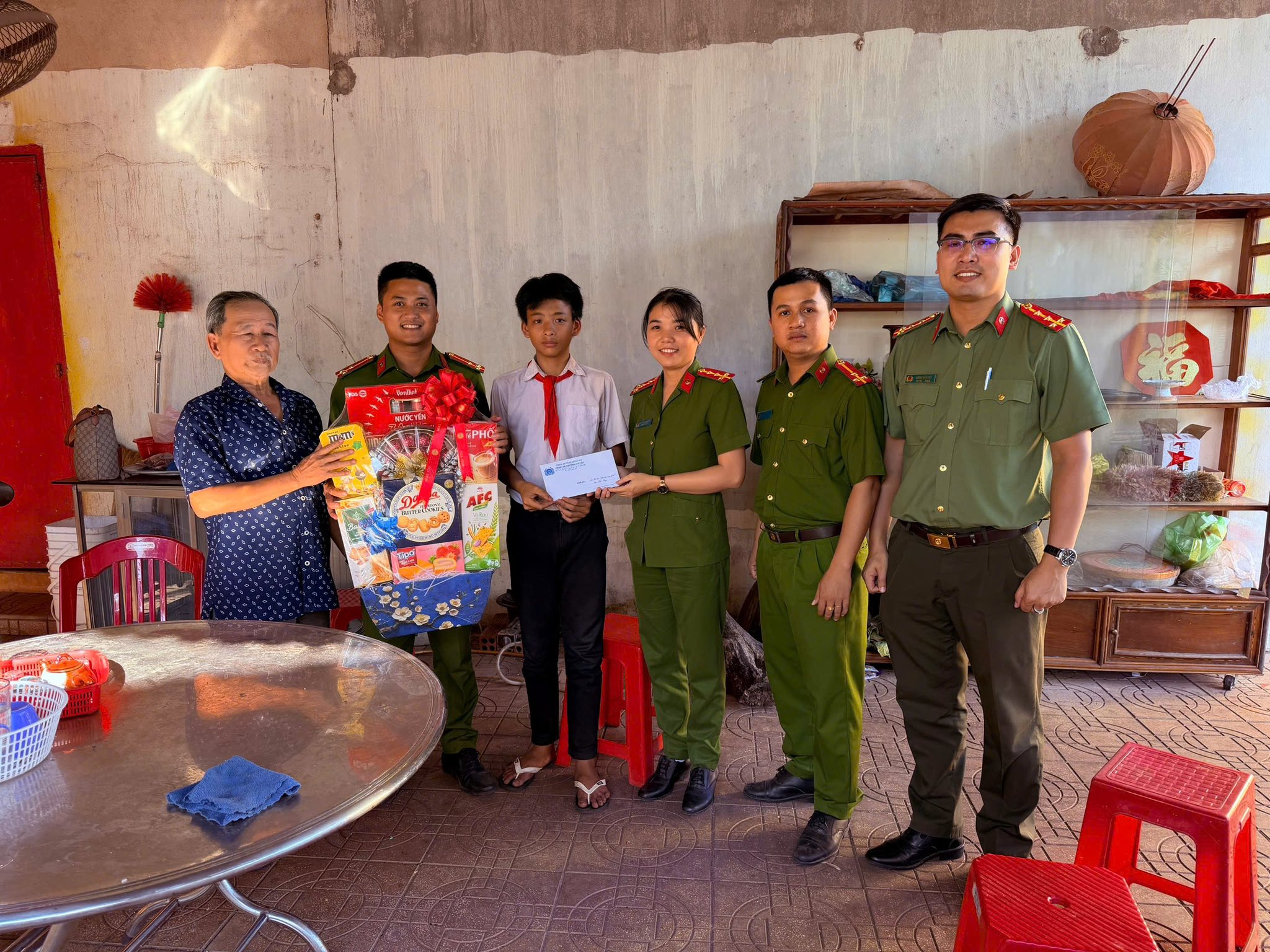 Tại buổi thăm hỏi, các đồng chí Đoàn viên Công an phường đã ân cần động viên, chia sẻ, nắm bắt tình hình học tập, sinh hoạt của em Hùng; đồng thời trao tặng những phần quà thiết thực, ý nghĩa nhân dịp Tết nguyên đán Bính Ngọ 2026.