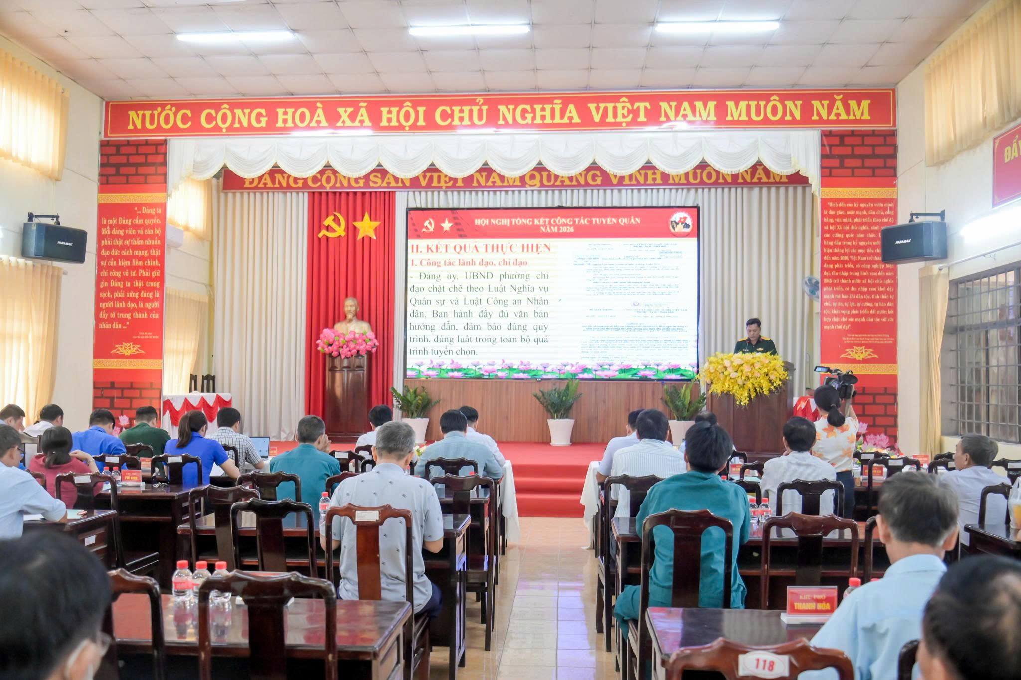 <span style="font-size:11pt"><span style="background:white"><span style="line-height:normal"><span style="font-family:Calibri,sans-serif"><span style="font-size:14.0pt"><span style="font-family:&#039;Times New Roman&#039;,serif"><span style="color:rgb(8, 8, 9);">Tại hội nghị, các đại biểu đã được nghe báo cáo kết quả thực hiện quy trình tuyển chọn, gọi công dân nhập ngũ năm 2026. Theo đó, công tác đăng ký, quản lý nguồn công dân trong độ tuổi sẵn sàng nhập ngũ được triển khai chặt chẽ, thường xuyên rà soát, cập nhật biến động, bảo đảm nắm chắc nguồn. Công tác xét duyệt về chính trị, chính sách được thực hiện đúng quy định, bảo đảm tiêu chuẩn, không để xảy ra sai sót. Đối với công tác sơ tuyển, khám tuyển sức khỏe nghĩa vụ quân sự, địa phương đã phối hợp tổ chức nghiêm túc, đúng quy trình, nâng cao chất lượng tuyển quân. Công tác bình cử công khai tại các khu phố được tổ chức dân chủ, tạo sự đồng thuận cao trong Nhân dân. Công tác hiệp đồng giao nhận quân được chuẩn bị chu đáo, phối hợp chặt chẽ với các đơn vị nhận quân.</span></span></span></span></span></span></span><br />
