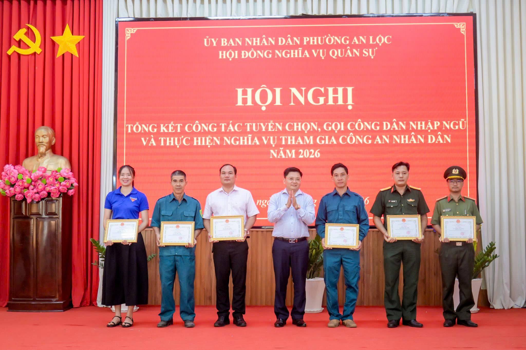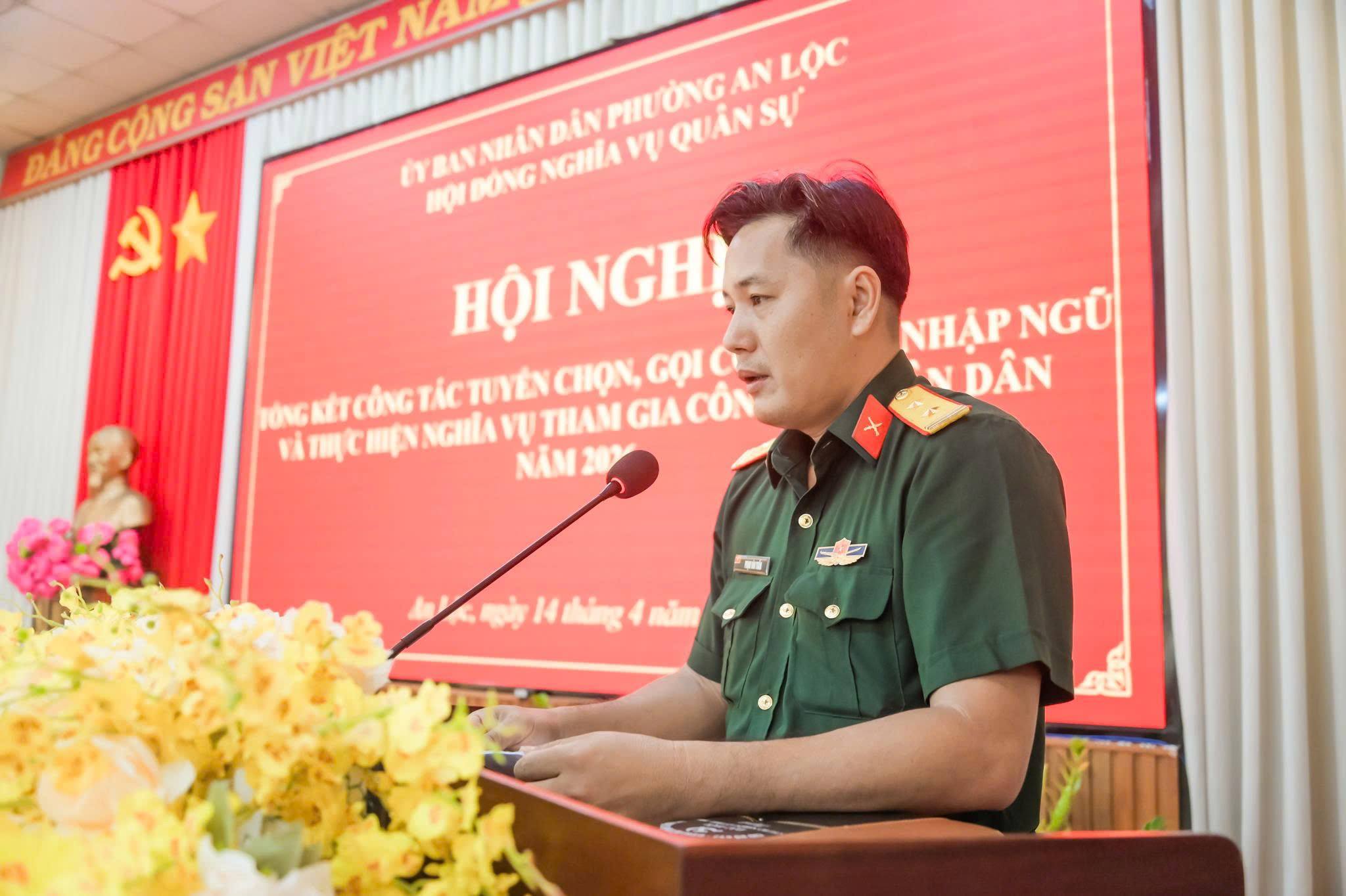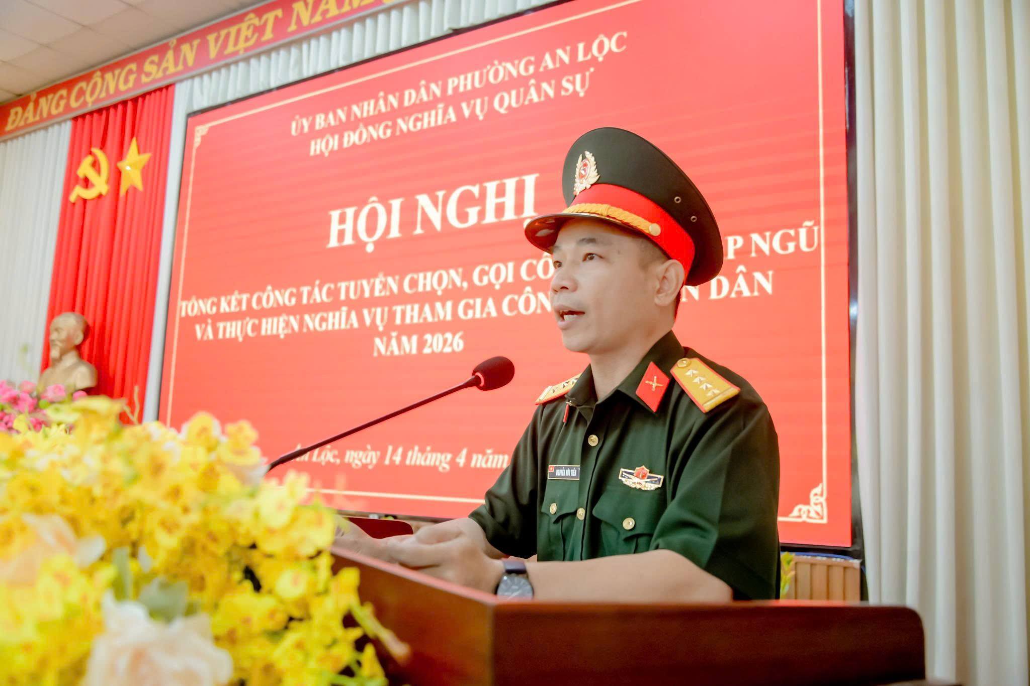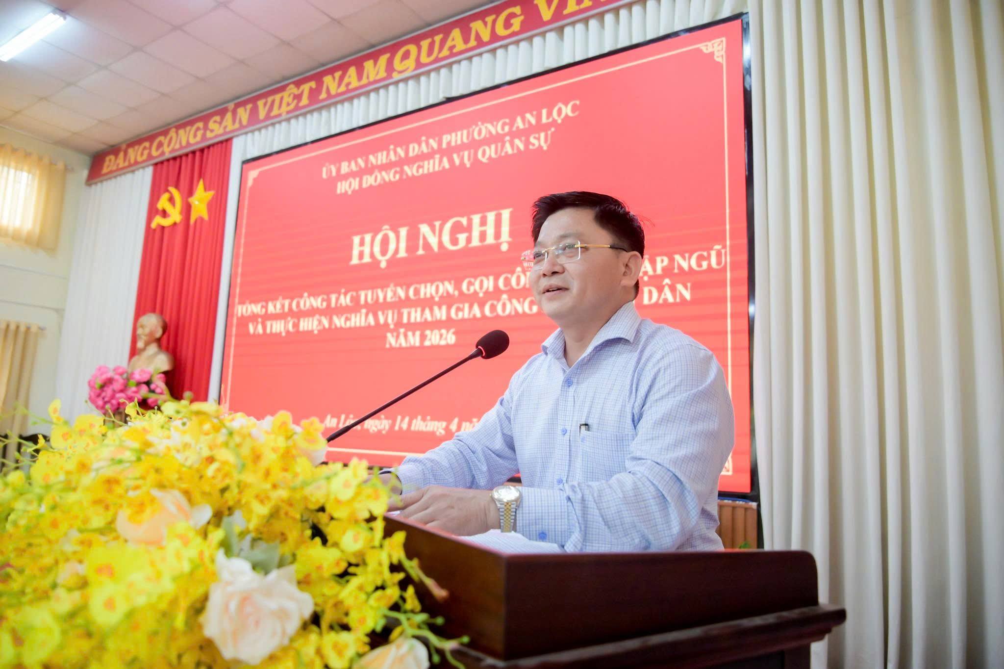 Ngày 14/4, Hội đồng Nghĩa vụ quân sự phường An Lộc tổ chức Hội nghị tổng kết công tác tuyển chọn, gọi công dân nhập ngũ năm 2026. Tham dự hội nghị có đồng chí Đỗ Minh Trung - Bí thư Đảng ủy, Chủ tịch HĐND phường; đồng chí Trần Thanh Long - Phó Bí thư Đảng ủy, Chủ tịch UBND phường, Chủ tịch Hội đồng Nghĩa vụ quân sự phường; Trung tá Phùng Văn Quang - đại diện Ban Chỉ huy Phòng thủ khu vực 4 cùng đại diện lãnh đạo Ban Chỉ huy Quân sự phường, các ban ngành, đoàn thể và đại diện các khu phố.