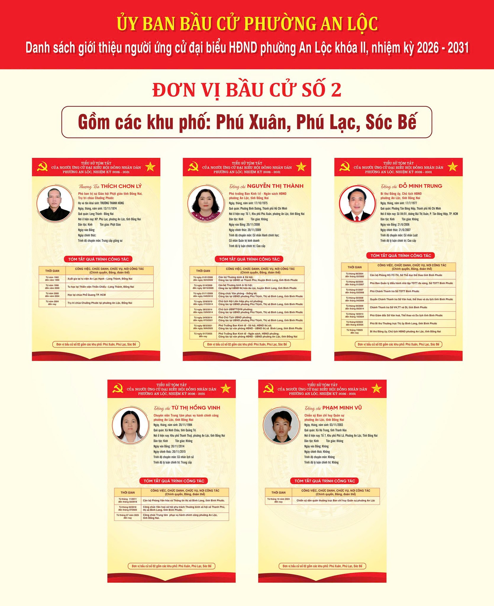 <span style="font-size:11pt"><span style="line-height:normal"><span style="font-family:Calibri,sans-serif"><span style="font-size:14.0pt"><span style="font-family:&#039;Times New Roman&#039;,serif"><span style="color:rgb(8, 8, 9);">Tại hội nghị, các ứng cử viên đã trình bày tiểu sử tóm tắt và chương trình hành động của mình trước cử tri. Trong đó, đồng chí Đỗ Minh Trung - Bí thư Đảng ủy, Chủ tịch HĐND phường An Lộc tham gia ứng cử đại biểu HĐND ở hai cấp gồm HĐND phường và HĐND tỉnh nhiệm kỳ 2026 - 2031. Chương trình hành động của các ứng cử viên tập trung vào việc phát huy vai trò của người đại biểu dân cử, lắng nghe và phản ánh kịp thời tâm tư, nguyện vọng của Nhân dân; quan tâm các vấn đề phát triển kinh tế - xã hội, bảo đảm an sinh và nâng cao chất lượng đời sống người dân trên địa bàn.</span></span></span></span></span></span><br />