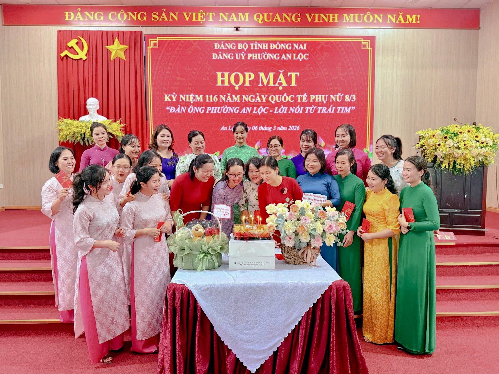 Ngày 8/3 hằng năm là dịp để tôn vinh những người phụ nữ - những người luôn mang trong mình sự dịu dàng, bền bỉ và giàu đức hy sinh. Trong gia đình, họ là người giữ gìn hơi ấm của mái nhà, là người mẹ, người vợ, người con luôn âm thầm chăm lo cho những người thân yêu. Trong công việc và các hoạt động xã hội, phụ nữ cũng không ngừng nỗ lực, thể hiện sự tận tâm, trách nhiệm và bản lĩnh, góp phần tạo nên những giá trị tốt đẹp cho cộng đồng. Hòa chung không khí ý nghĩa ấy, ngày 6/3, Đảng ủy phường An Lộc tổ chức chương trình họp mặt kỷ niệm 116 năm Ngày Quốc tế Phụ nữ (8/3/1910 – 8/3/2026) với chủ đề “Đàn ông phường An Lộc - Lời nói từ trái tim”. Tham dự chương trình có đồng chí Đỗ Minh Trung - Bí thư Đảng ủy, Chủ tịch HĐND phường cùng các đồng chí lãnh đạo, cán bộ, công chức và đoàn thể của phường.