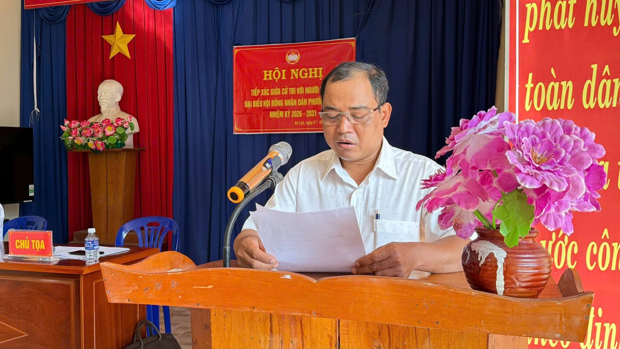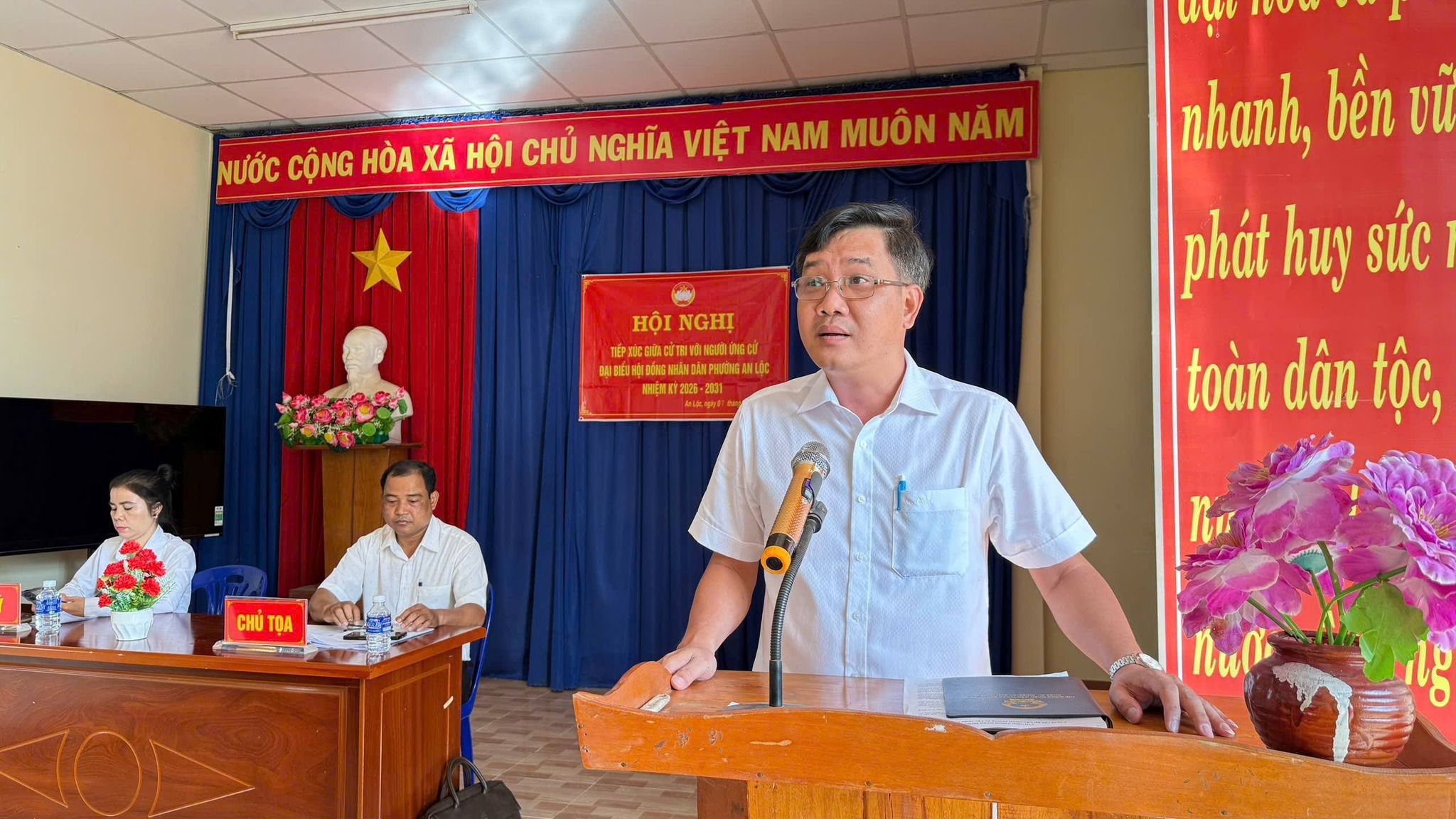 Sáng ngày 7/3, tại Hội trường khu phố Thanh Bình, các ứng cử viên đại biểu HĐND phường An Lộc nhiệm kỳ 2026 - 2031 thuộc Đơn vị bầu cử số 5 đã có buổi tiếp xúc cử tri, thực hiện quyền vận động bầu cử trước bà con cử tri các khu phố: Phố Lố, Sóc Giếng, Thanh Thiện và Thanh Bình. Đồng chí Điểu Hải - UV.BTV Đảng uỷ, Chủ tịch UBMTTQVN phường chủ trì Hội nghị.