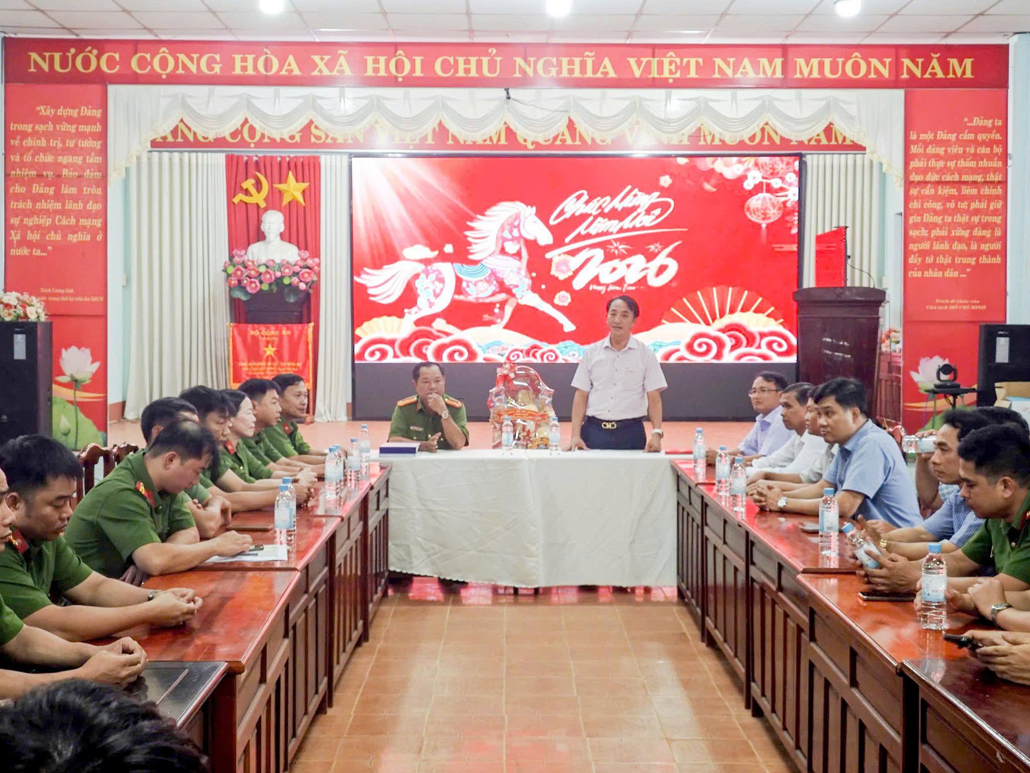 <span style="font-size:11pt"><span style="background:white"><span style="line-height:normal"><span style="font-family:Calibri,sans-serif"><span style="font-size:14.0pt"><span style="font-family:&#039;Times New Roman&#039;,serif"><span style="color:rgb(8, 8, 9);">Tại buổi thăm, đồng chí Đỗ Minh Trung ghi nhận tinh thần trách nhiệm, sự chủ động xây dựng kế hoạch bảo vệ địa bàn, phân công lực lượng trực 24/24 giờ, bảo đảm mọi hoạt động vui Xuân, đón Tết của Nhân dân diễn ra an toàn. Đồng chí yêu cầu tiếp tục nắm chắc tình hình cơ sở, tăng cường phối hợp giữa các lực lượng, kịp thời phát hiện và xử lý các hành vi vi phạm pháp luật; tuyệt đối không để xảy ra bị động, bất ngờ trong mọi tình huống. </span></span></span></span></span></span></span><br />