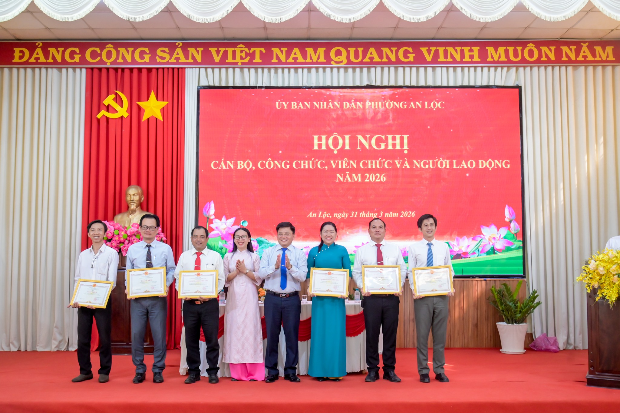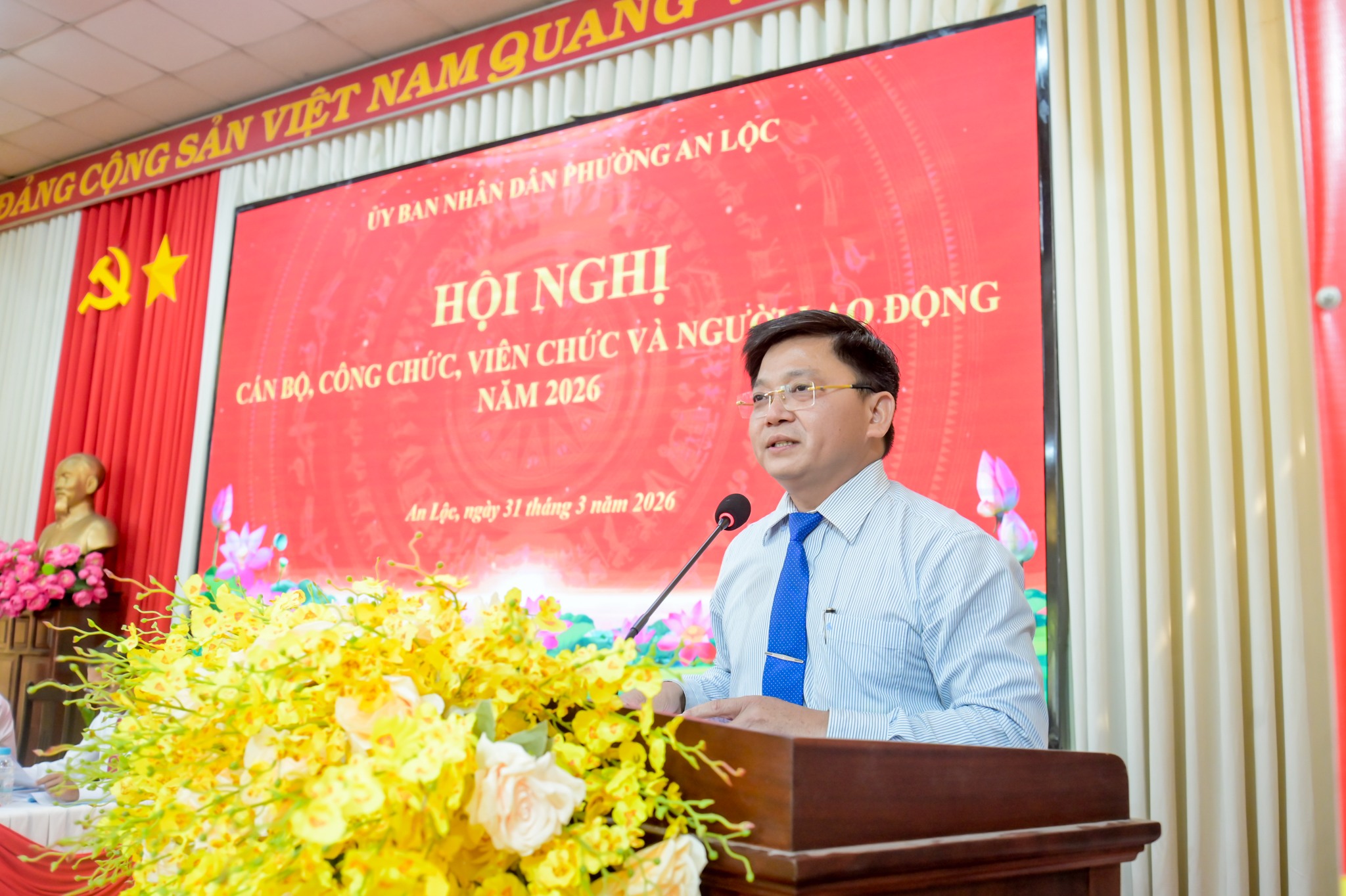 Ngày 31/3, UBND phường An Lộc tổ chức Hội nghị cán bộ, công chức, viên chức và người lao động năm 2026. Tham dự hội nghị có đồng chí Lê Thị Hồng Phấn - Phó Bí thư Thường trực Đảng ủy phường; đồng chí Trần Thanh Long - Phó Bí thư Đảng ủy, Chủ tịch UBND phường cùng các đồng chí lãnh đạo UBND, ban ngành đoàn thể, trưởng các phòng, ban, trung tâm và toàn thể cán bộ, công chức, viên chức, người lao động cơ quan.