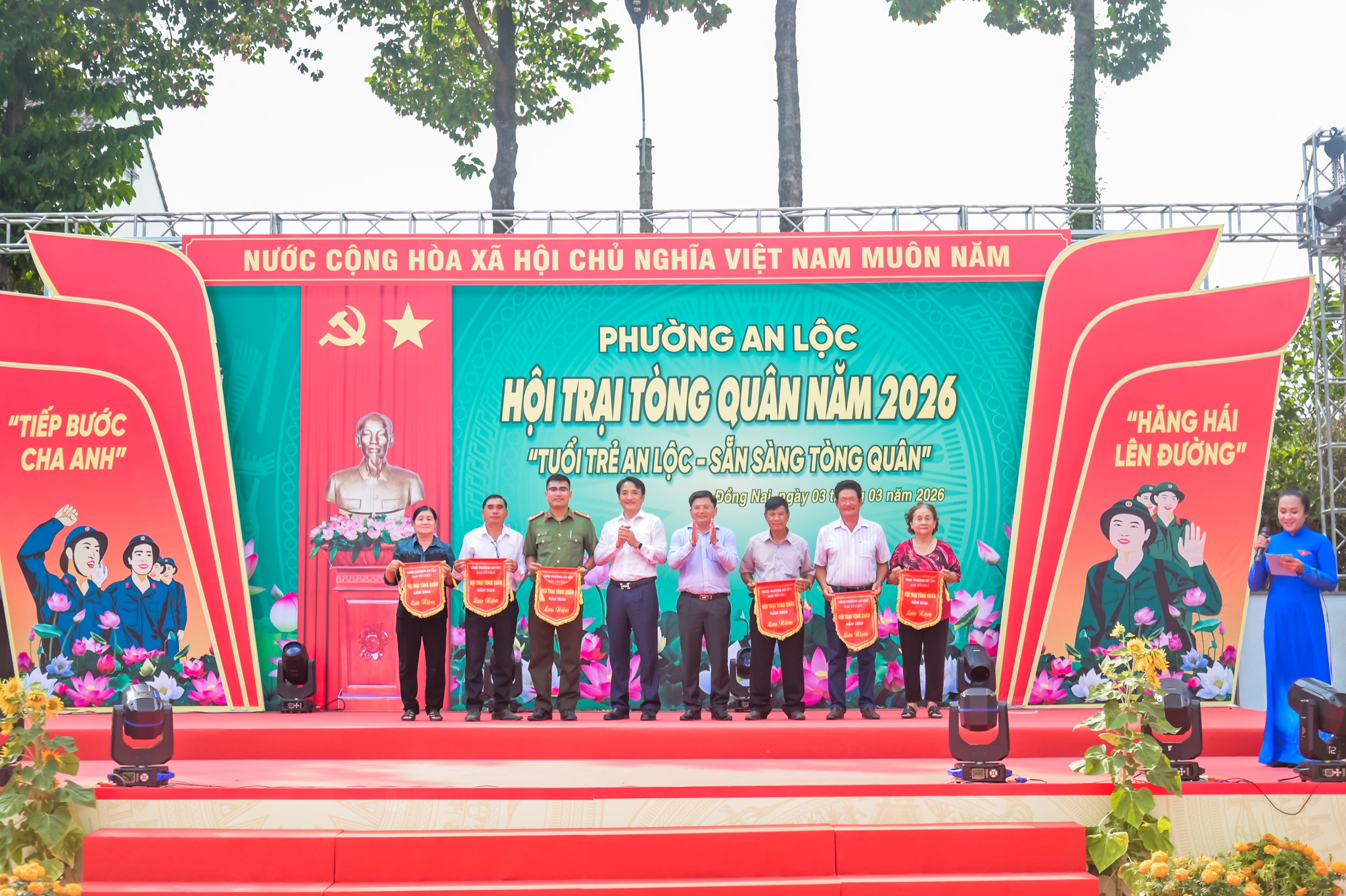 Ngày 3/3, phường An Lộc long trọng tổ chức khai mạc Hội trại tòng quân năm 2026 trong không khí trang nghiêm, sôi nổi, thể hiện khí thế của tuổi trẻ địa phương sẵn sàng lên đường thực hiện nghĩa vụ thiêng liêng với Tổ quốc. Dự chương trình có đồng chí Đỗ Minh Trung - Bí thư Đảng ủy, Chủ tịch HĐND phường; đồng chí Lê Thị Hồng Phấn - Phó Bí thư Thường trực Đảng ủy phường; đồng chí Trần Thanh Long - Phó Bí thư Đảng ủy, Chủ tịch UBND phường cùng các đồng chí trong Ban Thường vụ Đảng ủy, HĐND, UBND, Ủy ban MTTQ Việt Nam phường, các ban ngành, đoàn thể, lực lượng công an, quân sự, cán bộ khu phố và đông đảo các tân binh thực hiện nghĩa vụ quân sự, nghĩa vụ công an nhân dân năm 2026.