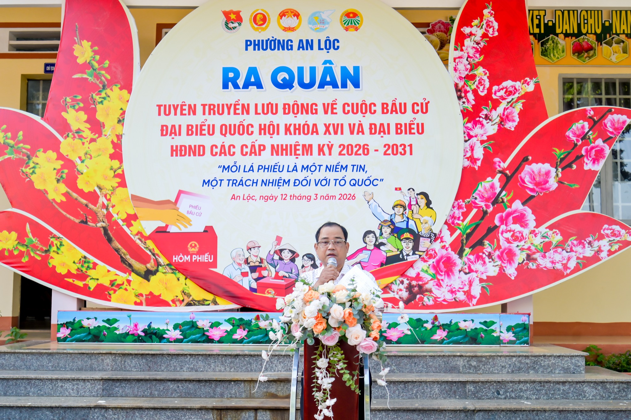 Sáng ngày 12/3, tại trụ sở Đảng ủy phường An Lộc, Ủy ban Mặt trận Tổ quốc Việt Nam phường phối hợp với Đoàn Thanh niên Cộng sản Hồ Chí Minh, Hội Liên hiệp Phụ nữ Việt Nam, Hội Nông dân và Hội Cựu chiến binh Việt Nam phường tổ chức lễ ra quân tuyên truyền lưu động về cuộc bầu cử đại biểu Quốc hội khóa XVI và đại biểu HĐND các cấp nhiệm kỳ 2026 - 2031. Tham dự chương trình có các đồng chí lãnh đạo Đảng ủy, HĐND, UBND, Ủy ban MTTQ Việt Nam phường; đại diện các ban, ngành, đoàn thể cùng đông đảo đoàn viên, hội viên tham gia hưởng ứng. Buổi ra quân nhằm tăng cường công tác thông tin, phổ biến sâu rộng đến Nhân dân về ý nghĩa, tầm quan trọng của cuộc bầu cử; góp phần nâng cao nhận thức và trách nhiệm của cử tri trong việc thực hiện quyền, nghĩa vụ công dân.