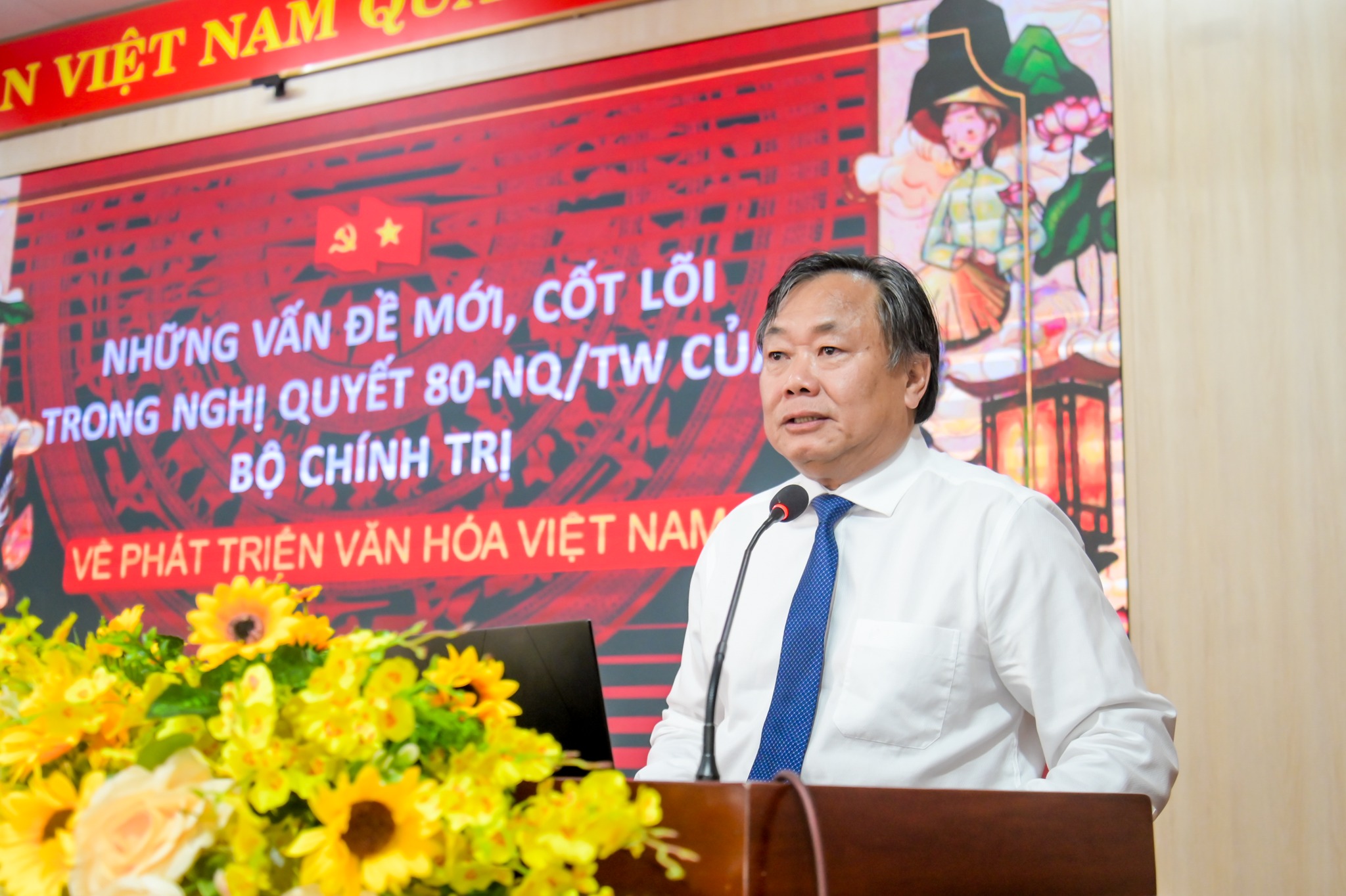 <span style="font-size:11pt"><span style="background:white"><span style="line-height:normal"><span style="font-family:Calibri,sans-serif"><span style="font-size:14.0pt"><span style="font-family:&#039;Times New Roman&#039;,serif"><span style="color:rgb(8, 8, 9);">Tại hội nghị, các đại biểu được nghe PGS, TS Nguyễn Quốc Dũng - Ủy viên Hội đồng Lý luận Trung ương, nguyên Giám đốc Học viện Chính trị khu vực II báo cáo chuyên đề về Nghị quyết số 80-NQ/TW ngày 07/01/2026 của Bộ Chính trị về phát triển văn hóa Việt Nam trong giai đoạn mới. Nghị quyết xác định văn hóa là nền tảng tinh thần của xã hội, là sức mạnh nội sinh quan trọng cho sự phát triển bền vững của đất nước; đặt mục tiêu tiếp tục xây dựng nền văn hóa Việt Nam tiên tiến, đậm đà bản sắc dân tộc; chú trọng phát triển con người toàn diện; bảo tồn và phát huy giá trị di sản văn hóa; phát triển các ngành công nghiệp văn hóa, từng bước nâng cao vị thế và sức mạnh mềm của văn hóa Việt Nam trong thời kỳ hội nhập.</span></span></span></span></span></span></span><br />