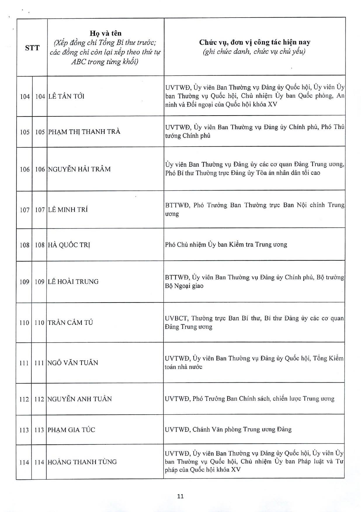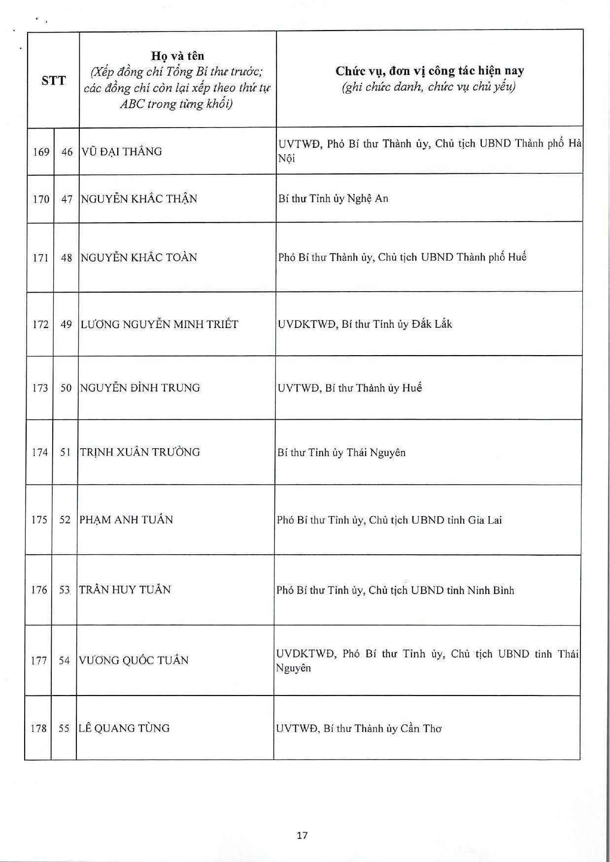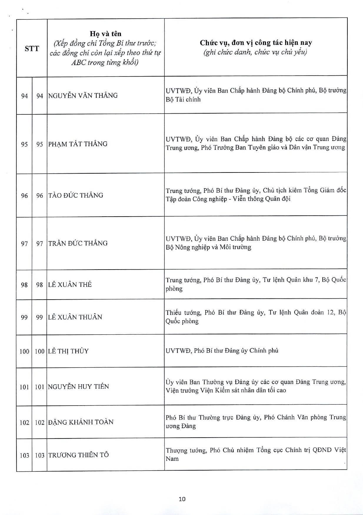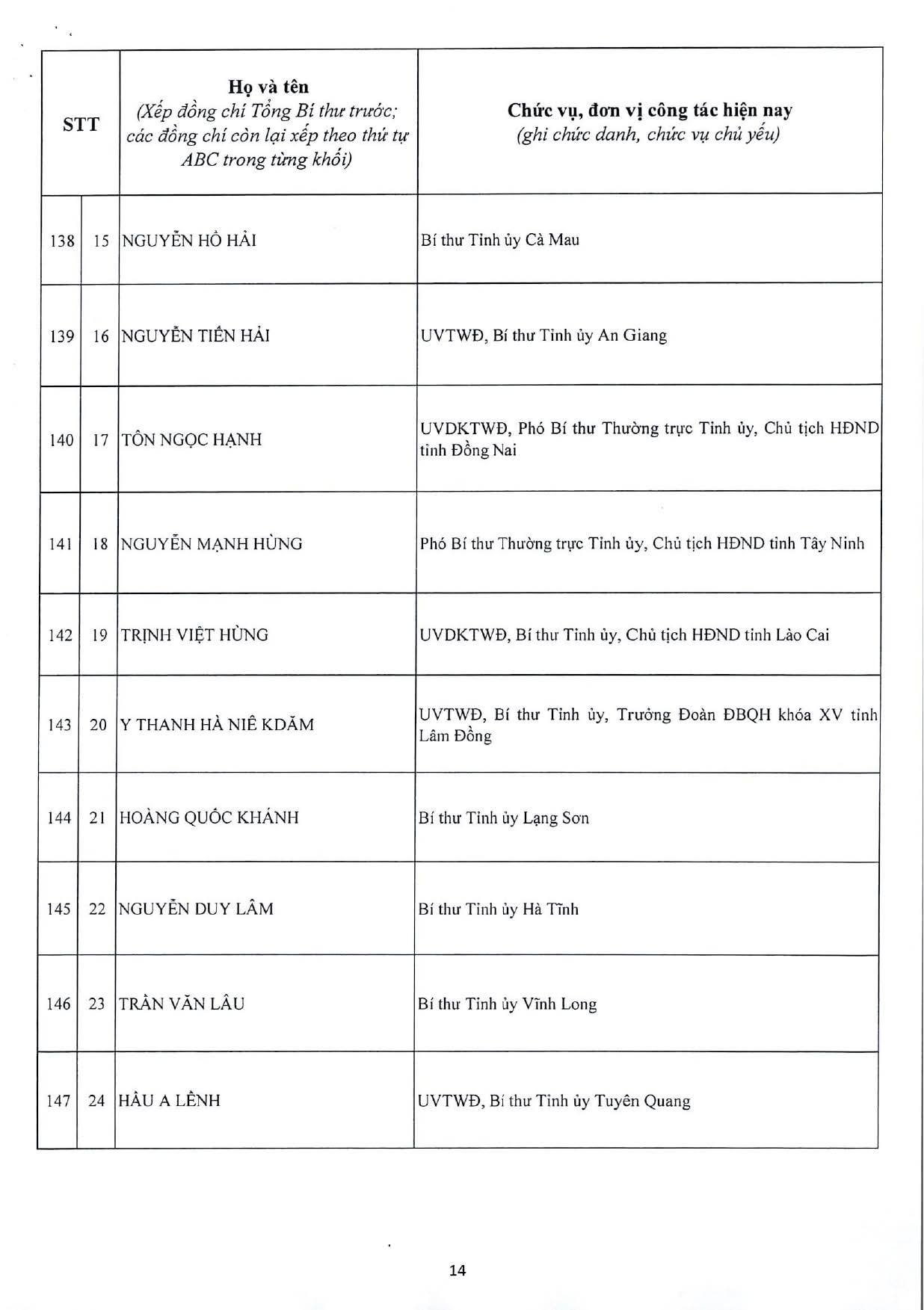 Danh sách 180 Ủy viên chính thức Ban Chấp hành Trung ương Đảng khóa XIV: