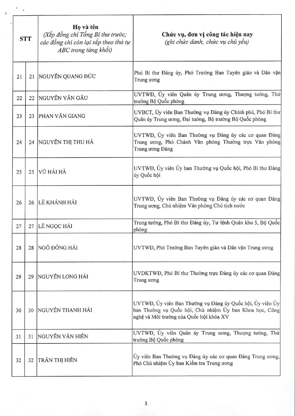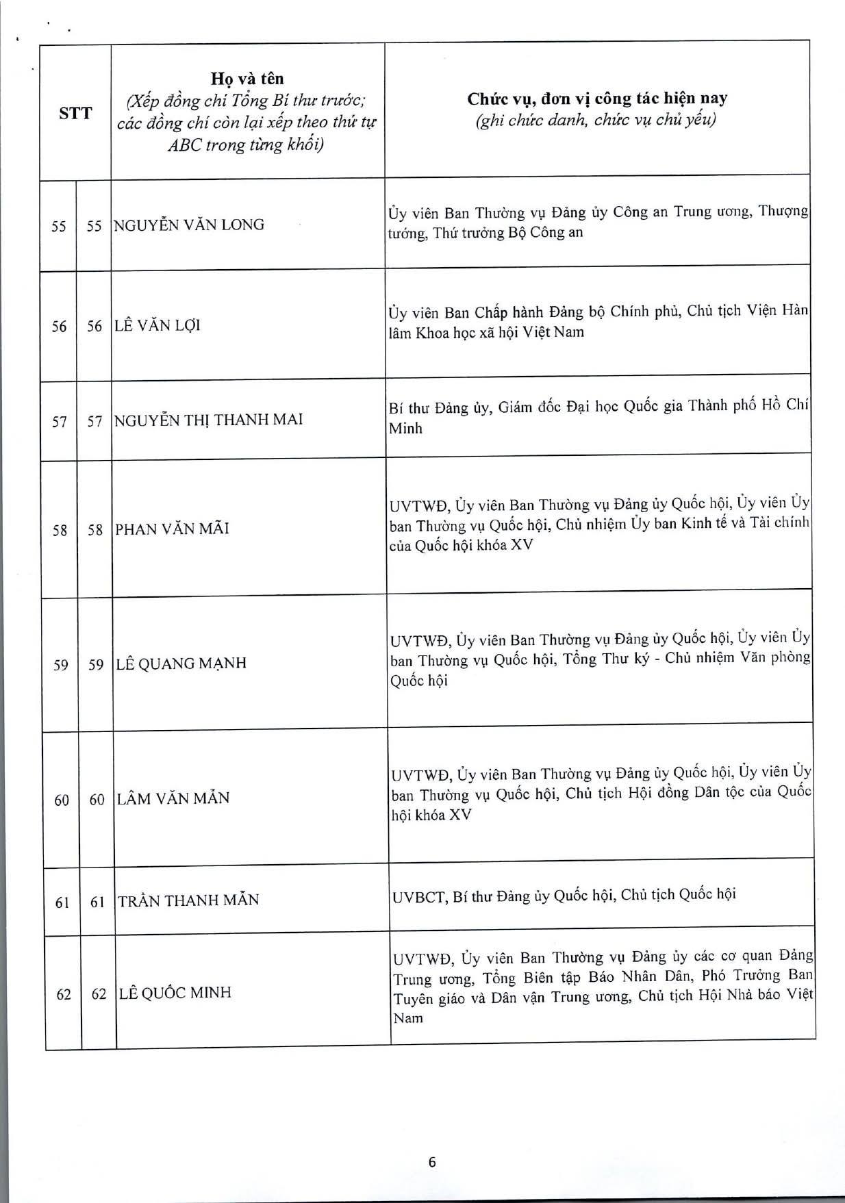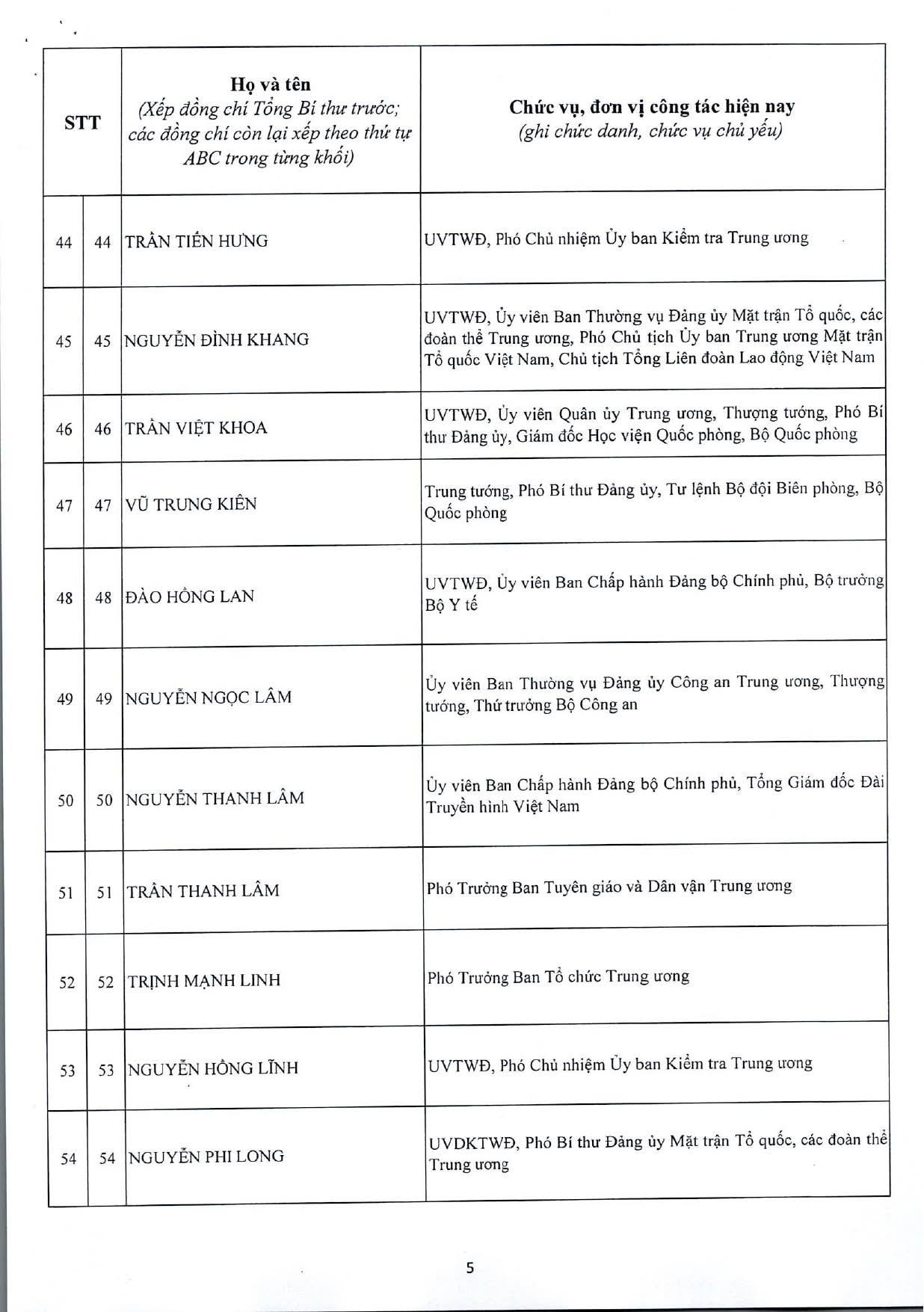 Danh sách 180 Ủy viên chính thức Ban Chấp hành Trung ương Đảng khóa XIV: