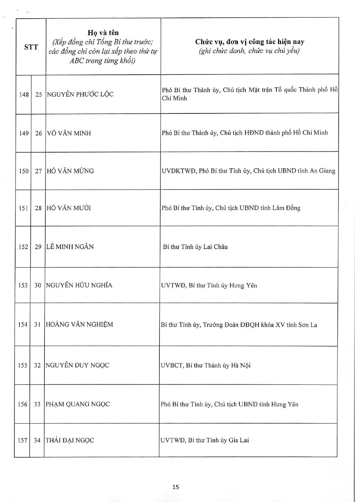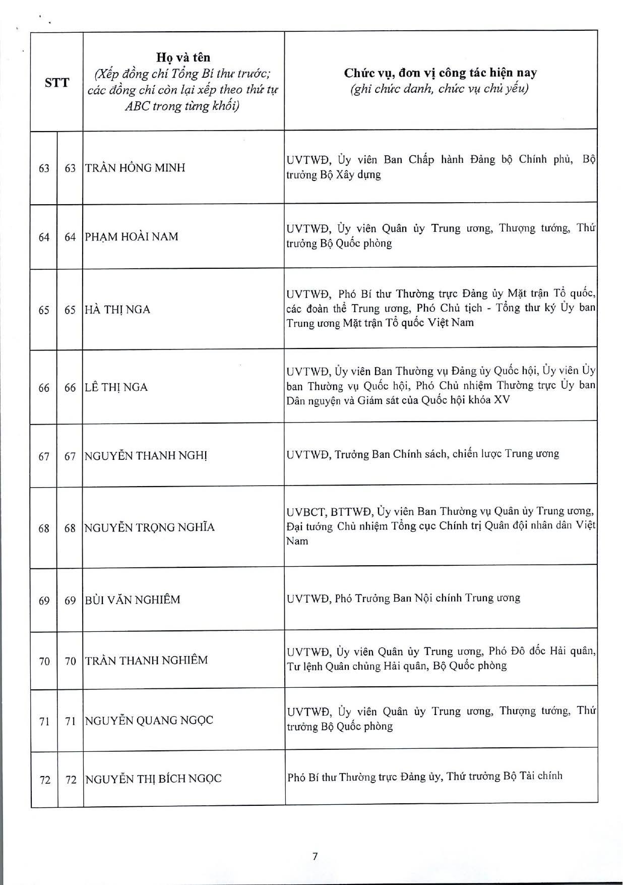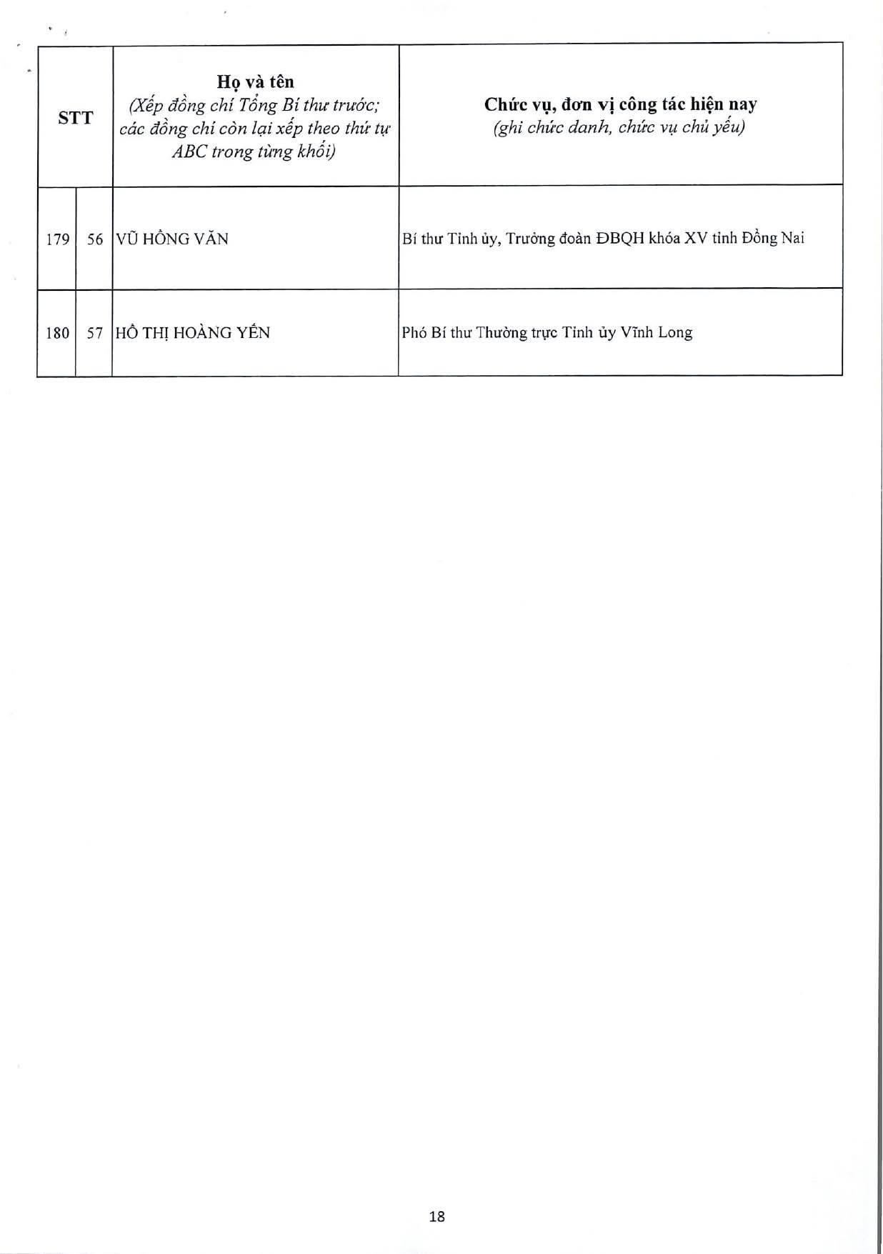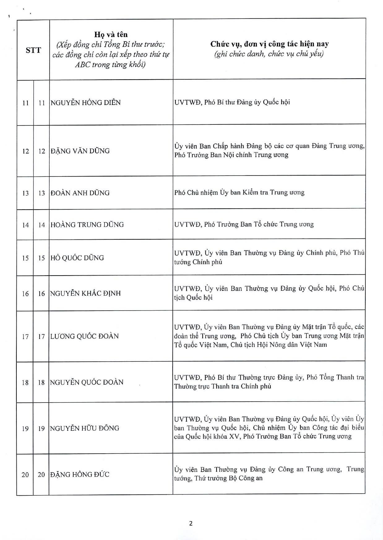 Danh sách 180 Ủy viên chính thức Ban Chấp hành Trung ương Đảng khóa XIV: