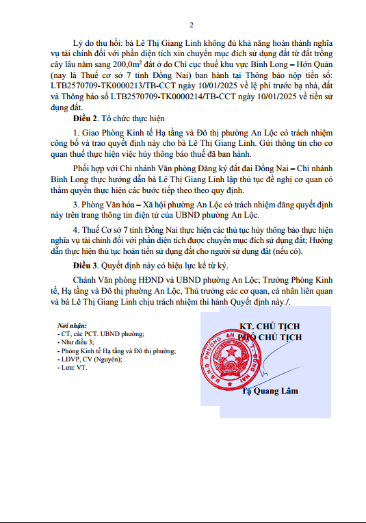 QĐ thu hồi Quyết định cho phép chuyển mục đích sử dụng đất Lê Thị Giang Linh.