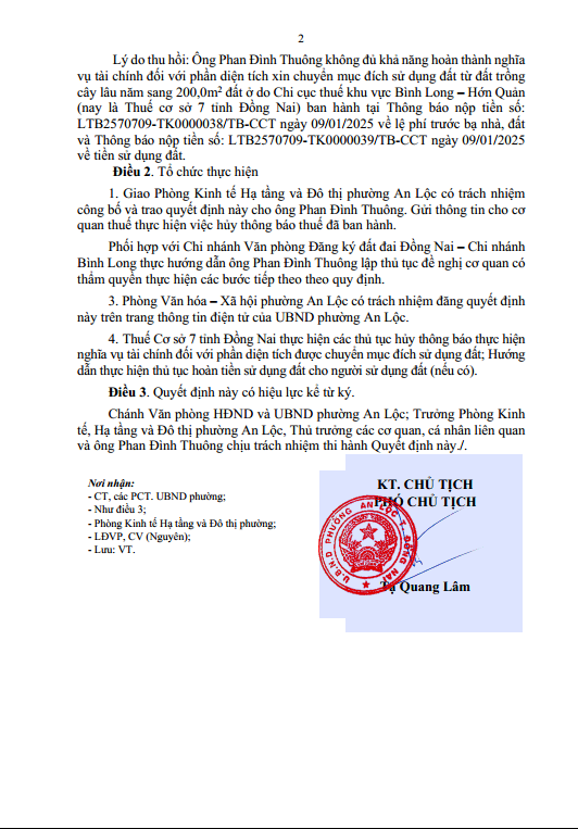Quyết định thu hồi Quyết định cho phép chuyển mục đích sử dụng đất Phan Đình Thuông