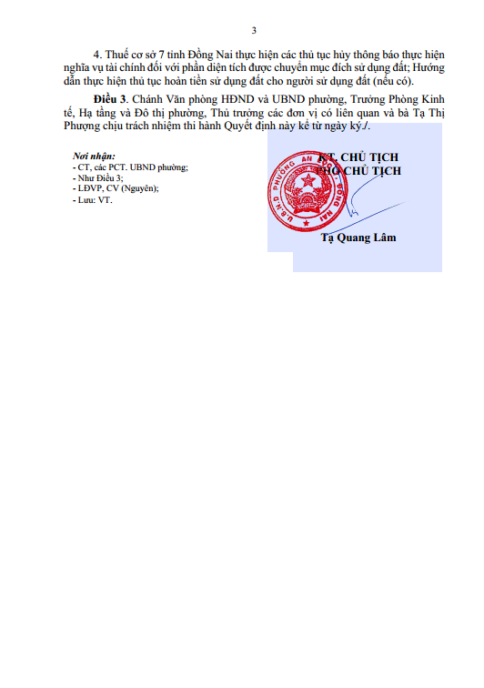 Quyết định thu hồi Quyết định cho phép chuyển mục đích sử dụng đất - Tạ Thị Phượng (QĐ 359):