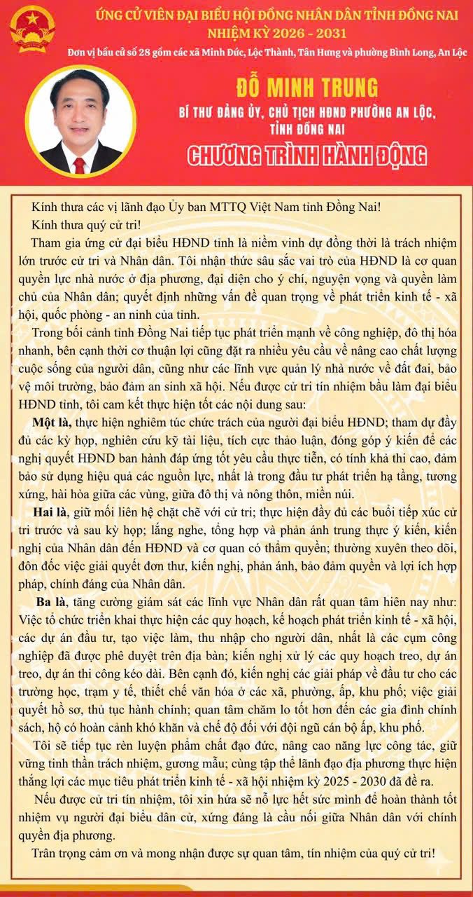 Xin trân trọng giới thiệu tiểu sử tóm tắt và Chương trình hành động của Ứng cử viên ứng cử đại biểu HĐND tỉnh Đỗ Minh Trung. Với quá trình rèn luyện, cống hiến liên tục qua các lĩnh vực, ứng cử viên thể hiện bản lĩnh chính trị vững vàng, tinh thần trách nhiệm cao và sự gắn bó với Nhân dân.