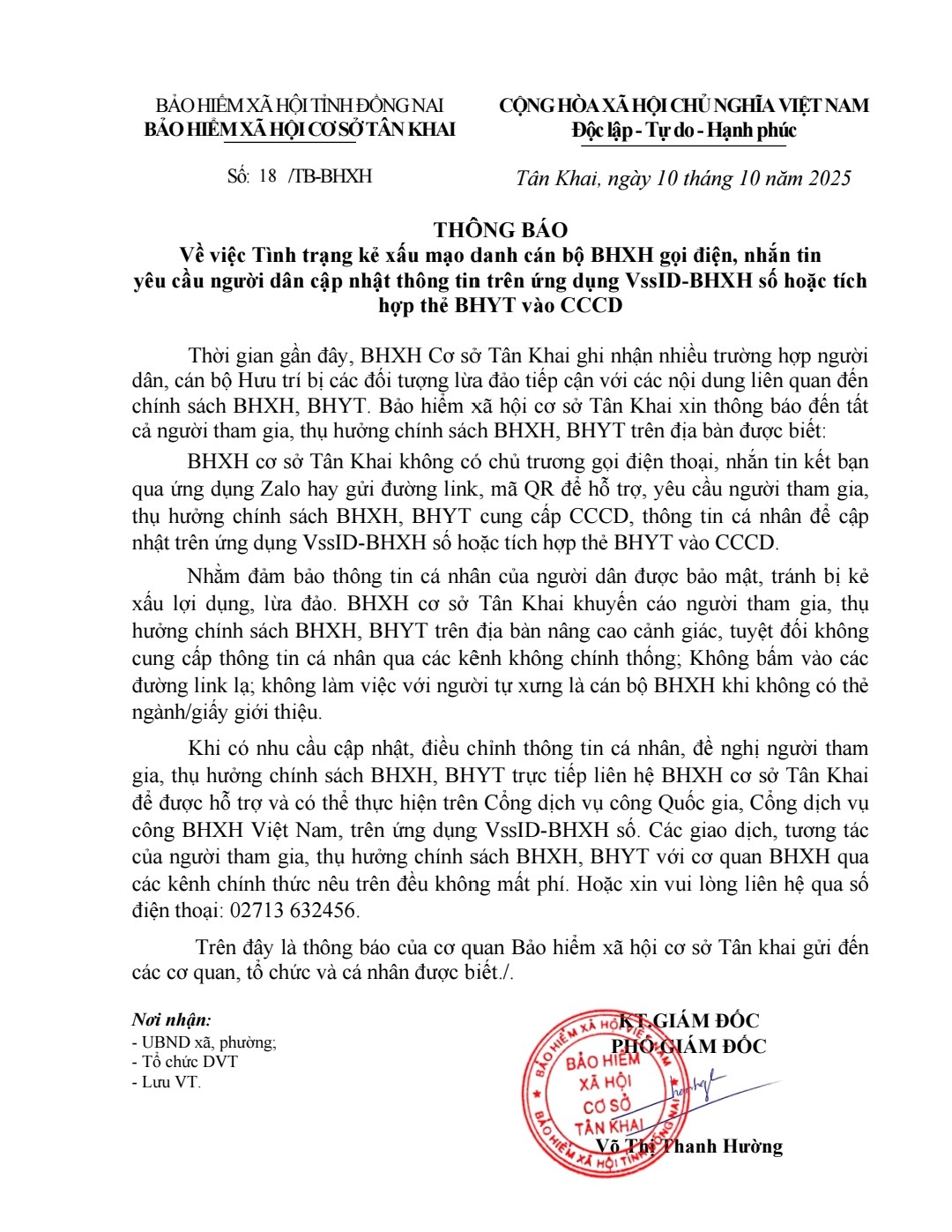 Thời gian gần đây, BHXH Cơ sở Tân Khai ghi nhận nhiều trường hợp người dân, cán bộ Hưu trí bị các đối tượng lừa đảo tiếp cận với các nội dung liên quan đến chính sách BHXH, BHYT.