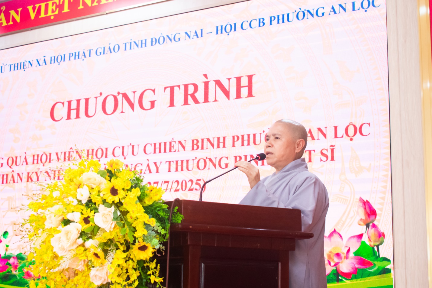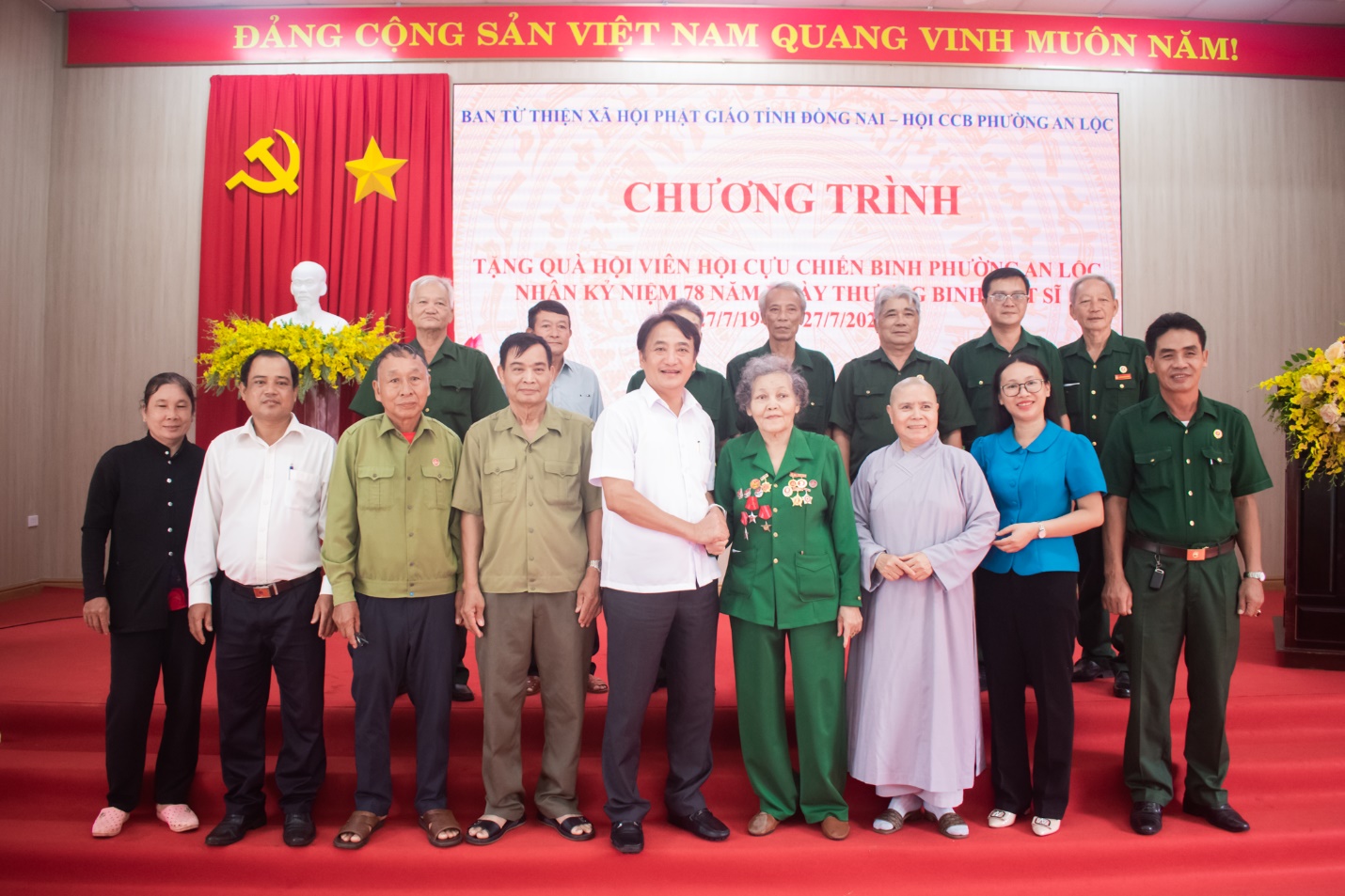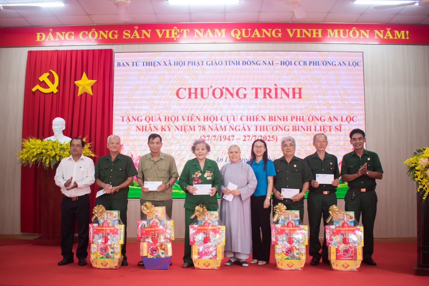 Ngày 21/7, Ban Từ thiện xã hội phật giáo tỉnh Đồng Nai phối hợp Hội Cựu Chiến binh (CCB) phường An Lộc tổ chức trao quà cho hội viên Hội CCB phường An Lộc nhân kỷ niệm 78 năm ngày Thương binh - Liệt sĩ ( 27/7/1947 – 27/7/2025). Về dự chương trình trao quà có Bí thư Đảng ủy, Chủ tịch HĐND phường Đỗ Minh Trung; Phó Bí thư Thường trực Đảng uỷ phường Lê Thị Hồng Phấn;  Ni sư Thích Nữ Như Hiền - Phó Ban Trị sự, Trưởng Ban Từ thiện Xã hội Phật giáo tỉnh Đồng Nai cùng đông đảo cựu chiến binh trên địa bàn phường An Lộc.